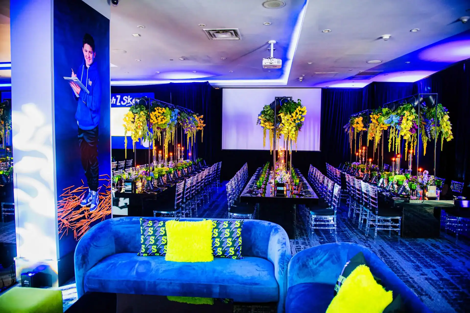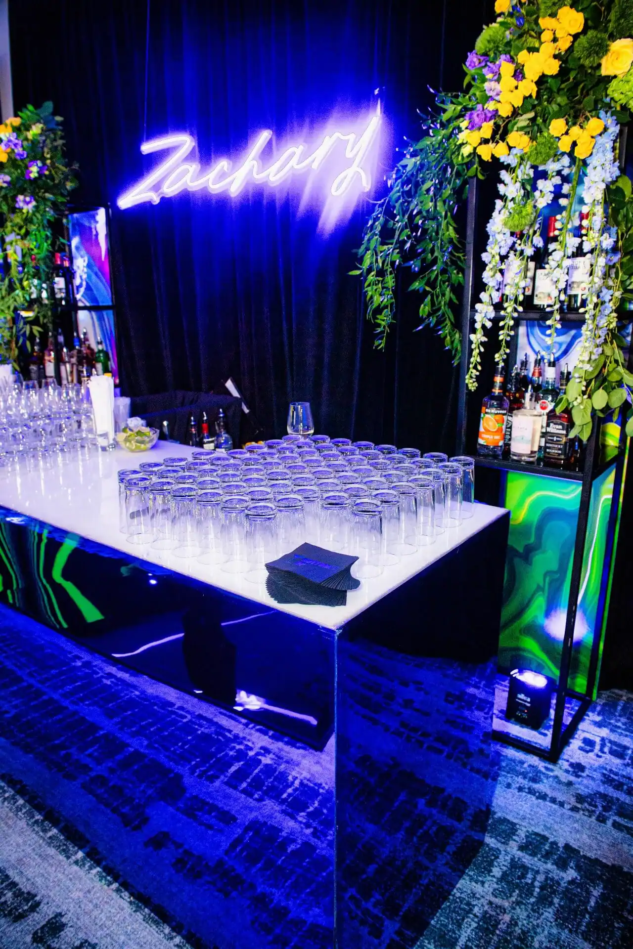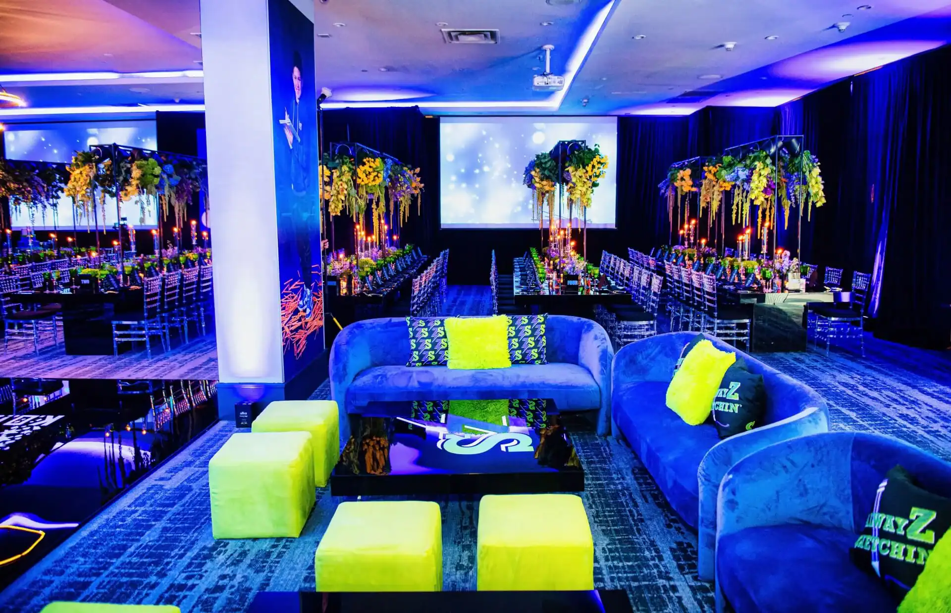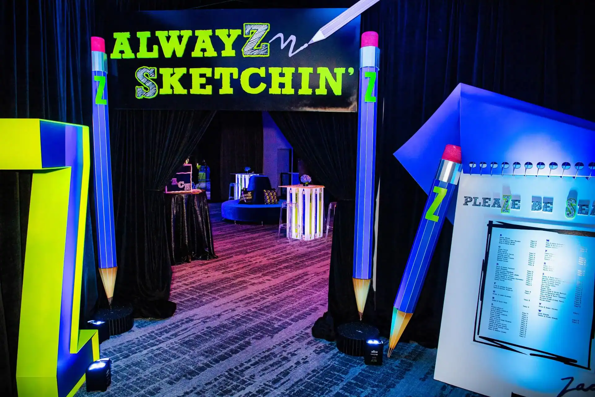 Imagine stepping into a world where creativity knows no bounds! When our client’s passion for doodling and sketching became our inspiration. As you enter, you’re greeted by an awe-inspiring sight: a colossal sketch pad, serving as both a welcome and a unique table placement guide. The journey continued beneath the towering presence of two 8-foot pencils, inviting you to sketch your way into the party room. Inside, a symphony of colors and coolness awaits. Enormous 16 ft tables stretch elegantly, adorned with a tapestry of vibrant paint buckets, each one bursting with florals. Debbie did an amazing job designing logos throughout the space by using his initials “Z” & “S”, from the dance floor, to the pillows, the menus, and even the photobooth, allowed for a creative and personal touch.