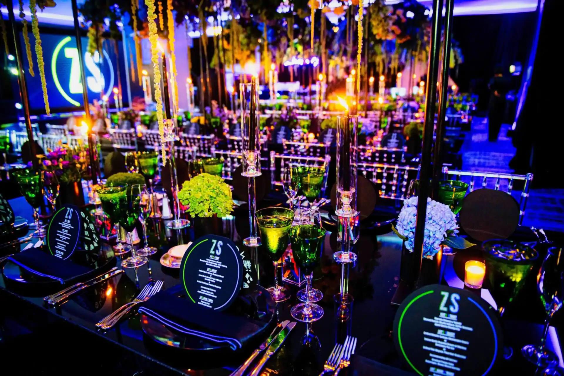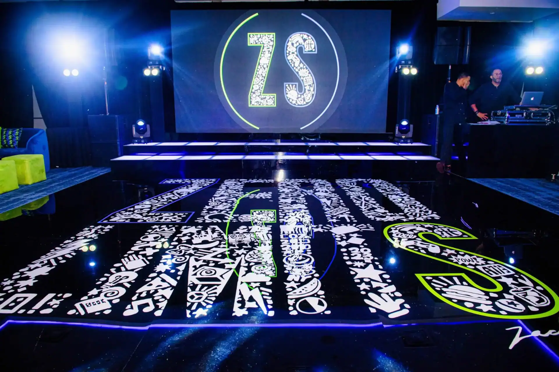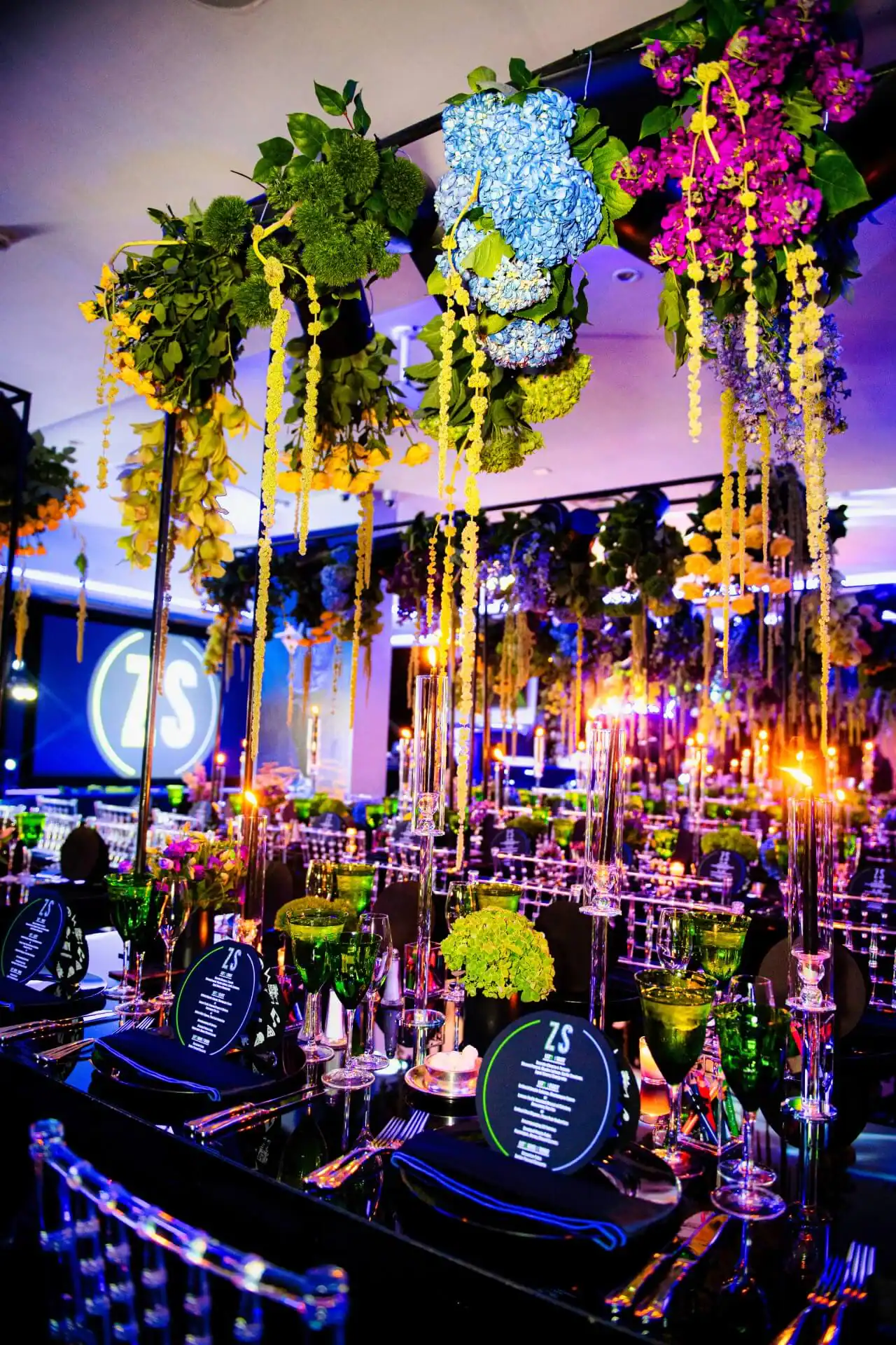 Imagine stepping into a world where creativity knows no bounds! When our client’s passion for doodling and sketching became our inspiration. As you enter, you’re greeted by an awe-inspiring sight: a colossal sketch pad, serving as both a welcome and a unique table placement guide. The journey continued beneath the towering presence of two 8-foot pencils, inviting you to sketch your way into the party room. Inside, a symphony of colors and coolness awaits. Enormous 16 ft tables stretch elegantly, adorned with a tapestry of vibrant paint buckets, each one bursting with florals. Debbie did an amazing job designing logos throughout the space by using his initials “Z” & “S”, from the dance floor, to the pillows, the menus, and even the photobooth, allowed for a creative and personal touch.