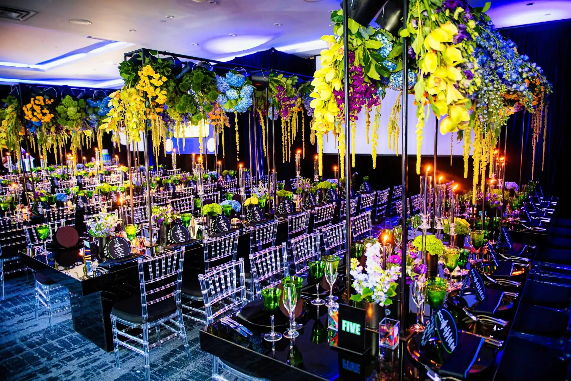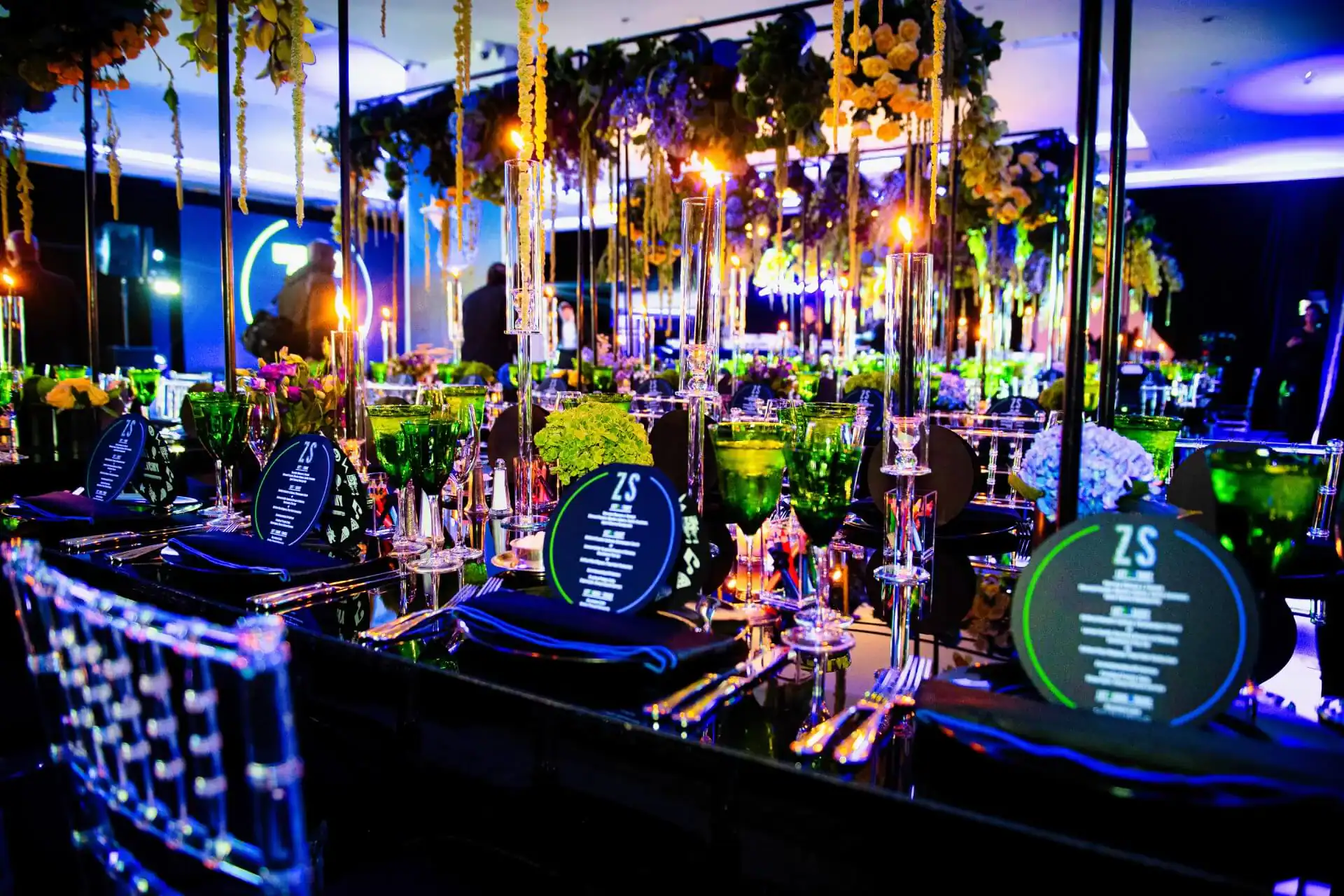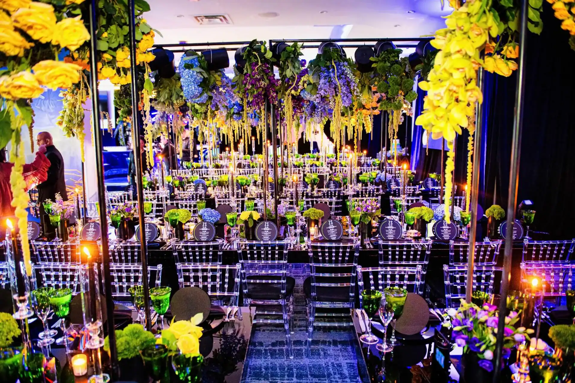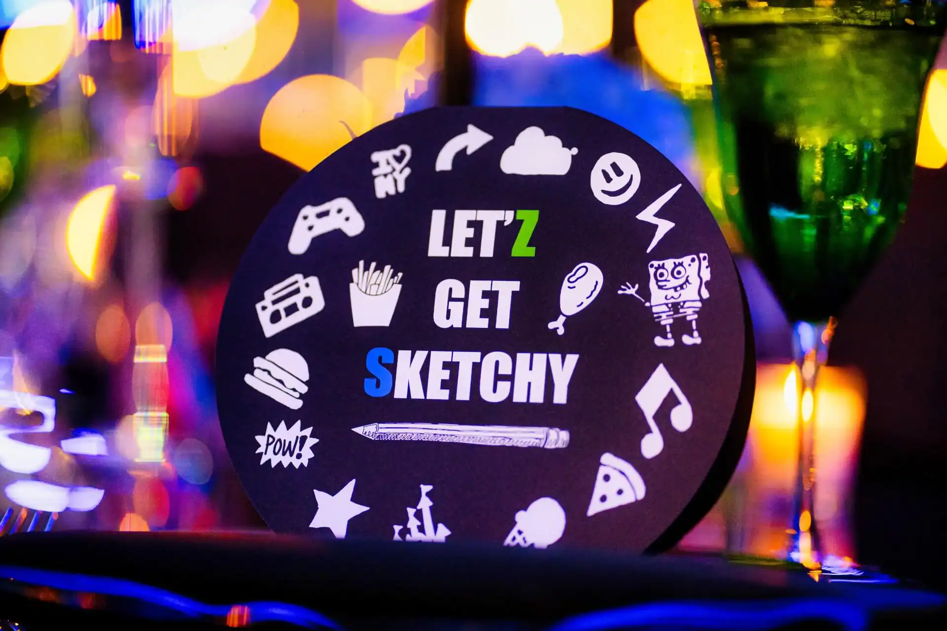 Imagine stepping into a world where creativity knows no bounds! When our client’s passion for doodling and sketching became our inspiration. As you enter, you’re greeted by an awe-inspiring sight: a colossal sketch pad, serving as both a welcome and a unique table placement guide. The journey continued beneath the towering presence of two 8-foot pencils, inviting you to sketch your way into the party room. Inside, a symphony of colors and coolness awaits. Enormous 16 ft tables stretch elegantly, adorned with a tapestry of vibrant paint buckets, each one bursting with florals. Debbie did an amazing job designing logos throughout the space by using his initials “Z” & “S”, from the dance floor, to the pillows, the menus, and even the photobooth, allowed for a creative and personal touch.