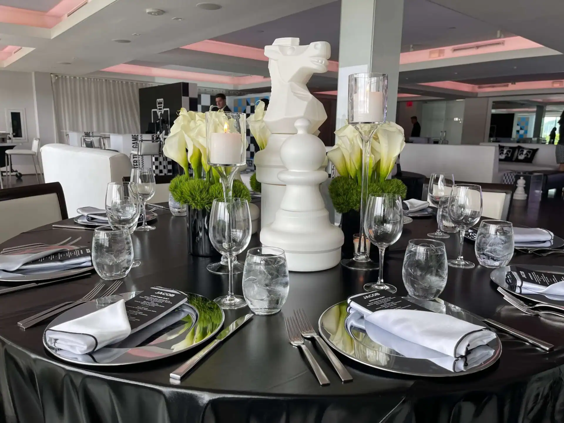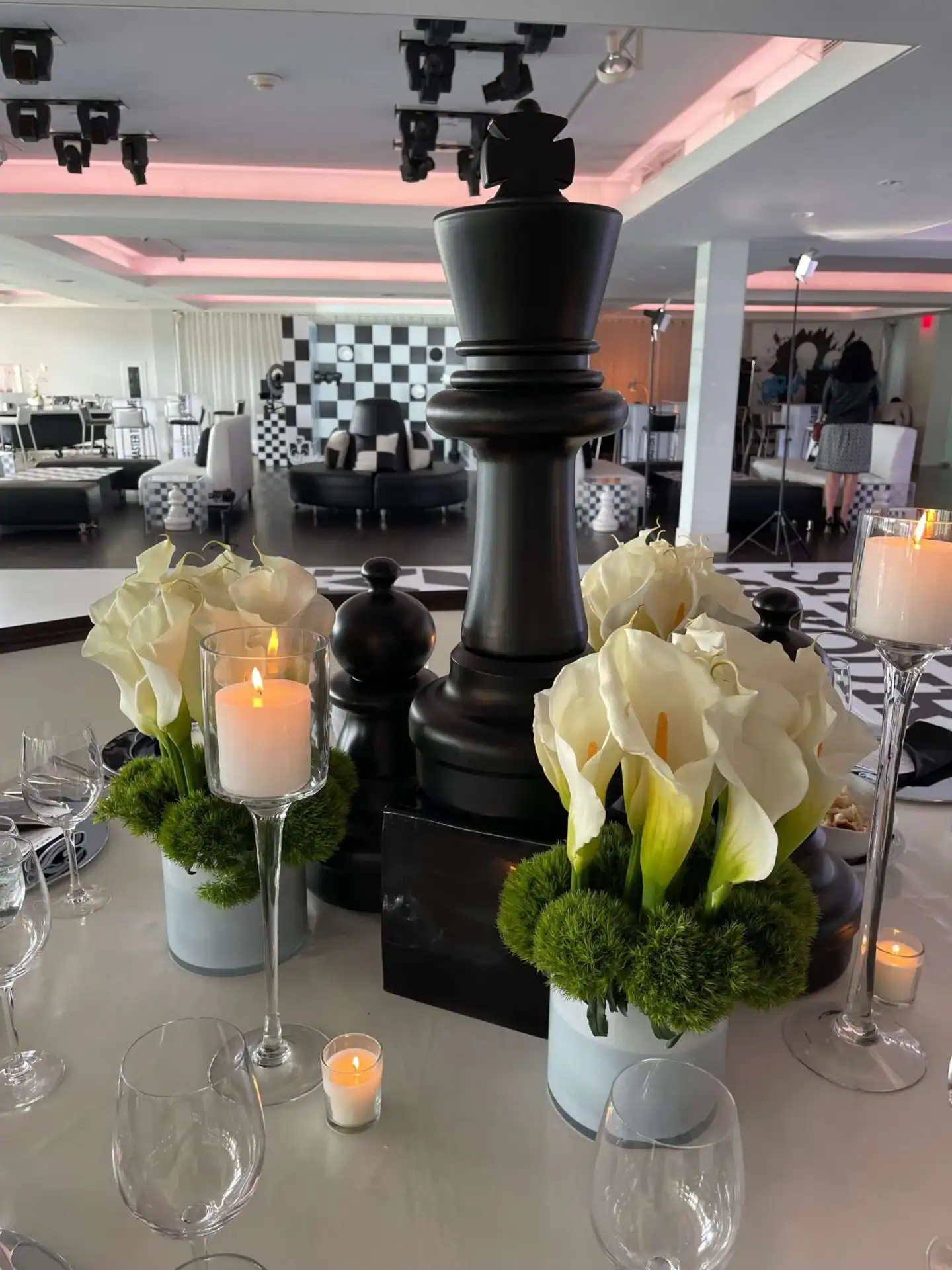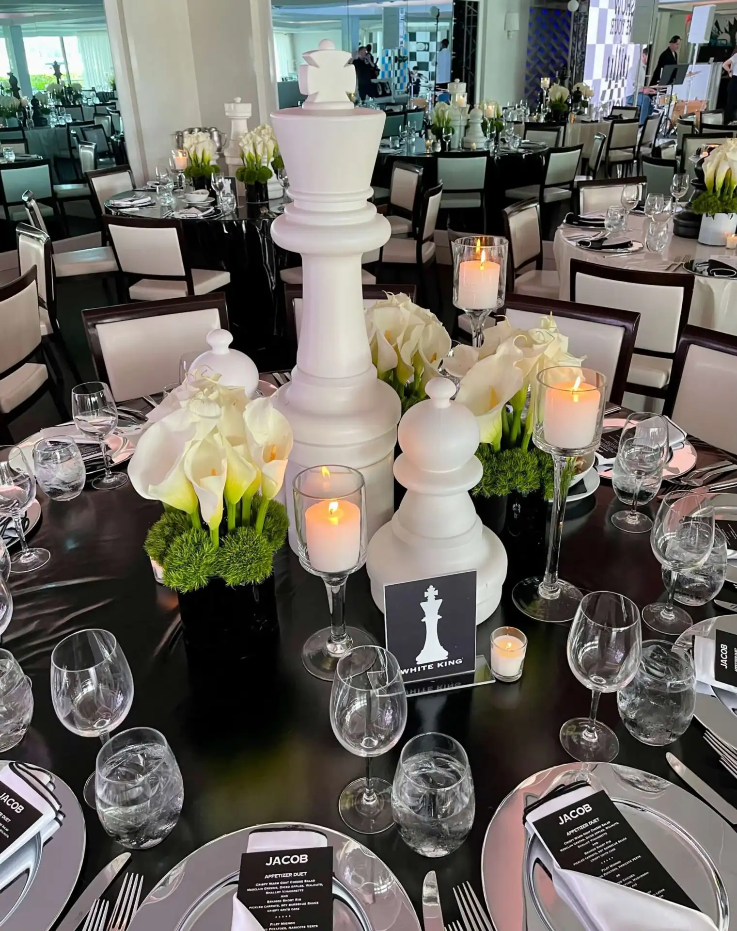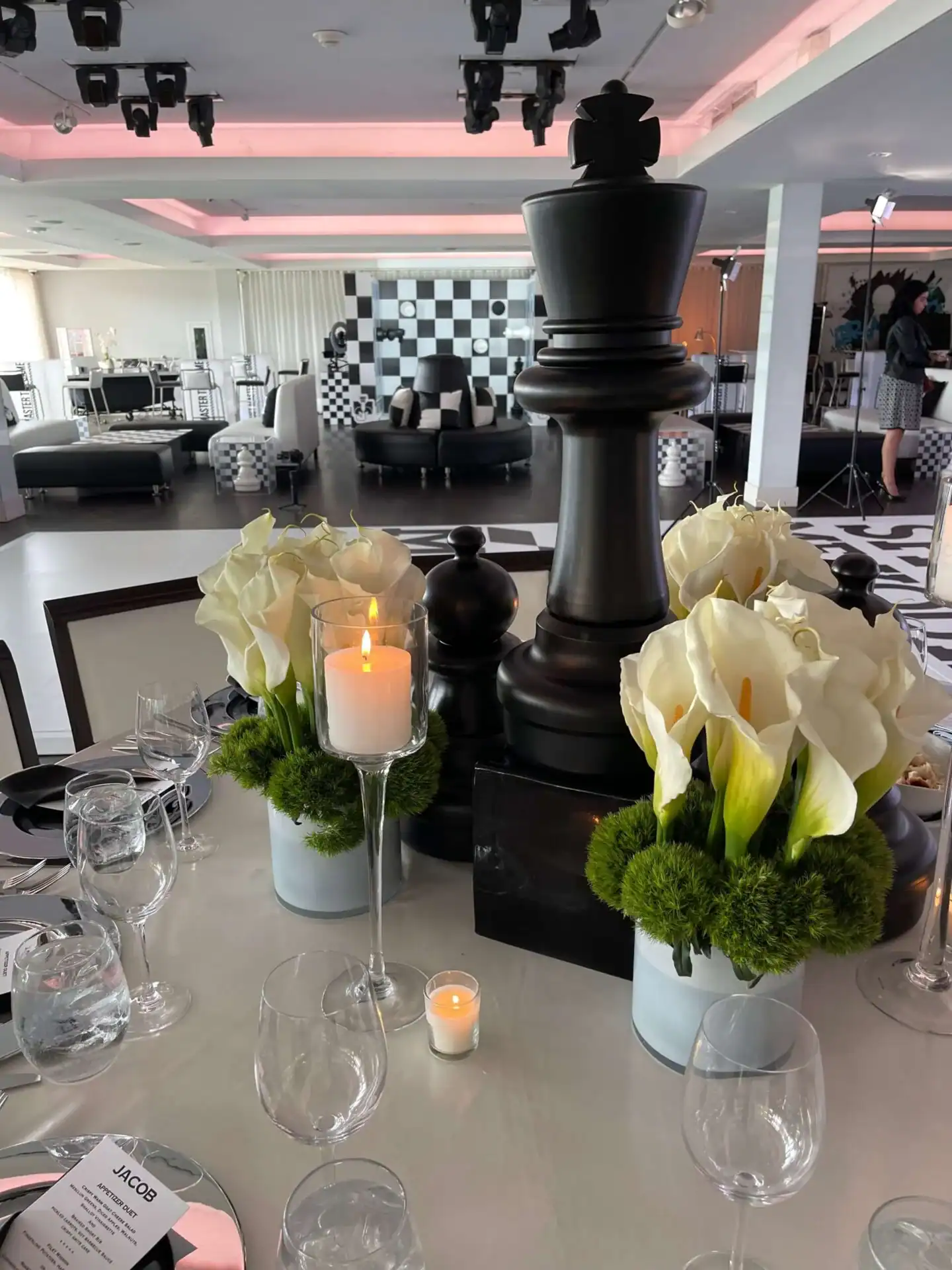 Debbie Hart made all the right moves in crafting this captivating chess-themed Mitzvah. Immerse yourself in a world of black and white chessboard patterns that seamlessly weave through the entire room. Oversized chess pieces serve as unique centerpieces, doubling as designated seating elements. The modern and playful ambiance is perfected with the addition of contemporary white Calla lilies in black-and-white vases.