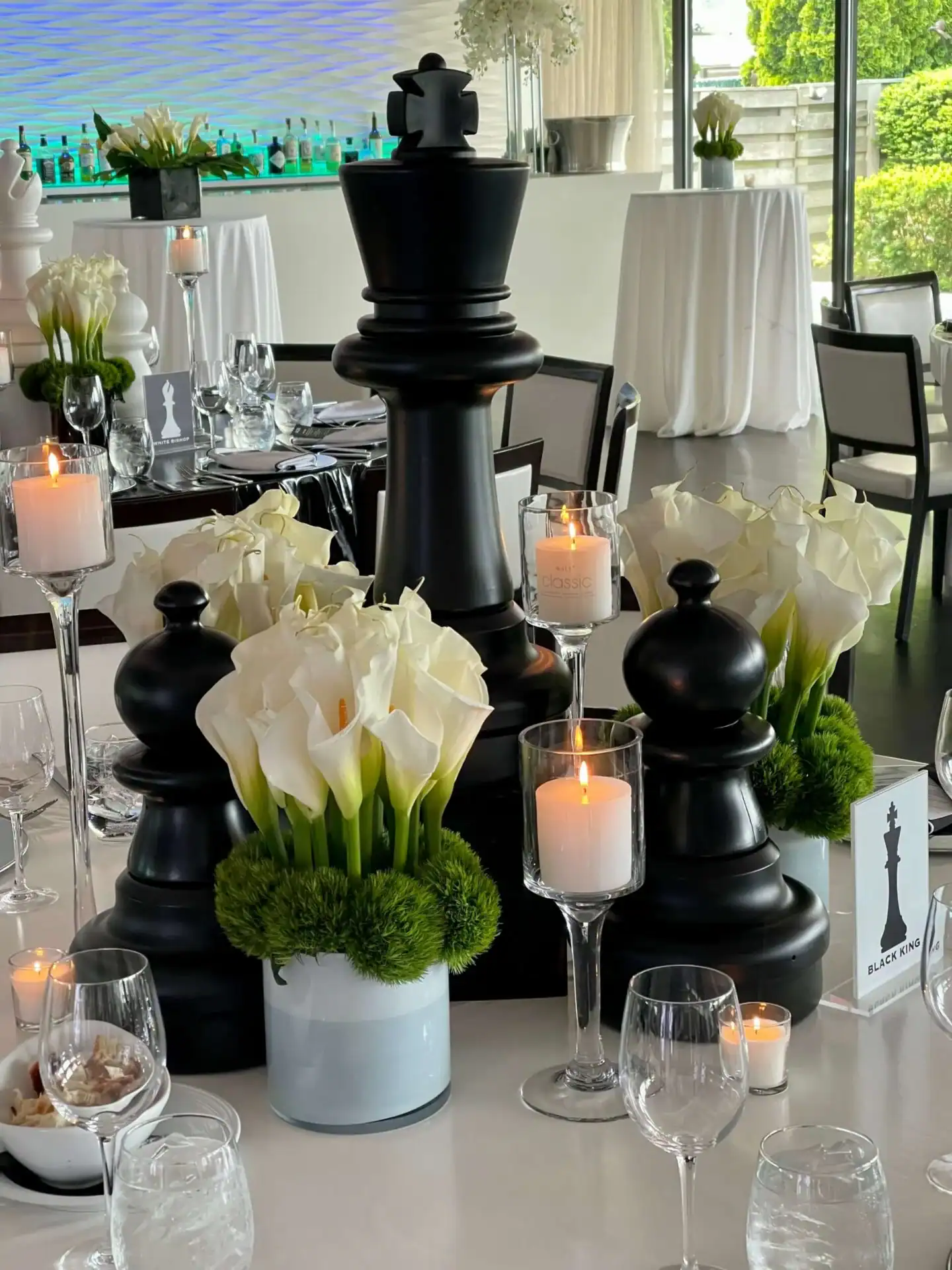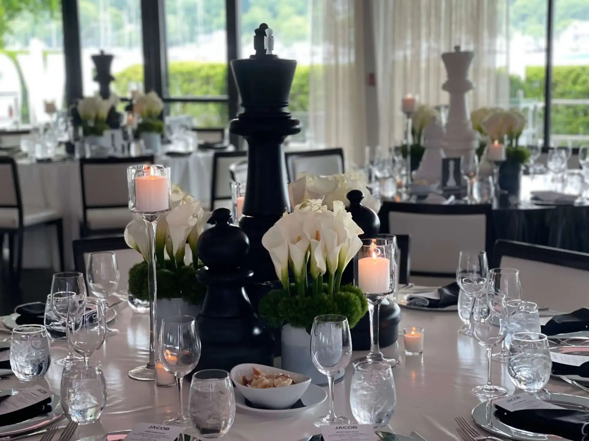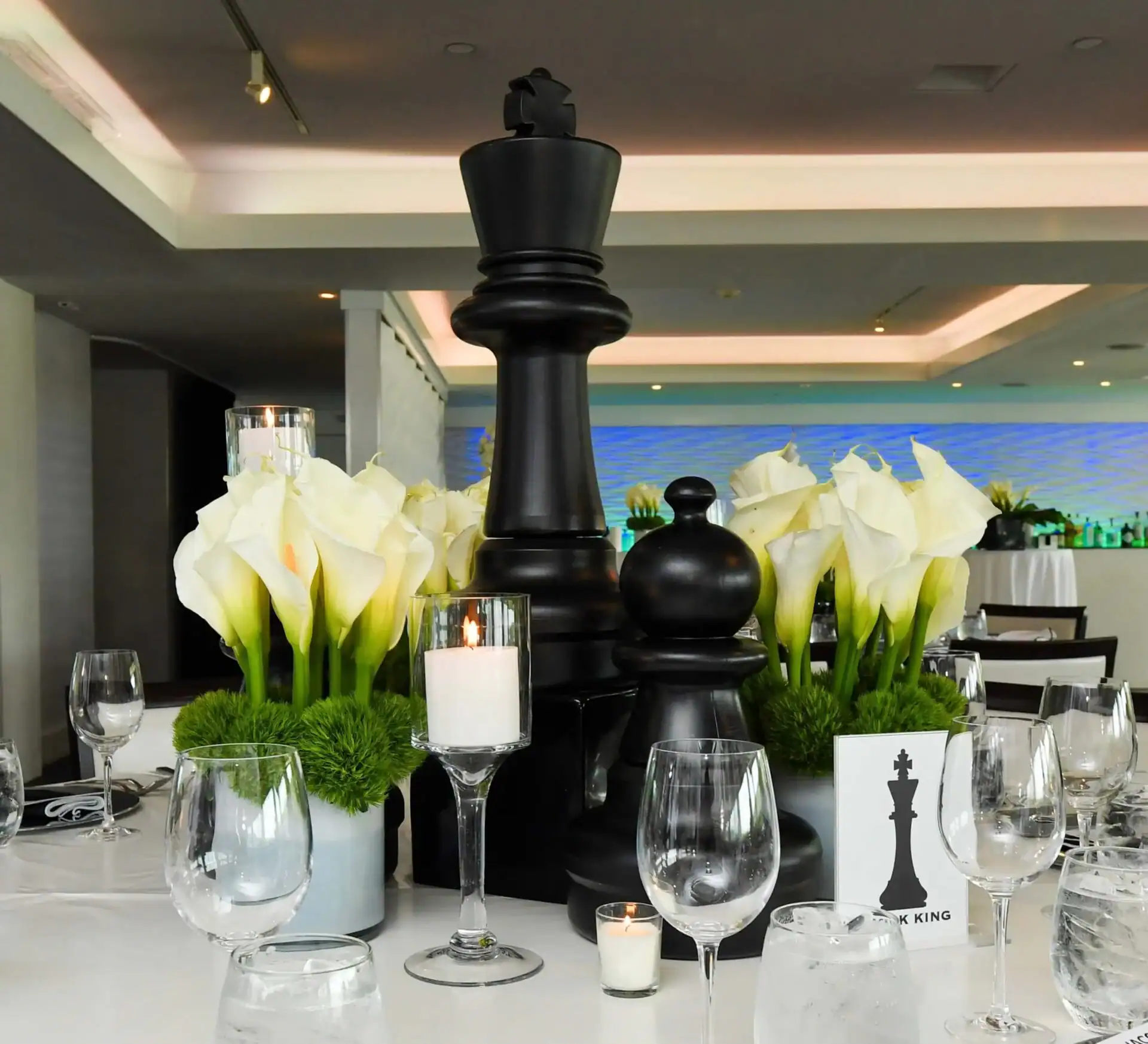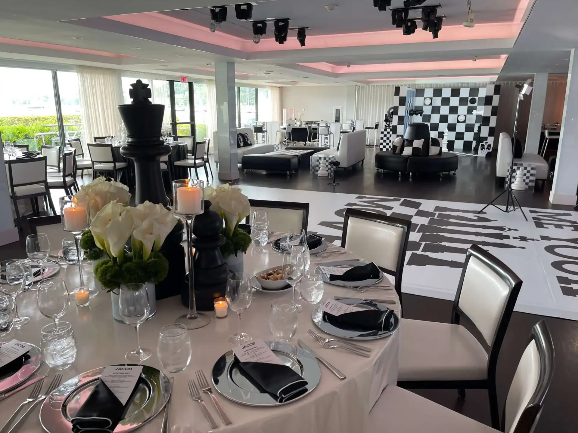 Debbie Hart made all the right moves in crafting this captivating chess-themed Mitzvah. Immerse yourself in a world of black and white chessboard patterns that seamlessly weave through the entire room. Oversized chess pieces serve as unique centerpieces, doubling as designated seating elements. The modern and playful ambiance is perfected with the addition of contemporary white Calla lilies in black-and-white vases.