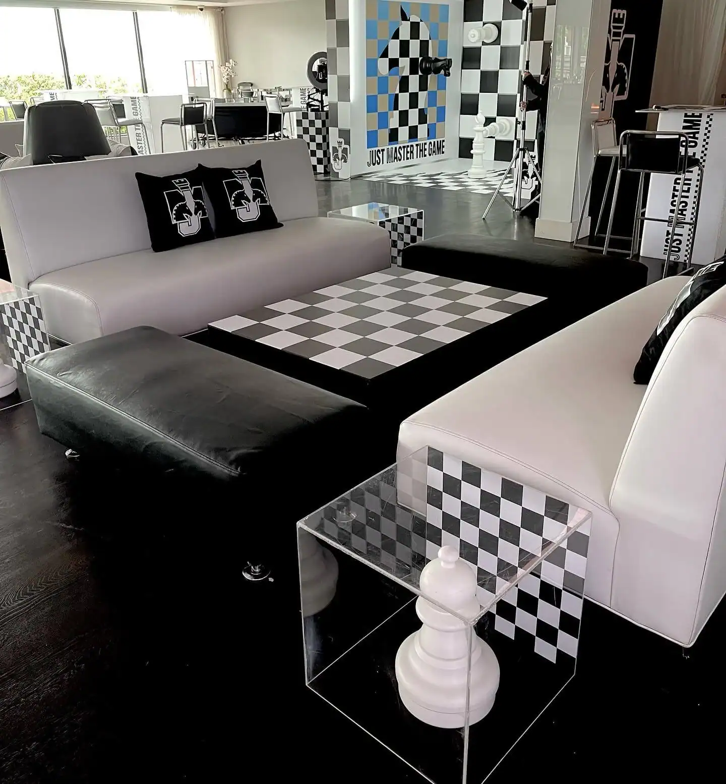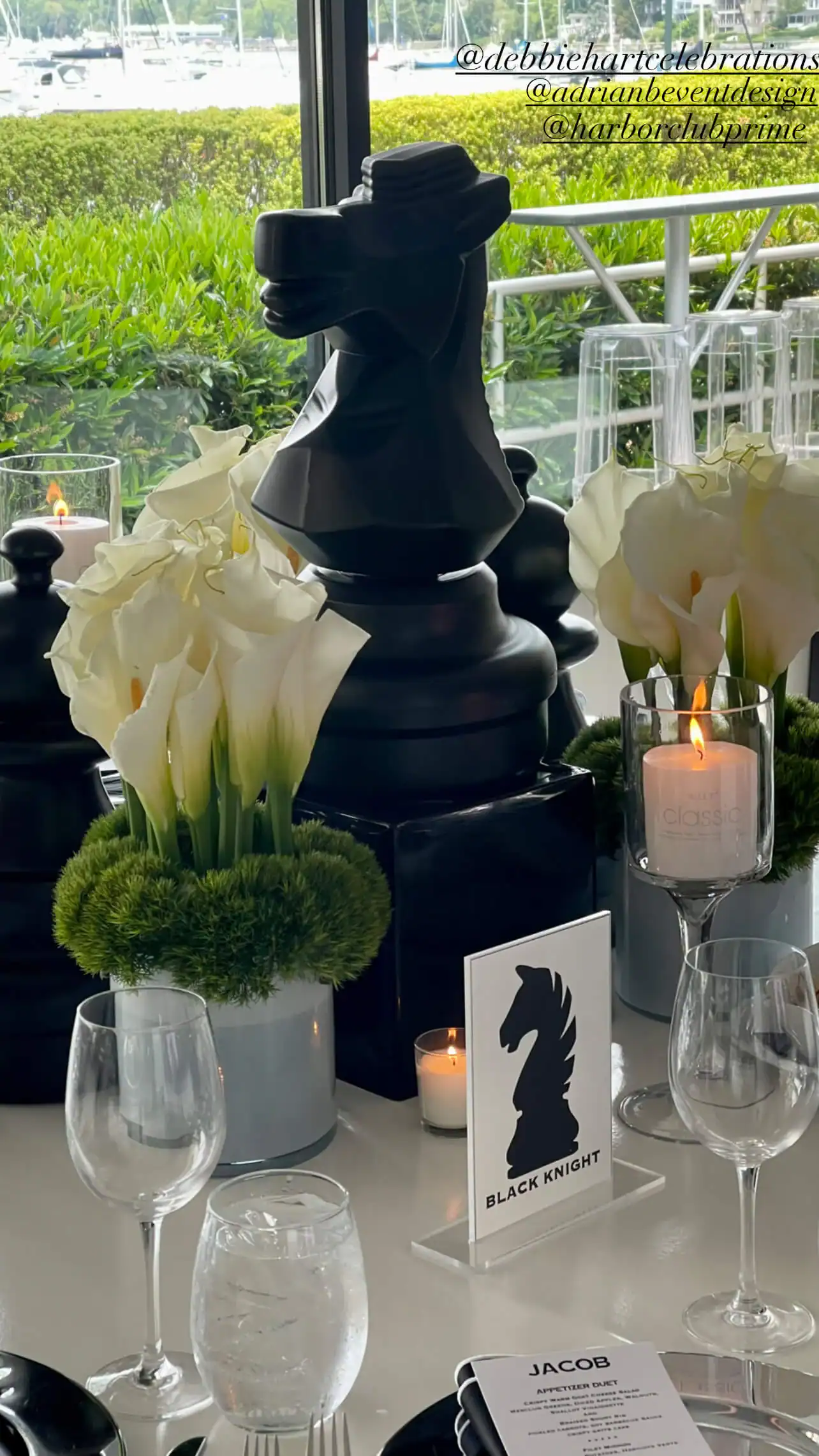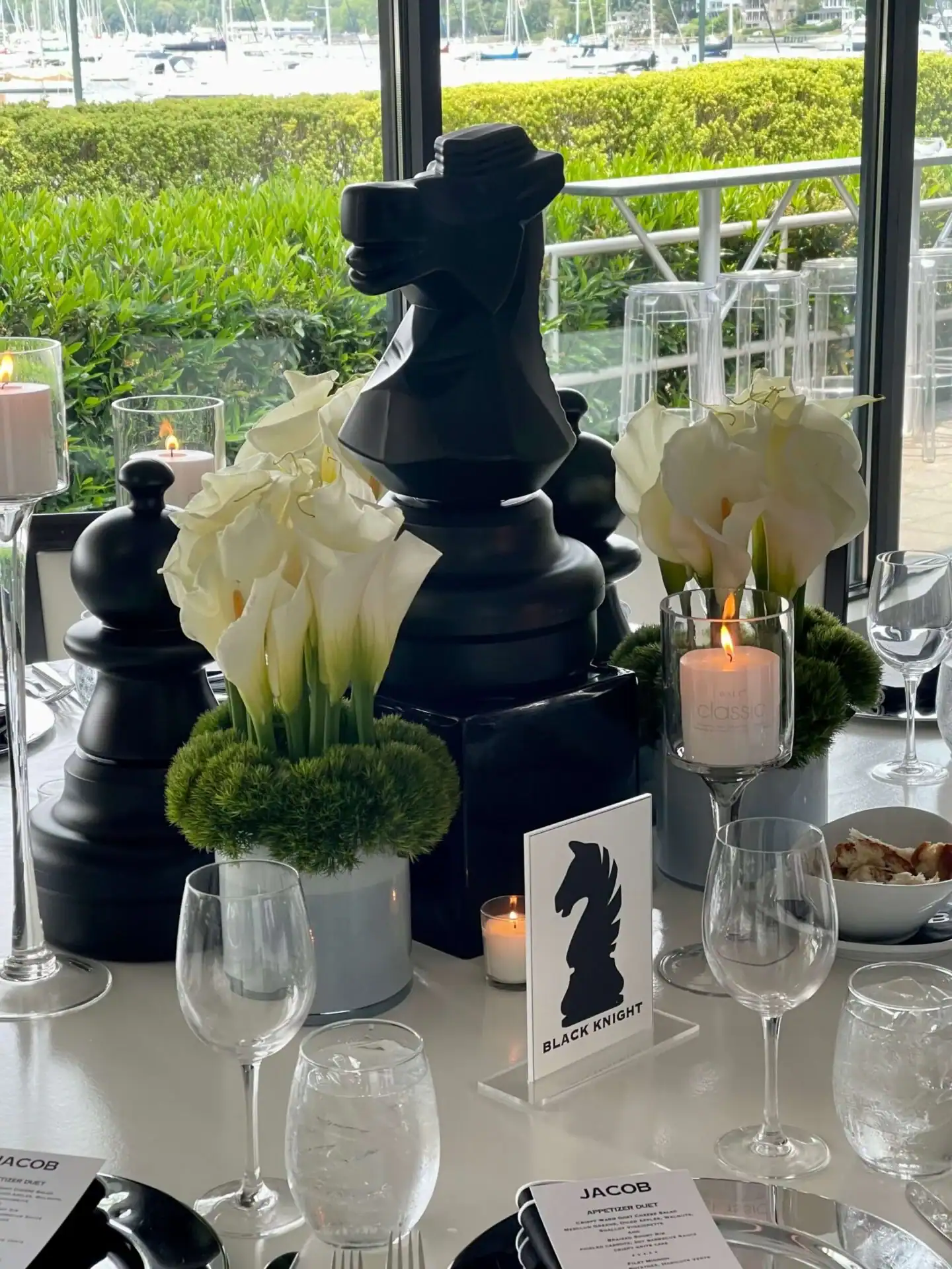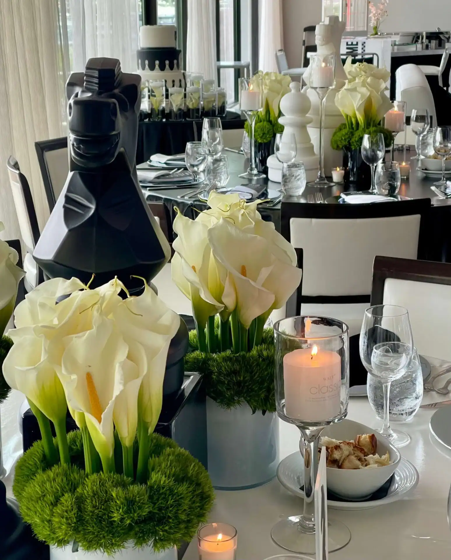Debbie Hart made all the right moves in crafting this captivating chess-themed Mitzvah. Immerse yourself in a world of black and white chessboard patterns that seamlessly weave through the entire room. Oversized chess pieces serve as unique centerpieces, doubling as designated seating elements. The modern and playful ambiance is perfected with the addition of contemporary white Calla lilies in black-and-white vases.