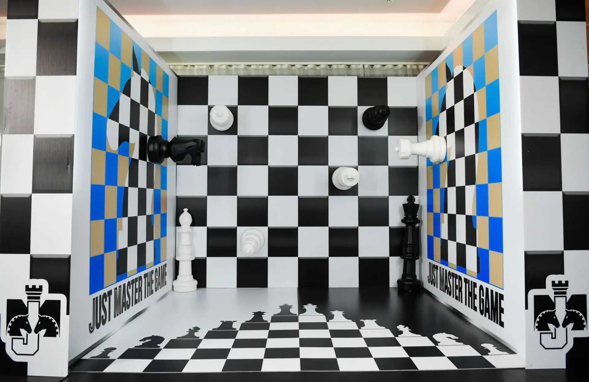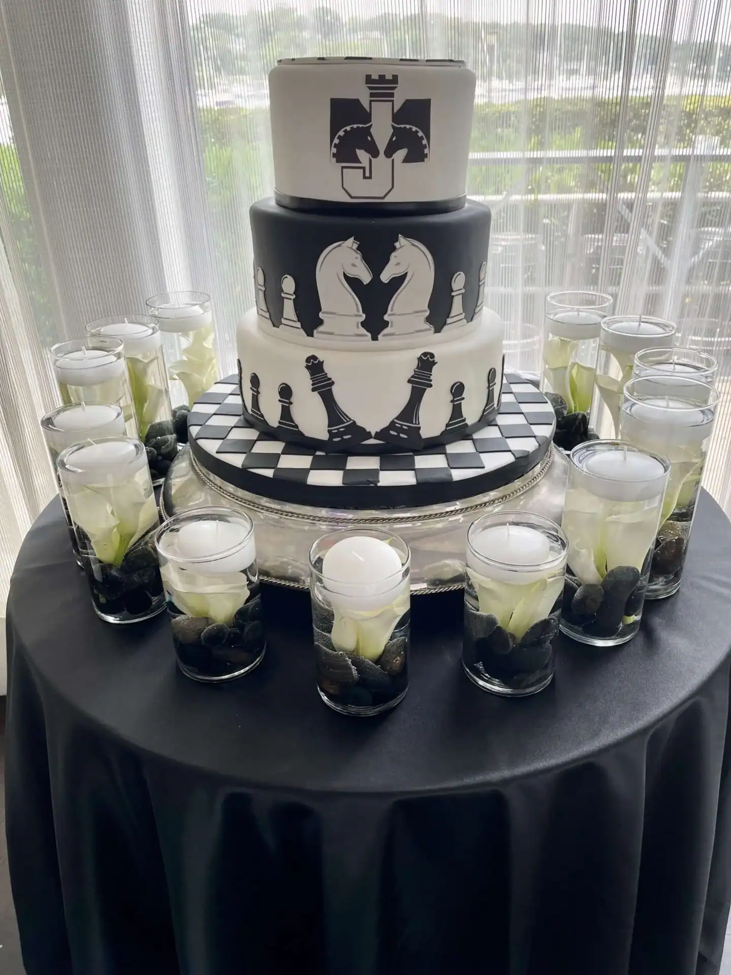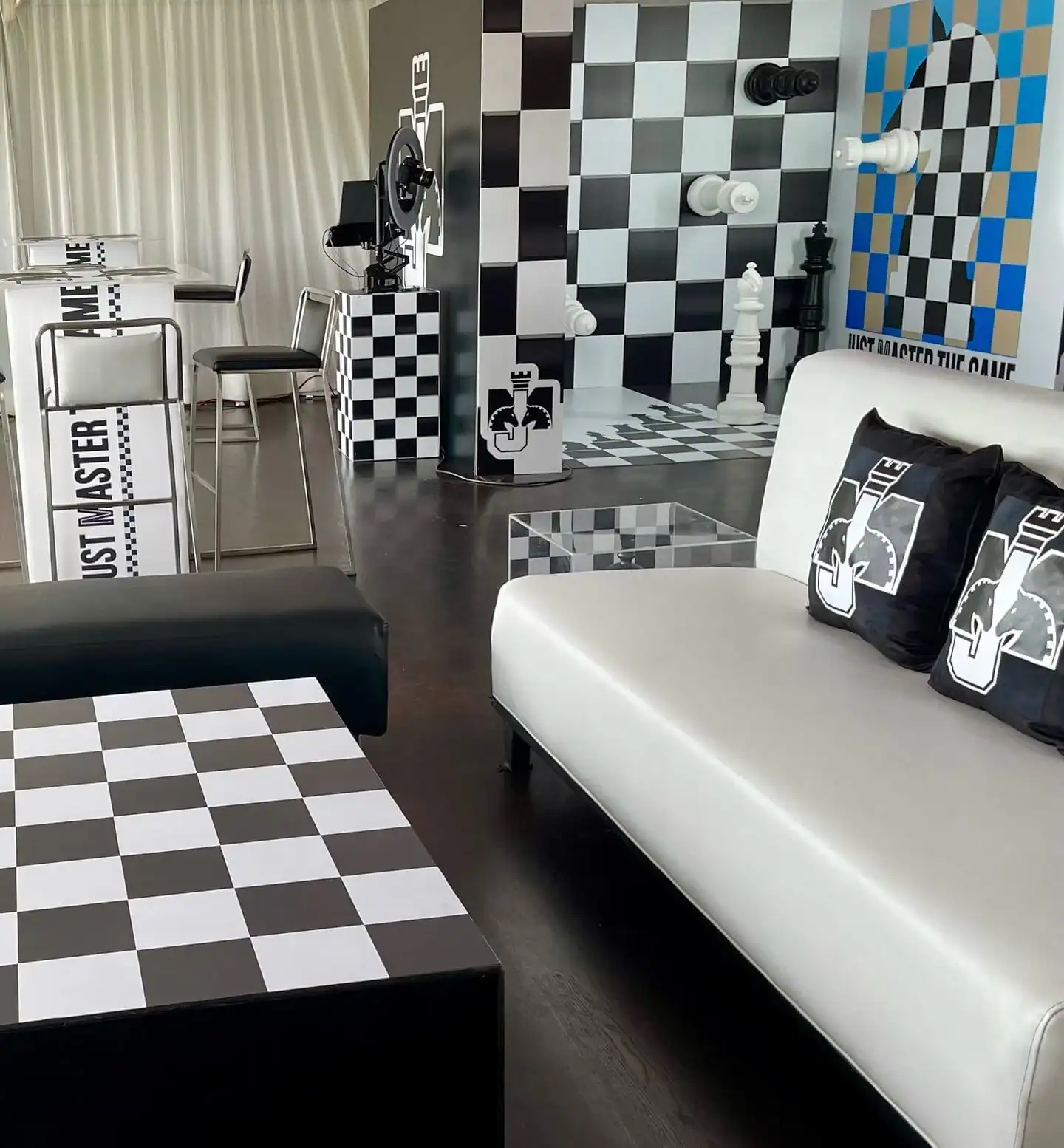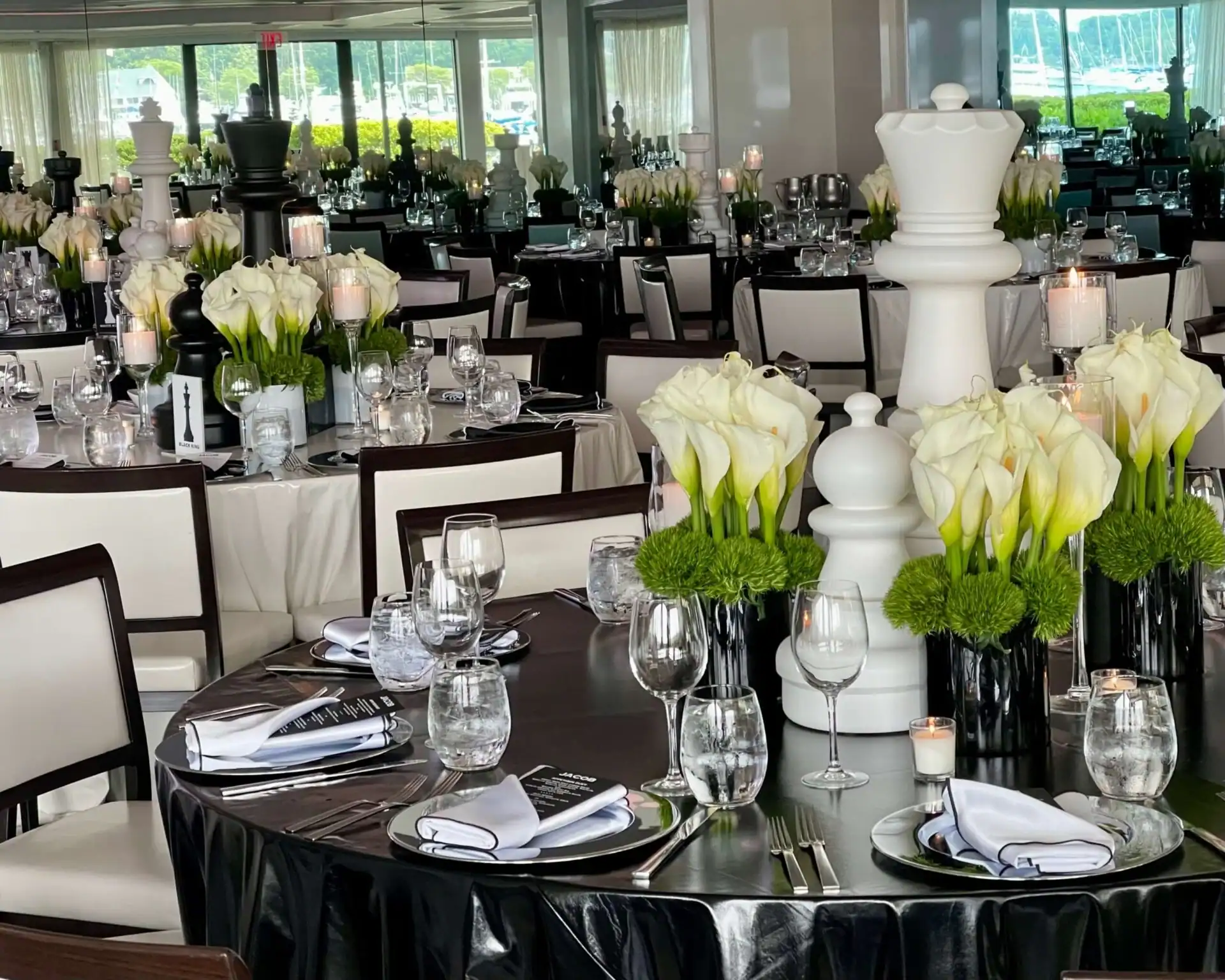 Debbie Hart made all the right moves in crafting this captivating chess-themed Mitzvah. Immerse yourself in a world of black and white chessboard patterns that seamlessly weave through the entire room. Oversized chess pieces serve as unique centerpieces, doubling as designated seating elements. The modern and playful ambiance is perfected with the addition of contemporary white Calla lilies in black-and-white vases.