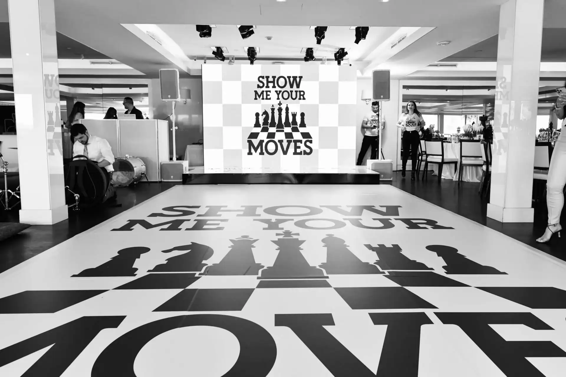 Strategic design takes center stage as one of the Bar Mitzvah boys’ logos boldly graces the wrapped dance floor, inviting everyone to “SHOW ME YOUR MOVES.” Step into an immersive 3D photo booth that transports you into the heart of the game, capturing smiles and moments of mastering each move. Join us in a modern and playful celebration where every detail reflects the art of the game.
