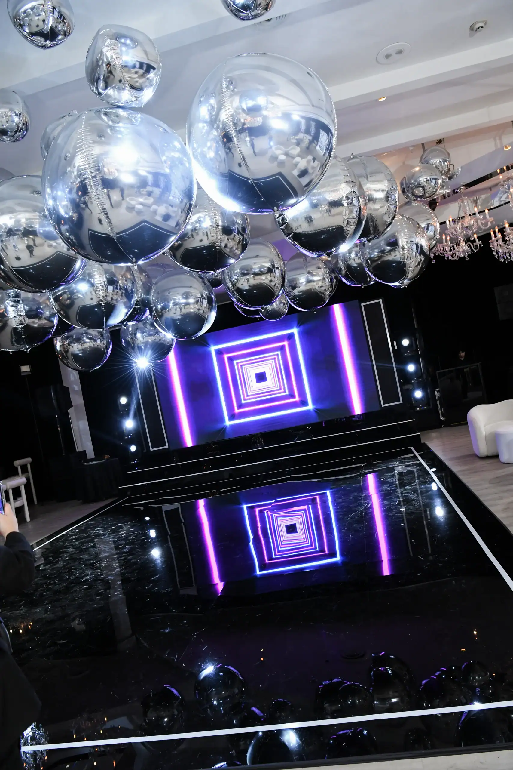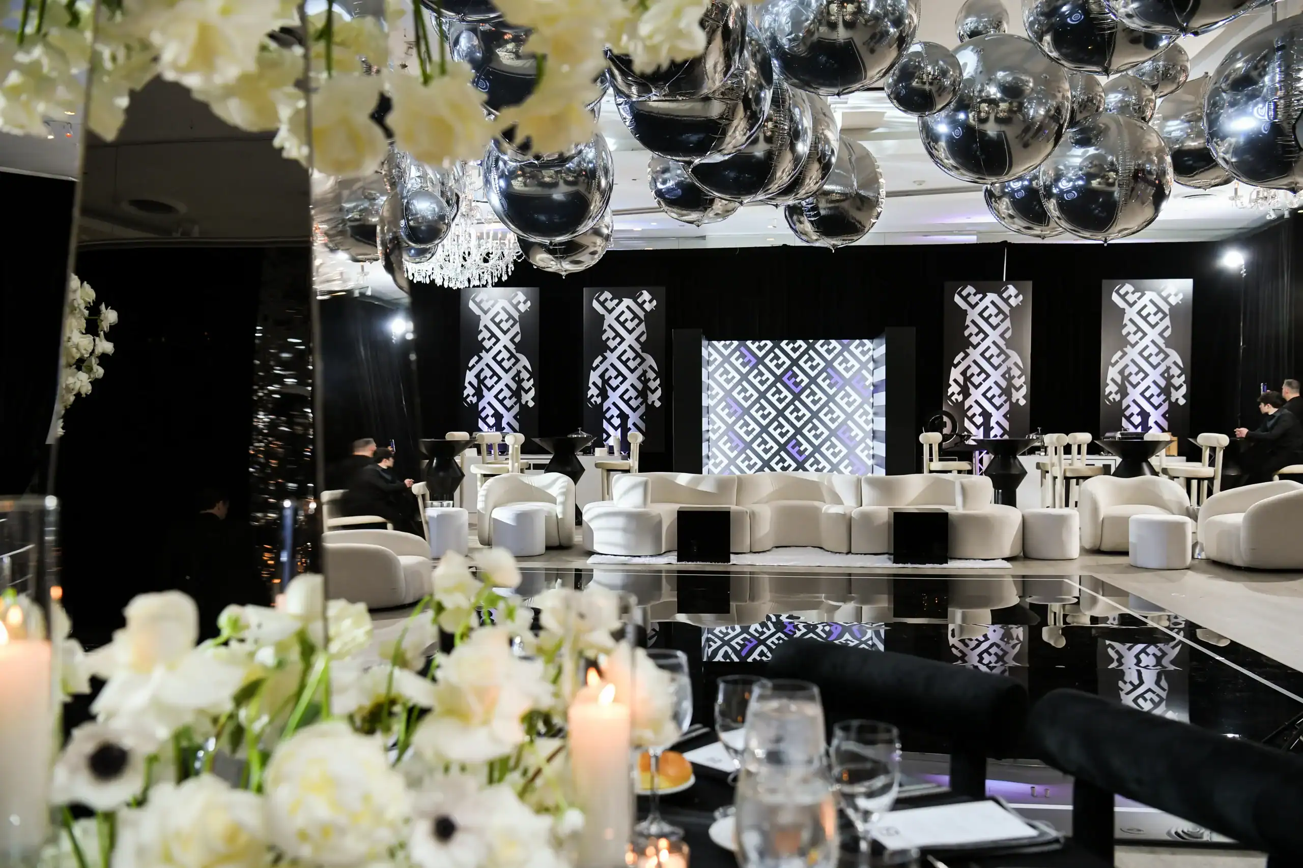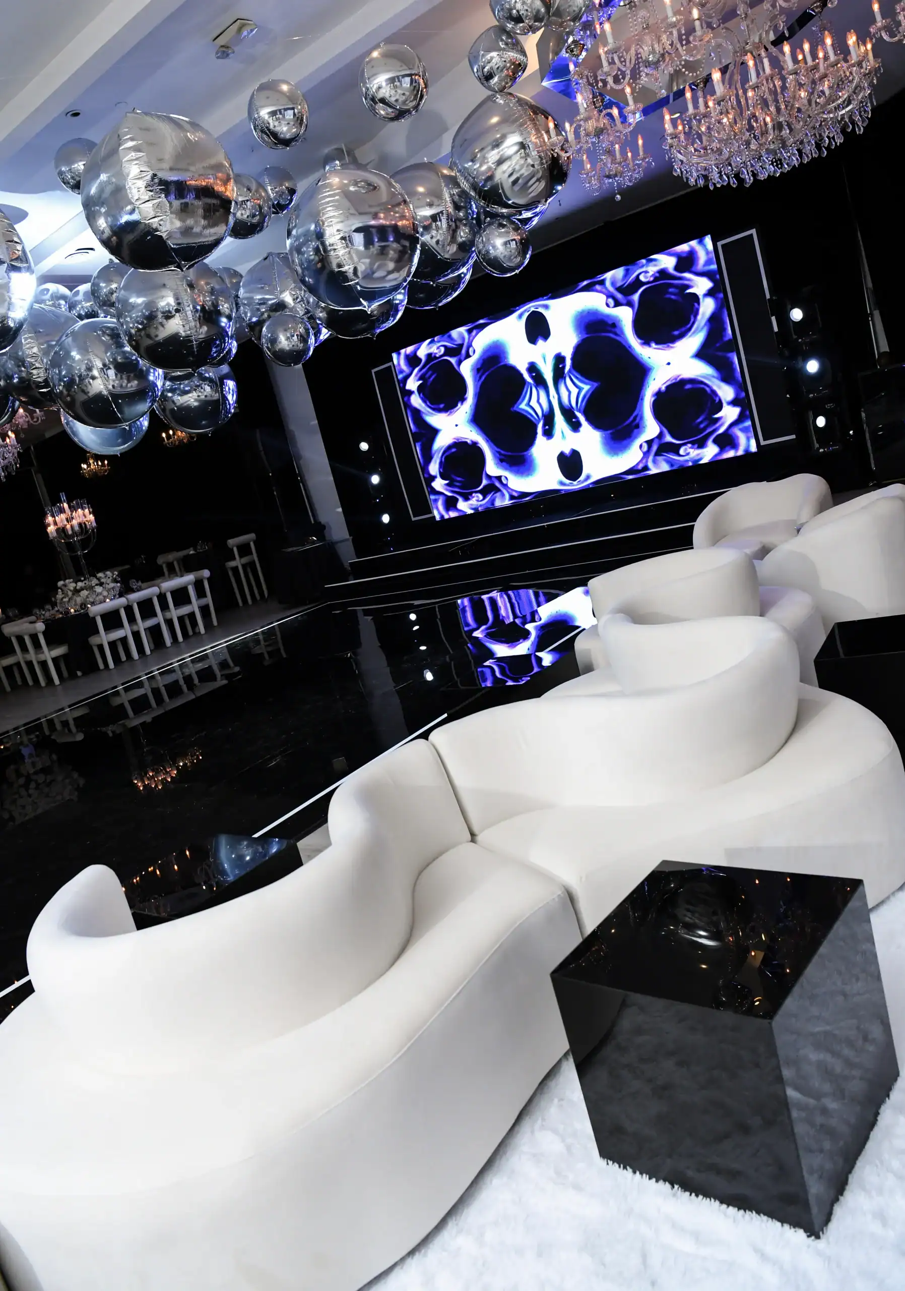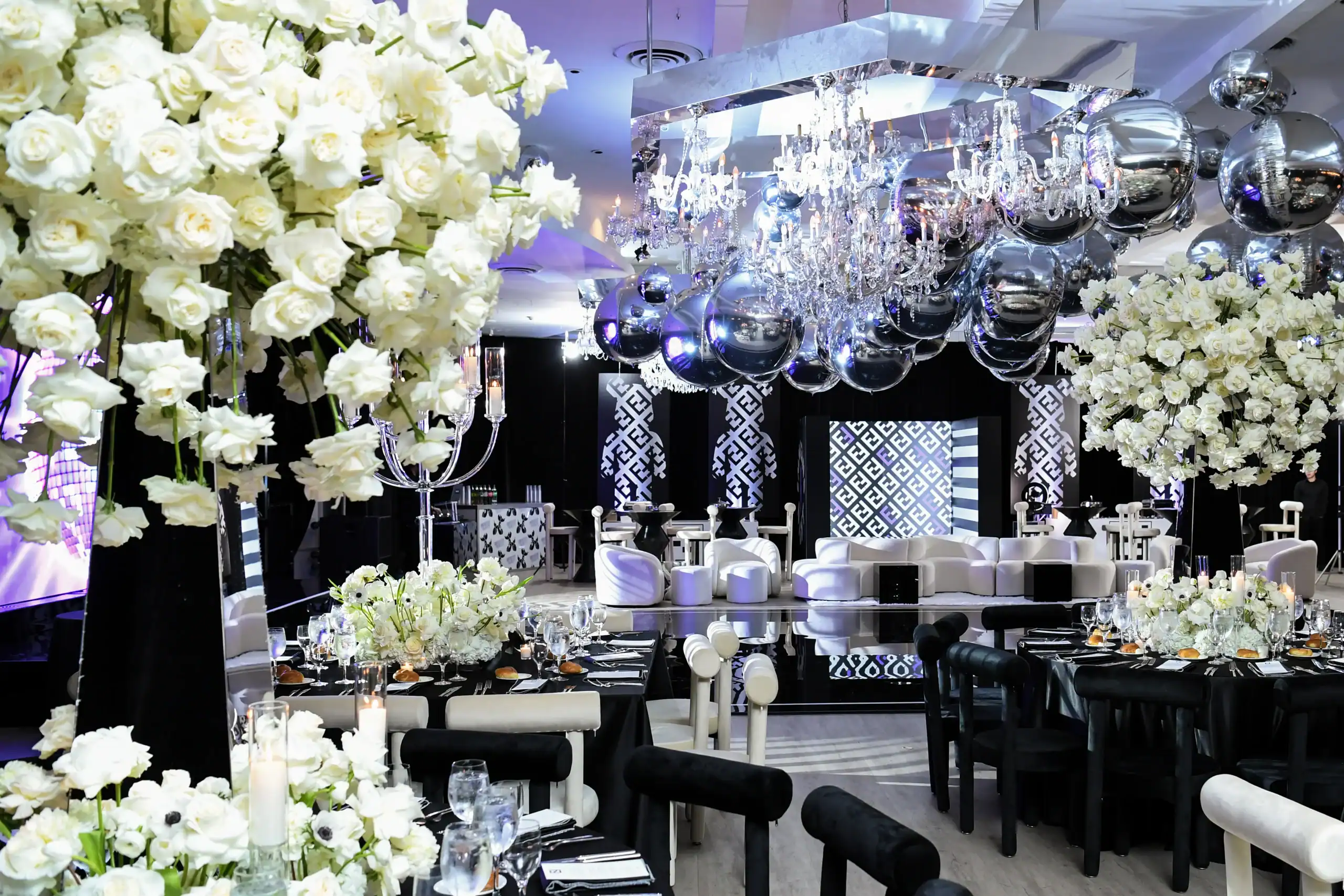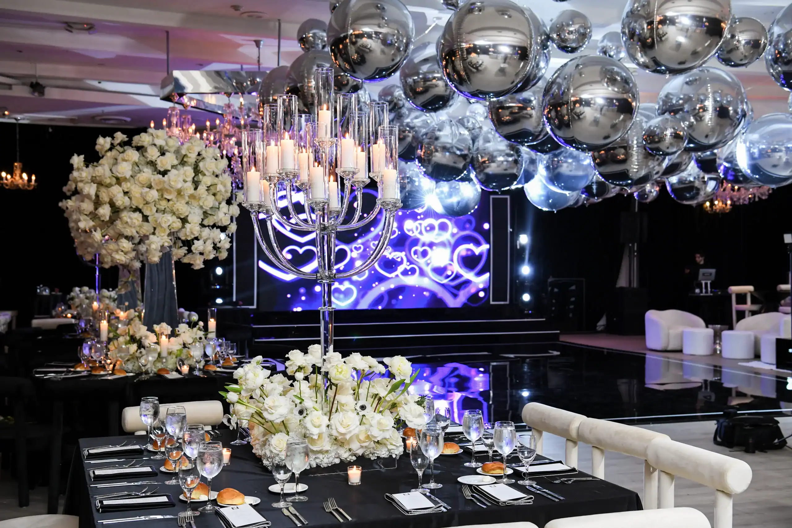 Debbie Hart and her team achieved the desired “wow” factor, infusing the ballroom with sophistication and glamour. Skillfully incorporated striking modern elements, playing with black and white tones alongside accents of chrome and mirrors. Plush velvet furniture and a contemporary acrylic dance floor set the scene, while oversized metallic balloons, chic candelabras, and avant-garde white rose centerpieces added the finishing touches. The result was a captivating space that seamlessly blended luxury, glamour, and a modern flair, ensuring an unforgettable experience for all the guests that came to celebrate.