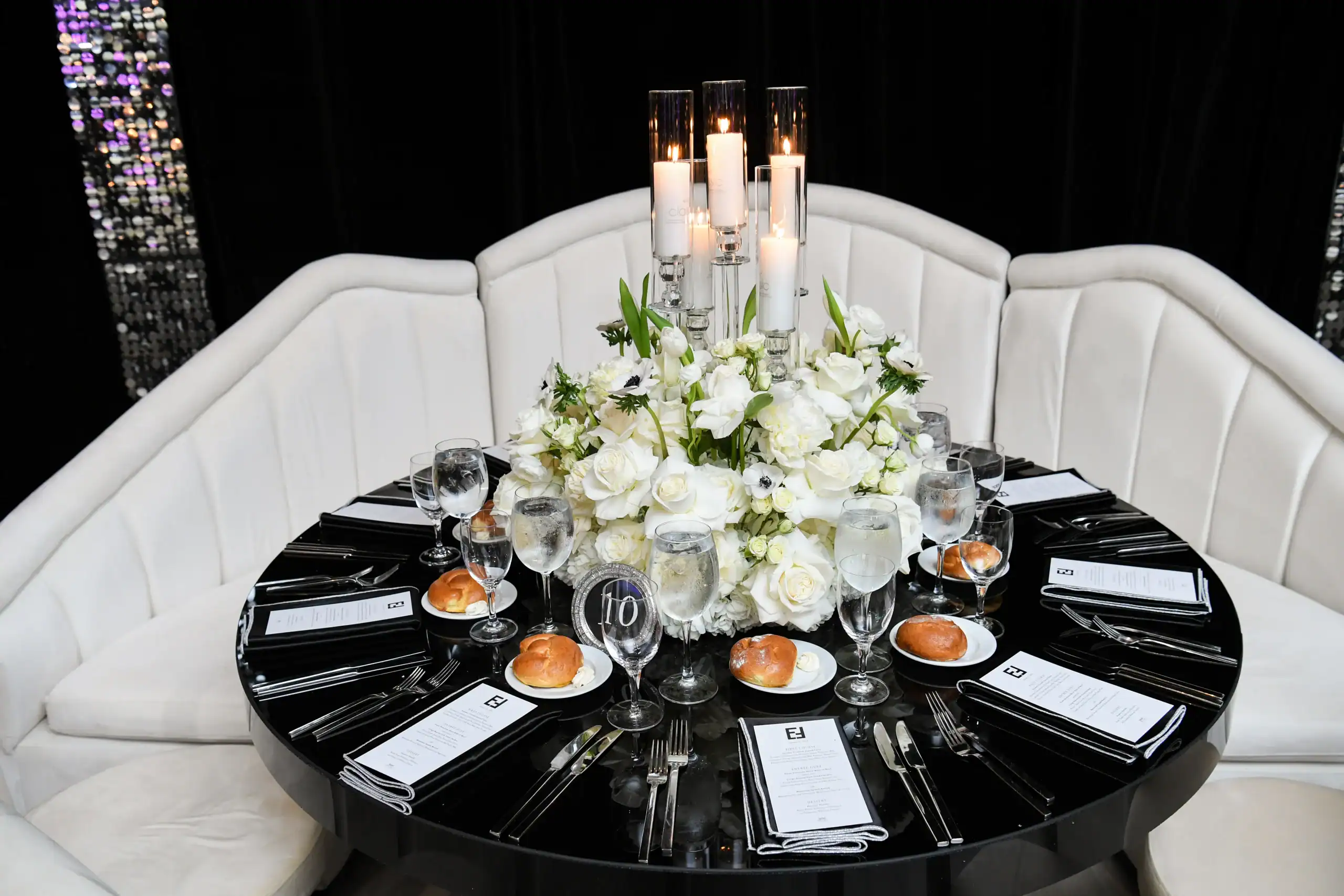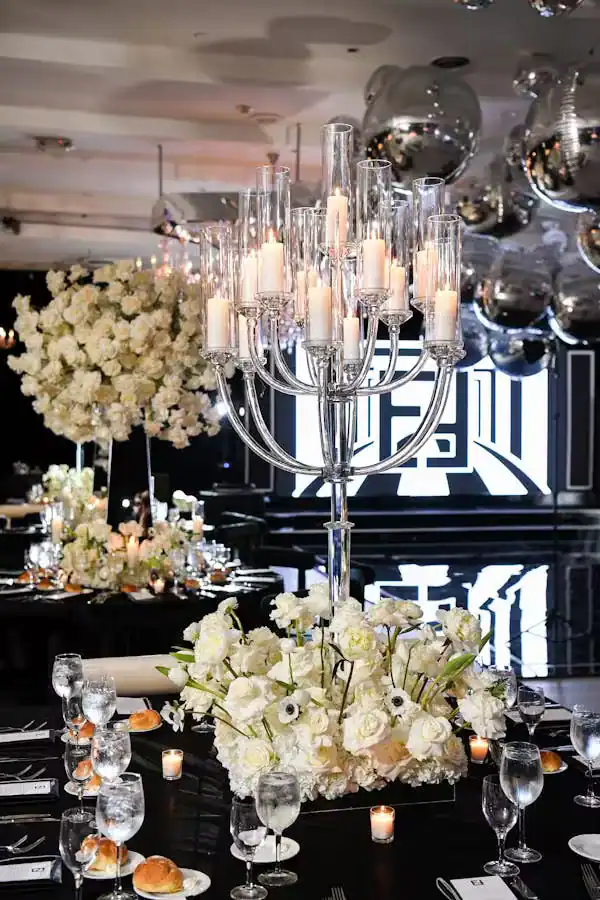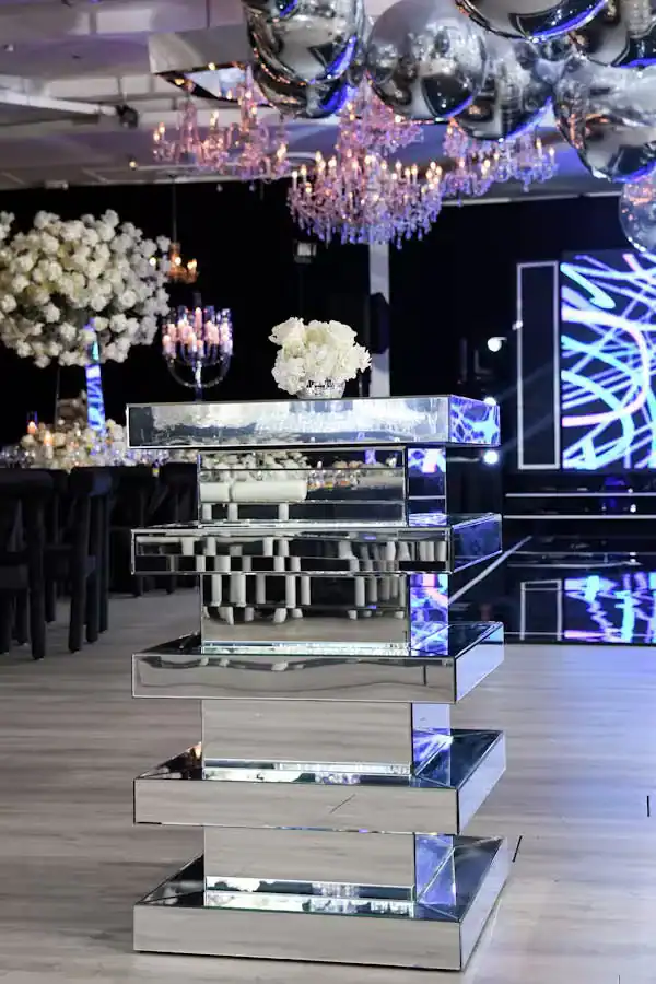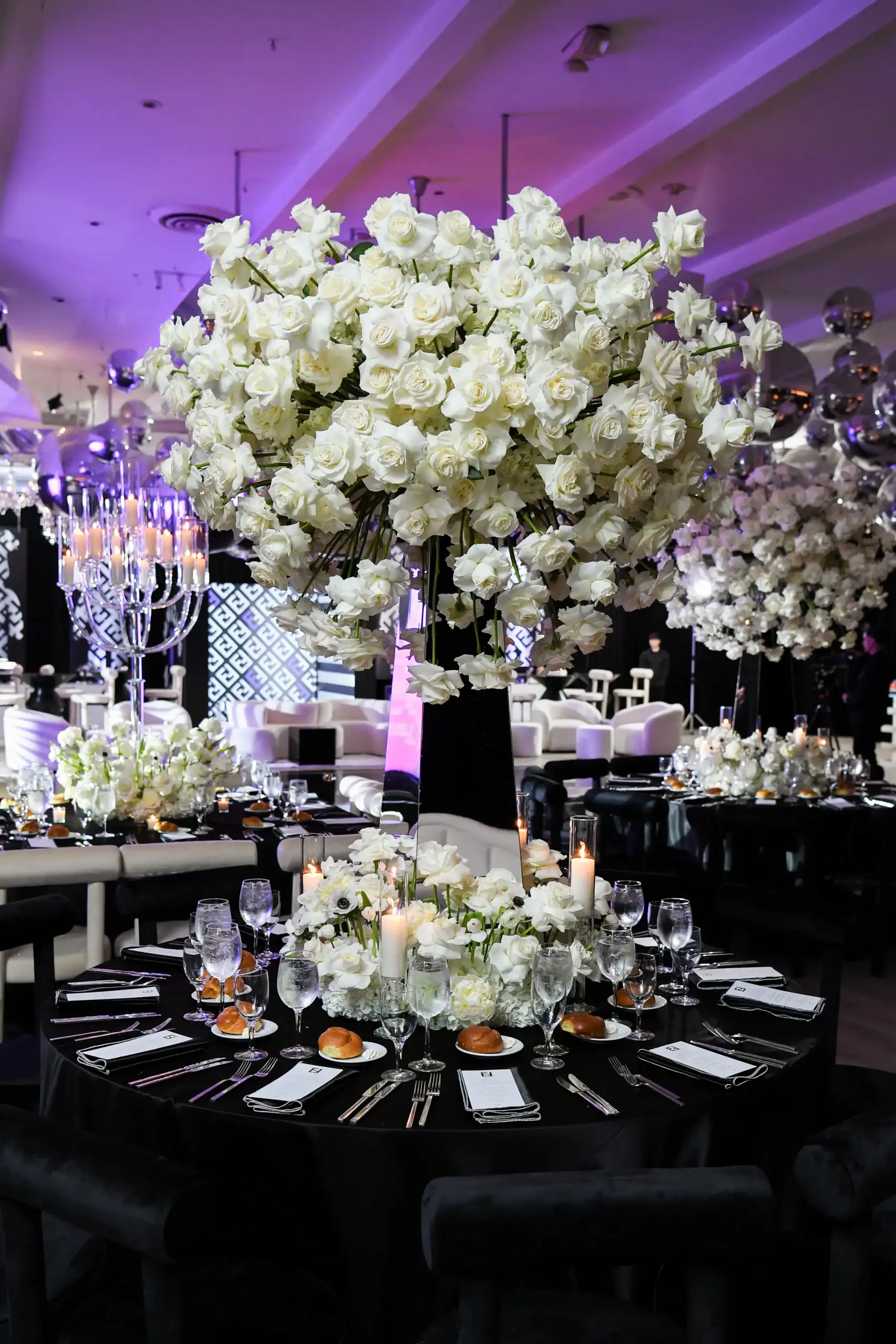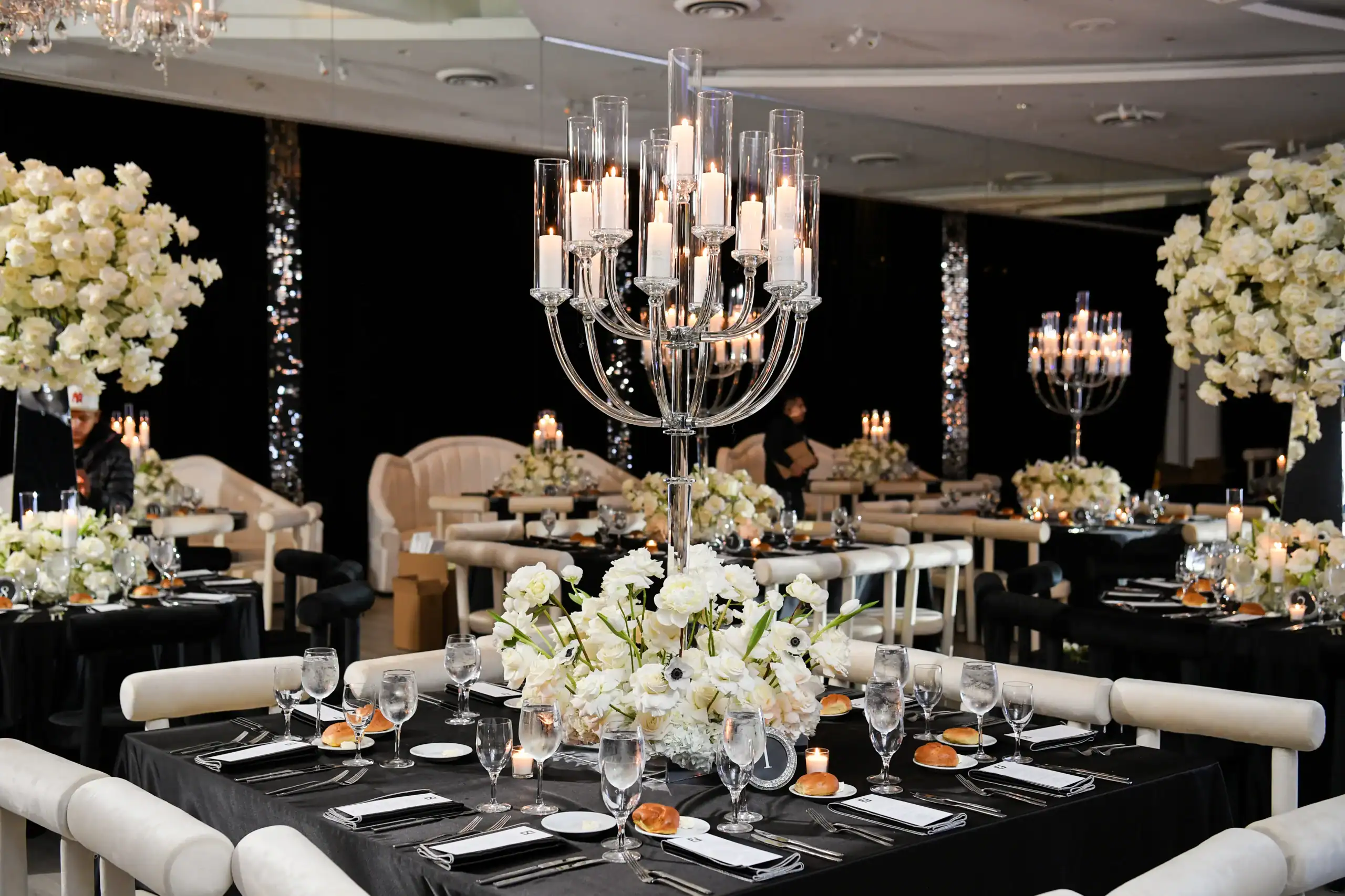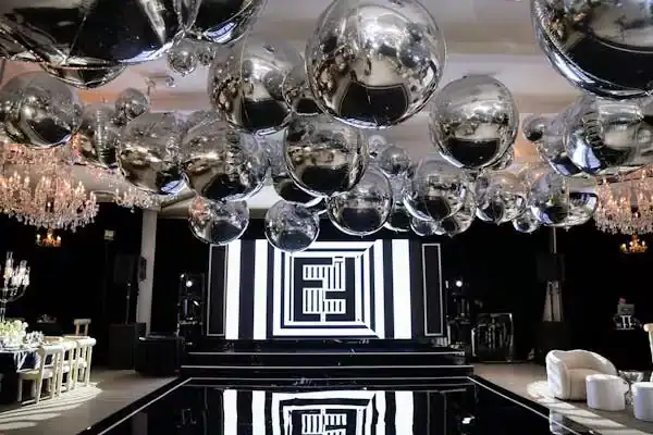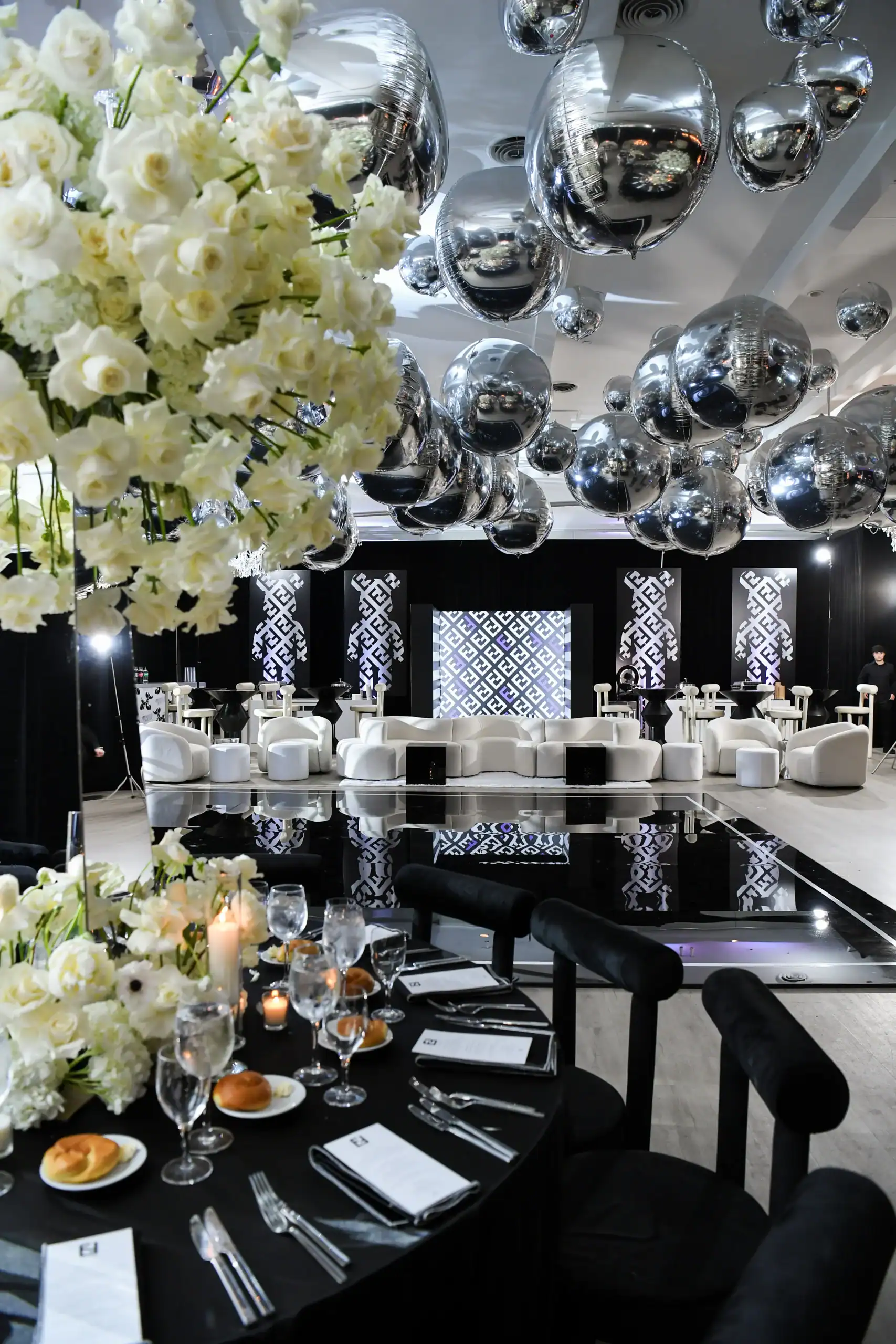 Debbie Hart and her team achieved the desired “wow” factor, infusing the ballroom with sophistication and glamour. Skillfully incorporated striking modern elements, playing with black and white tones alongside accents of chrome and mirrors. Plush velvet furniture and a contemporary acrylic dance floor set the scene, while oversized metallic balloons, chic candelabras, and avant-garde white rose centerpieces added the finishing touches. The result was a captivating space that seamlessly blended luxury, glamour, and a modern flair, ensuring an unforgettable experience for all the guests that came to celebrate.