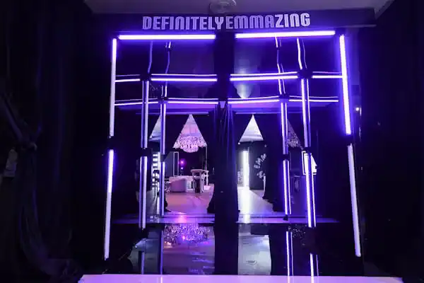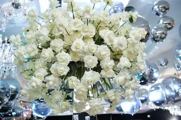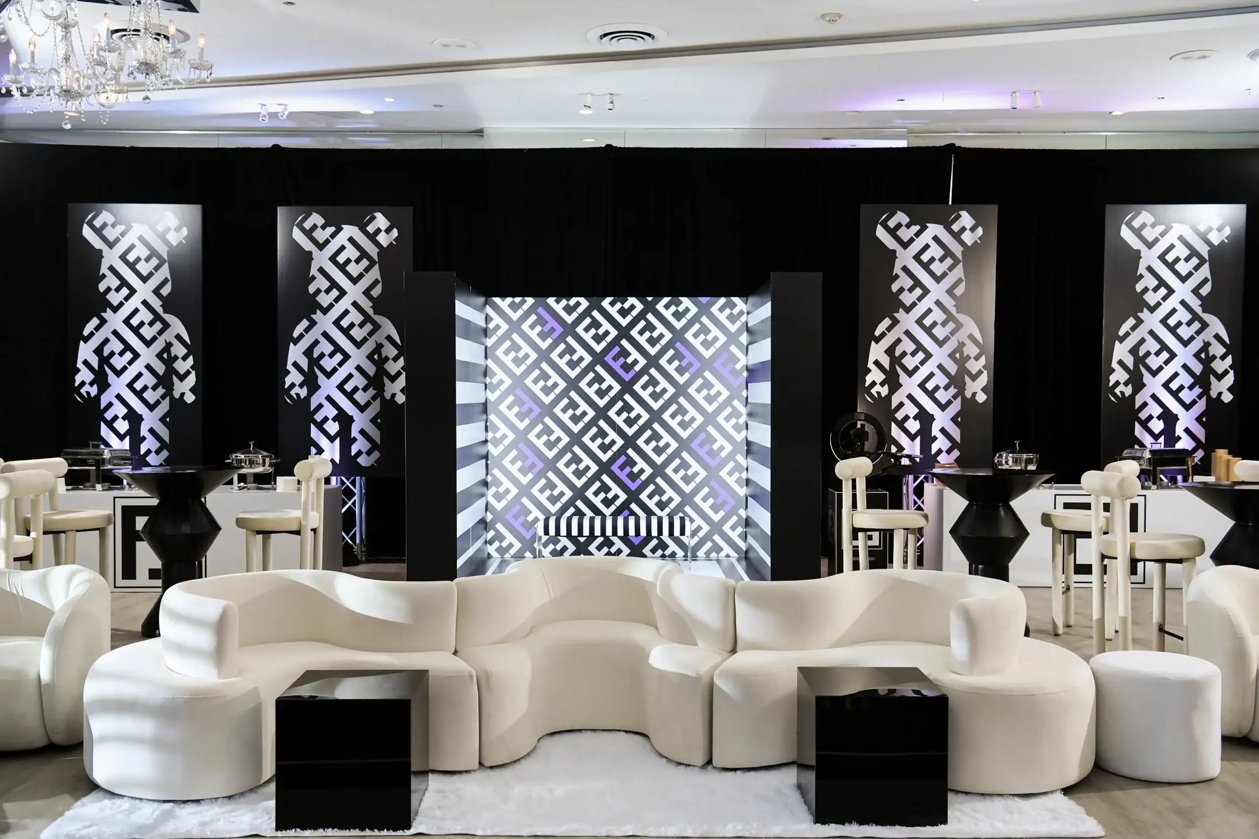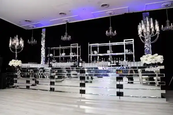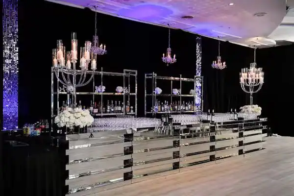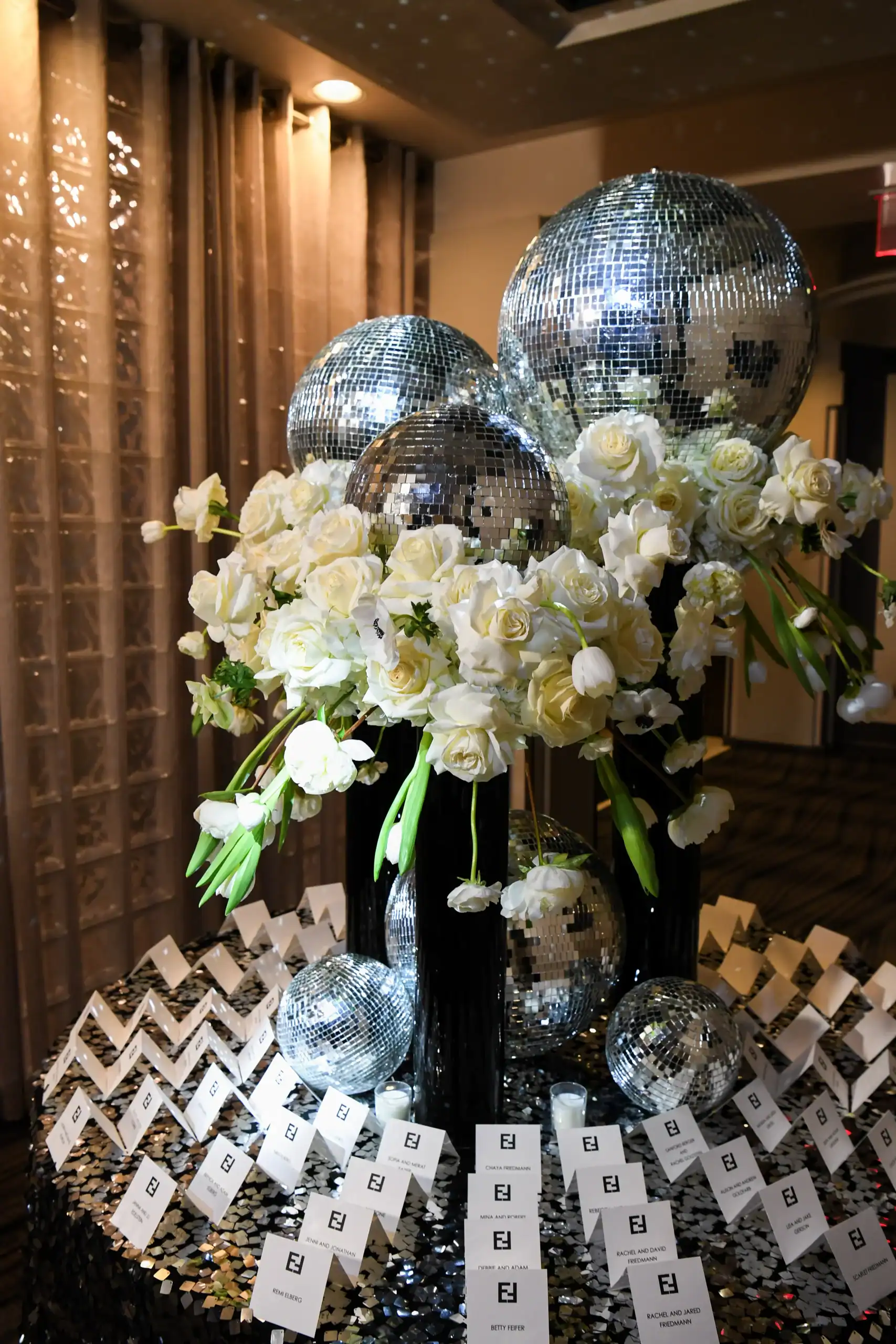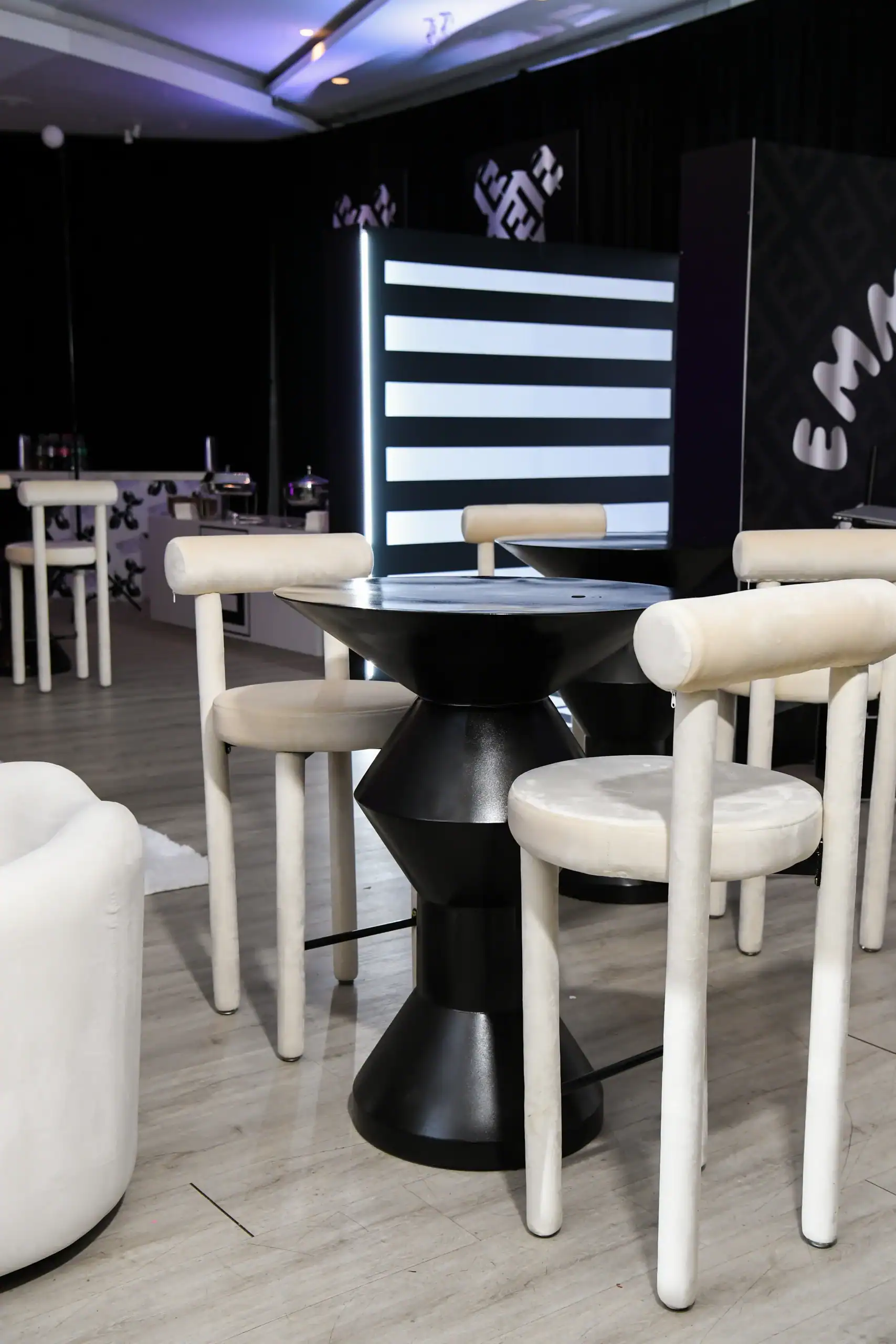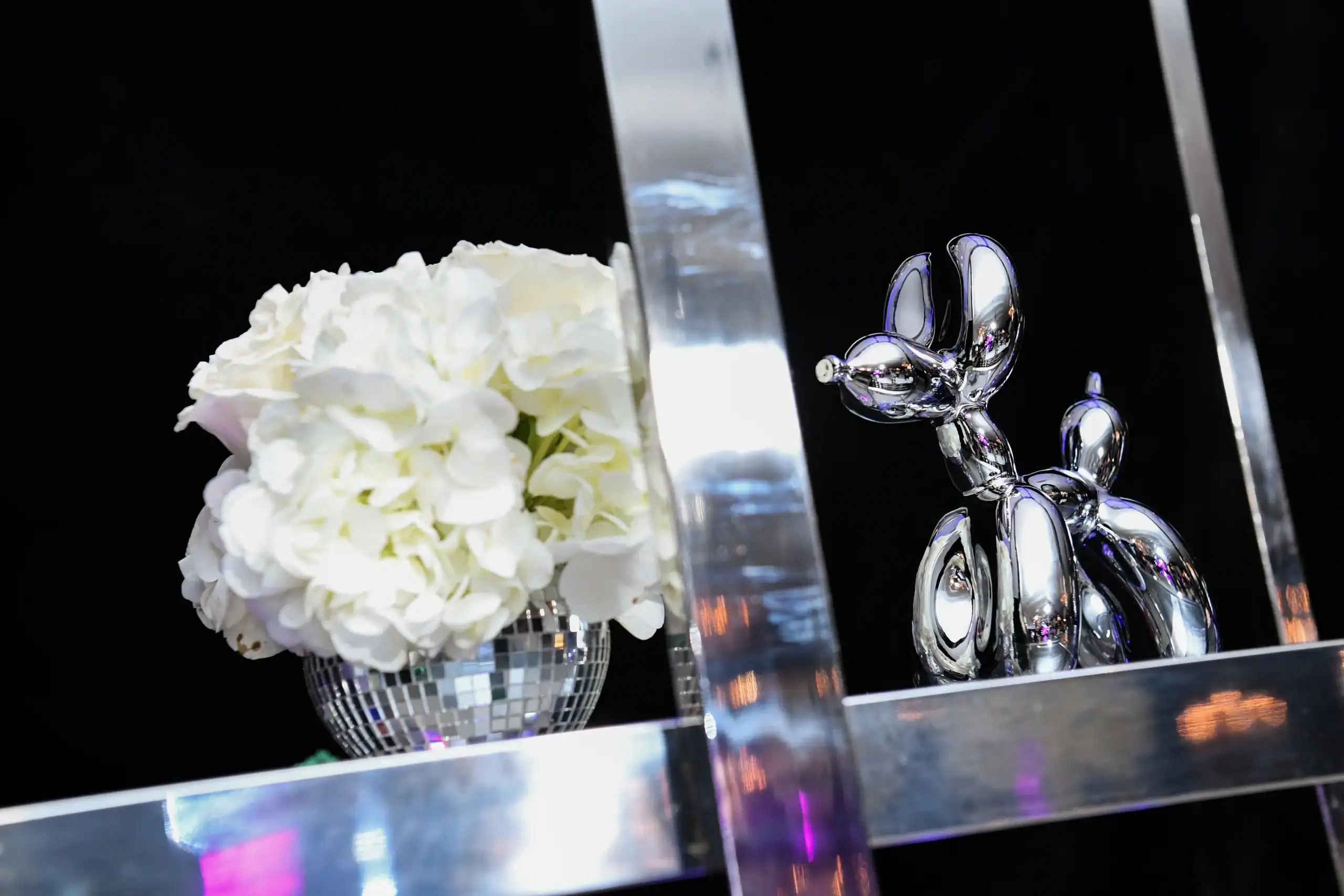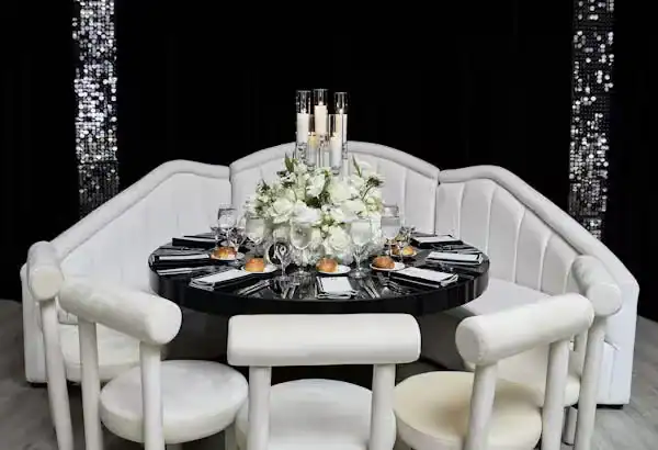 Debbie Hart and her team achieved the desired “wow” factor, infusing the ballroom with sophistication and glamour. Skillfully incorporated striking modern elements, playing with black and white tones alongside accents of chrome and mirrors. Plush velvet furniture and a contemporary acrylic dance floor set the scene, while oversized metallic balloons, chic candelabras, and avant-garde white rose centerpieces added the finishing touches. The result was a captivating space that seamlessly blended luxury, glamour, and a modern flair, ensuring an unforgettable experience for all the guests that came to celebrate.