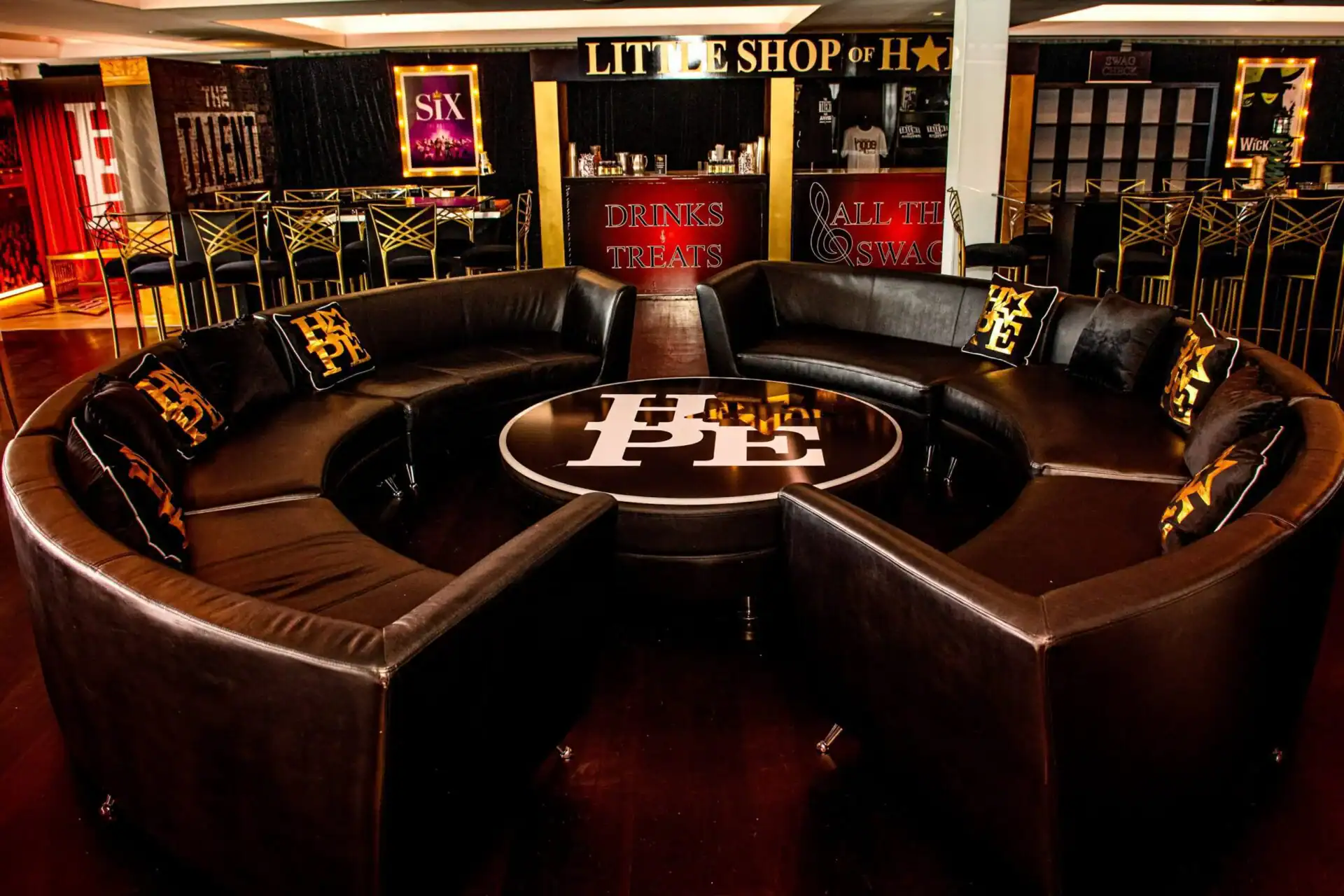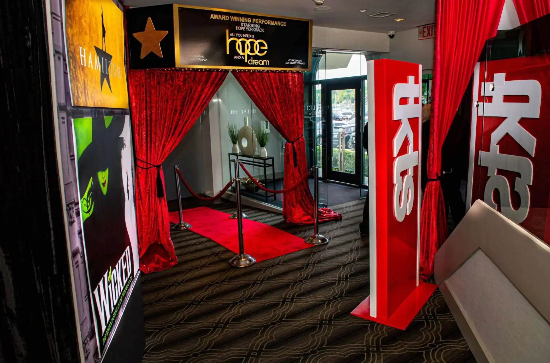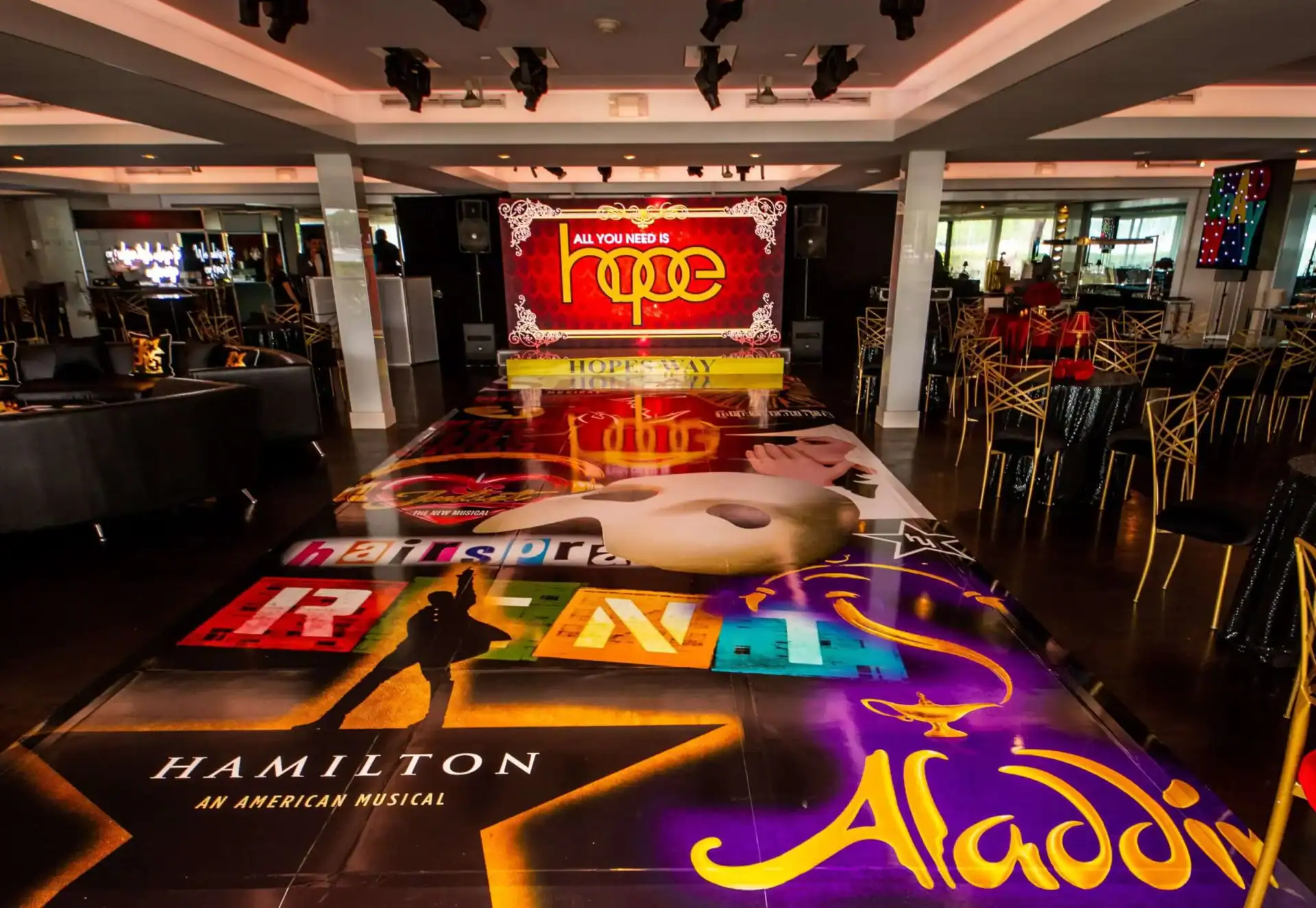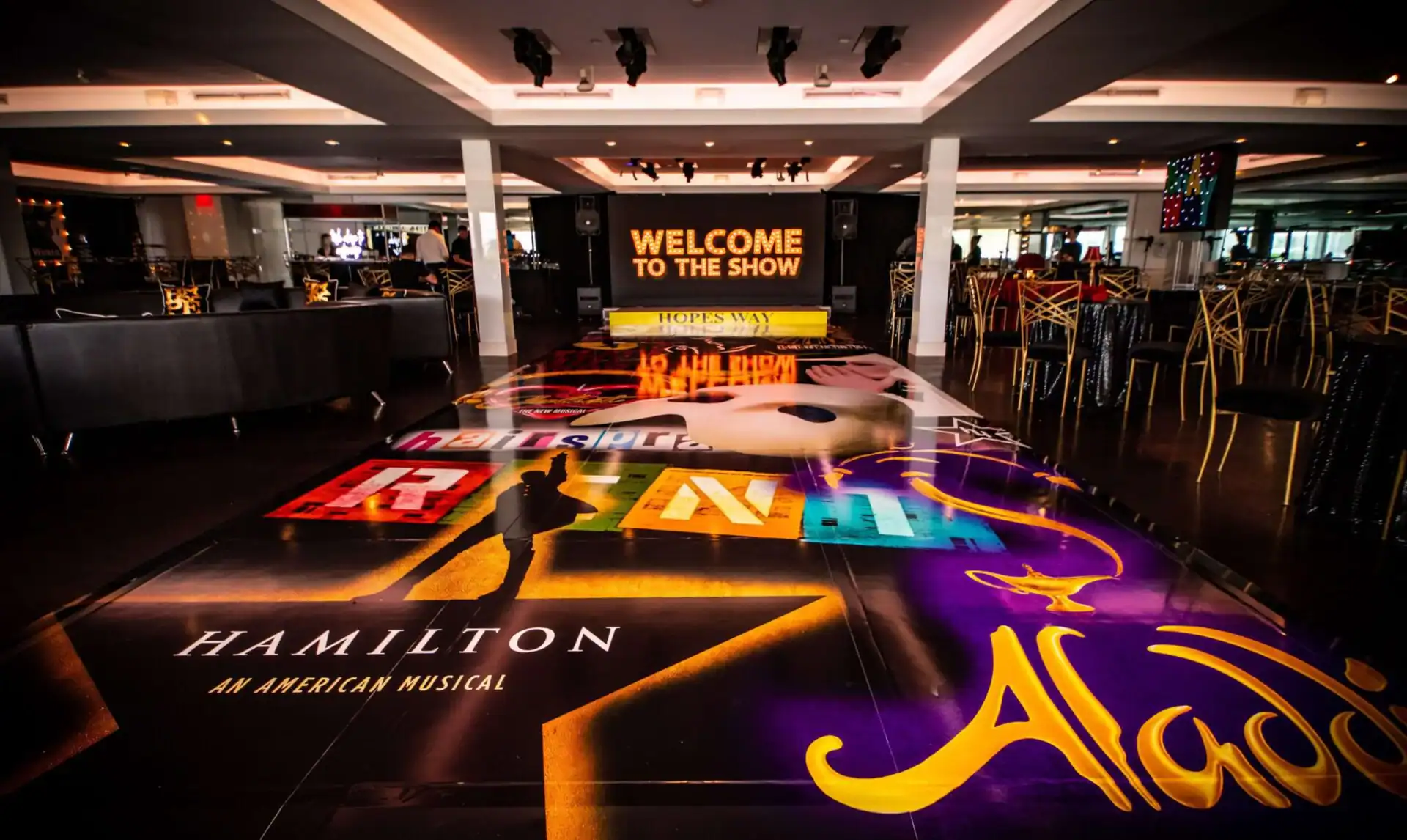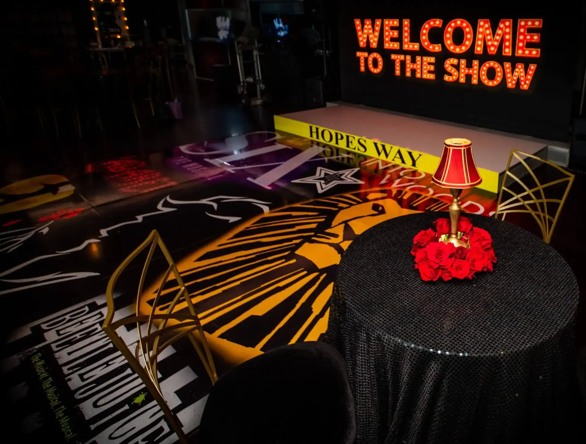 Debbie Hart an expert event planner, designed a stunning Bat Mitzvah Tribute to Broadway, featuring a rich color palette of deep reds, luxurious black velvet textures, and abundant golden accents. The Event space was adorned with over sized broadway show billboards, creating a vibrant ambiance reminiscent of a night out on broadway in the Great Theatre. Guests were treated to broadways finest offerings, including the marquee entry, a swag filled gift shop, an immersive photo booth experience , and a custom wrapped dance floor. Without a doubt it was the hottest ticket in town.