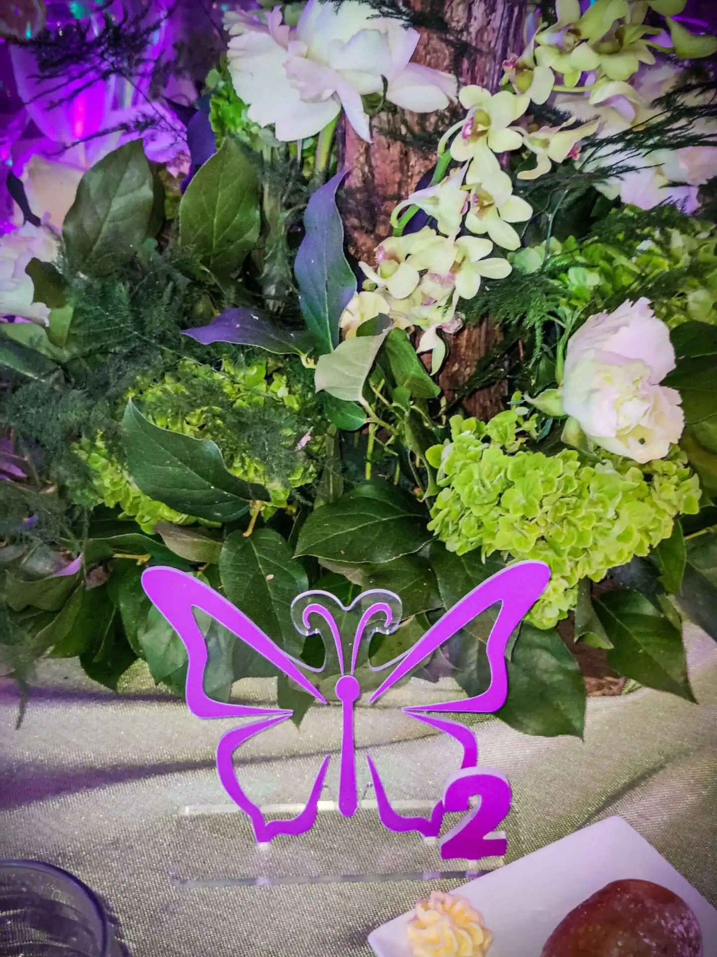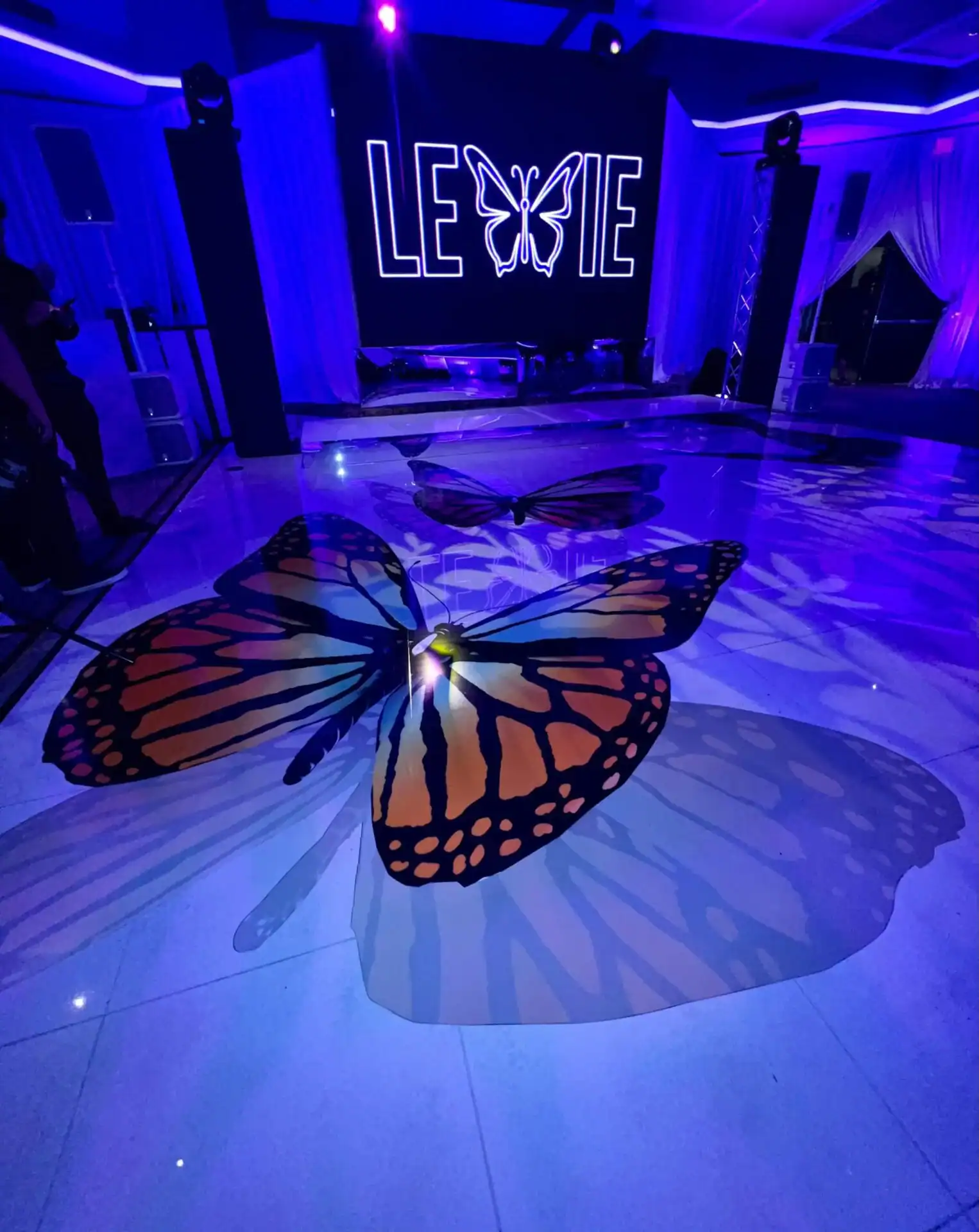 Our centerpiece giants, fashioned from trees, were a breathtaking sight to behold. Adorned with hundreds of twinkling tea lights and glass globes, they stood as majestic sentinels of elegance. We artfully melded the girl’s personal logo, binding it together to craft a fabulous “glamifly” bar that left guests in awe. As they reveled in the festivities, it felt as if they were soaring and twirling in harmony with the colossal butterflies on a one-of-a-kind custom-wrapped dance floor.