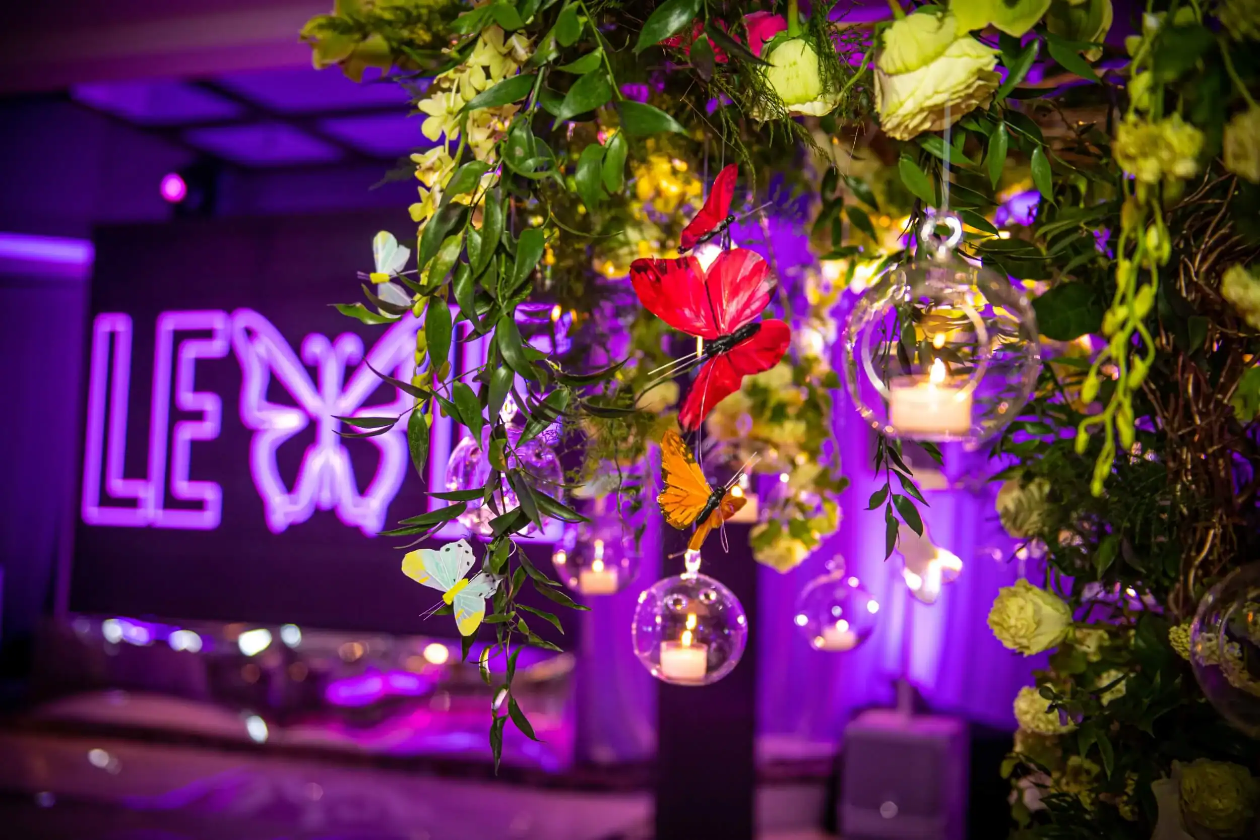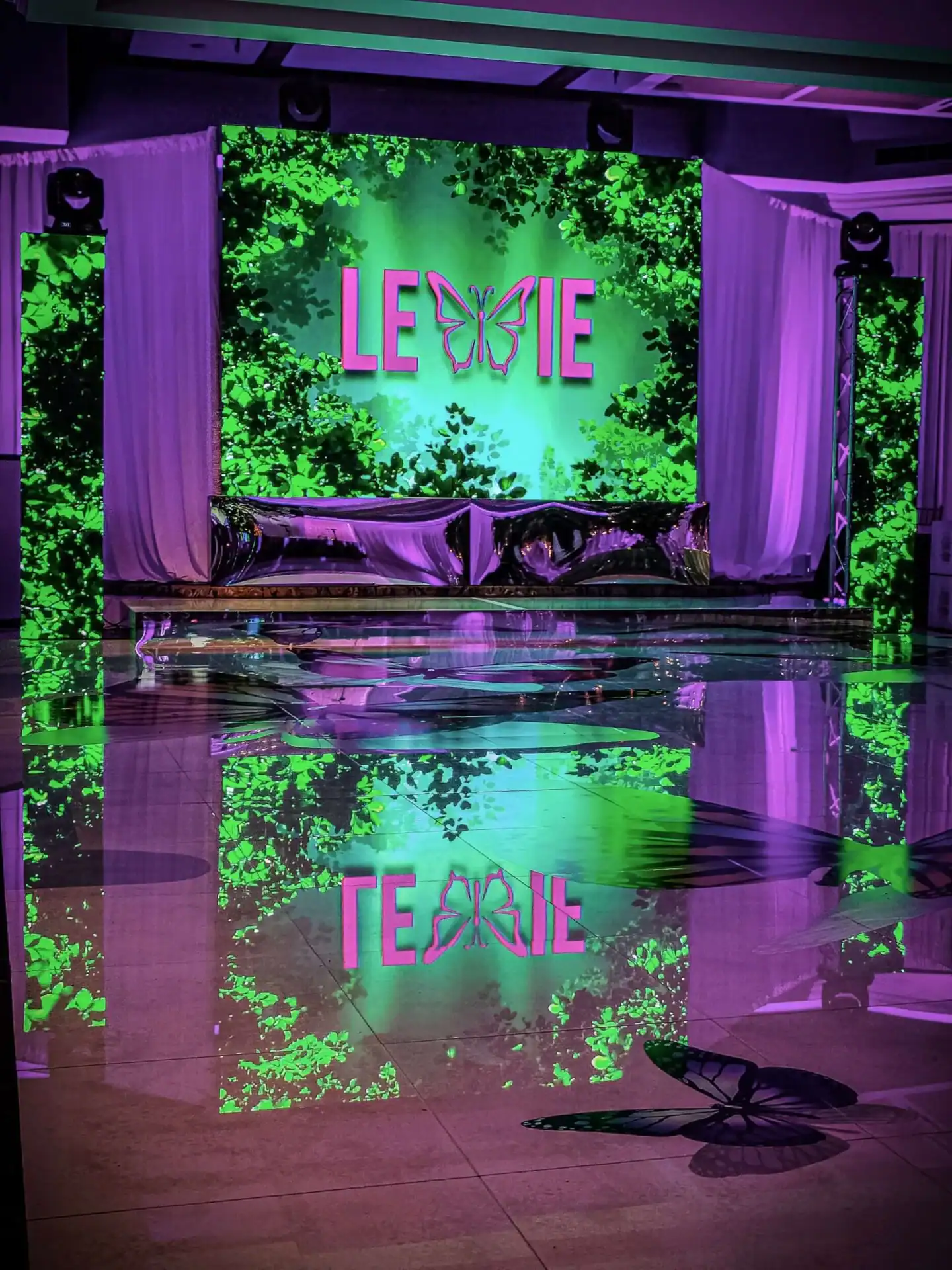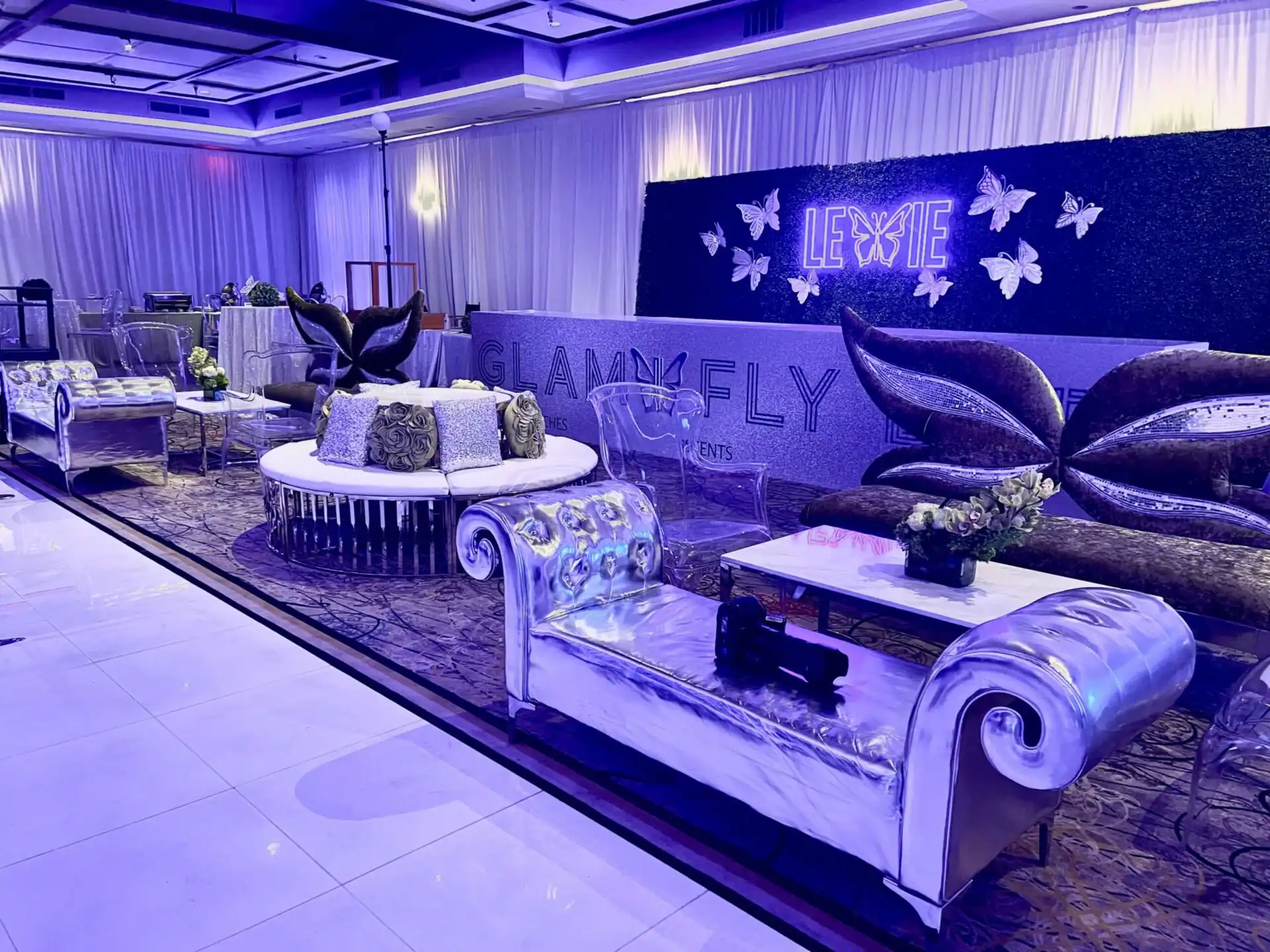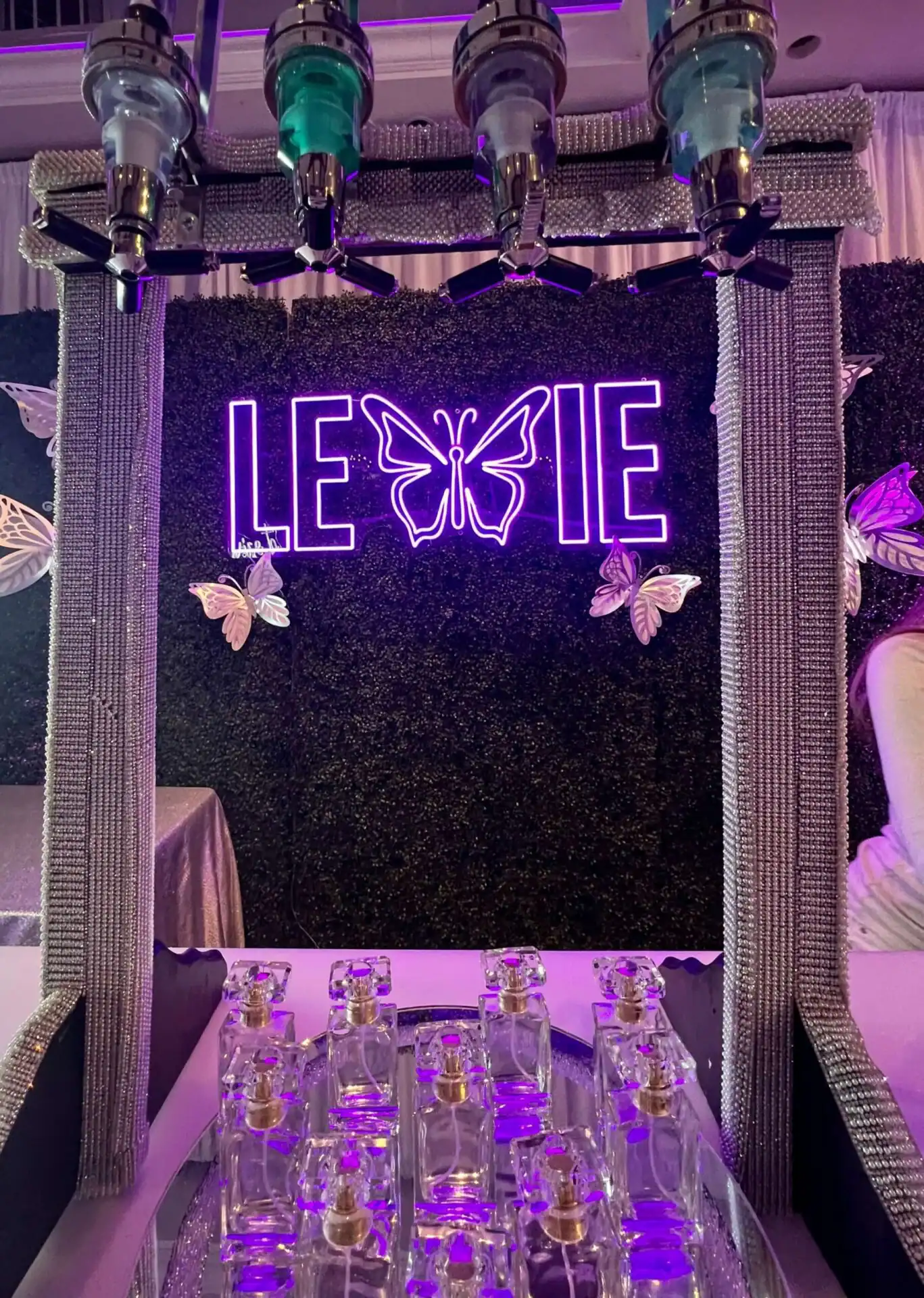 The talents of the Debbie Hart Celebrations team knew no bounds, as they conjured a magnificent purple mirrored 360-degree bar. Even as guests savored their cocktails, they were treated to the mesmerizing reflection of the butterflies from the dance floor. The video wall, a tapestry of custom graphics, provided the perfect backdrop to showcase the girl’s name and personal branding.