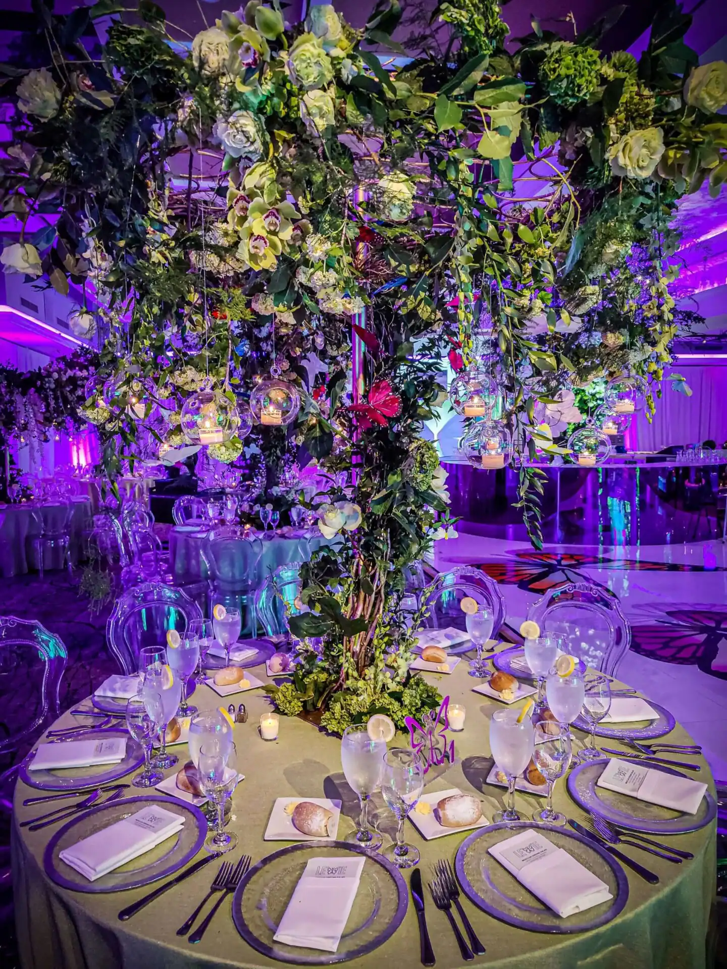 We drew inspiration from the bat mitzvah girl’s deep love for butterflies and the enchanting beauty of nature. With unwavering creativity, we transformed a mere dream into a tangible and enchanting reality. Picture an exquisite soiree that unfurled like a butterfly’s delicate wing, with a palette of lush greens, shimmering silvers, and regal purples. Hundreds of these ethereal creatures adorned every nook and cranny, from the very moment you crossed the threshold of the iron gates. They dangled gracefully from the winding vines and ancient, towering trees, as if nature itself had orchestrated this grand spectacle.