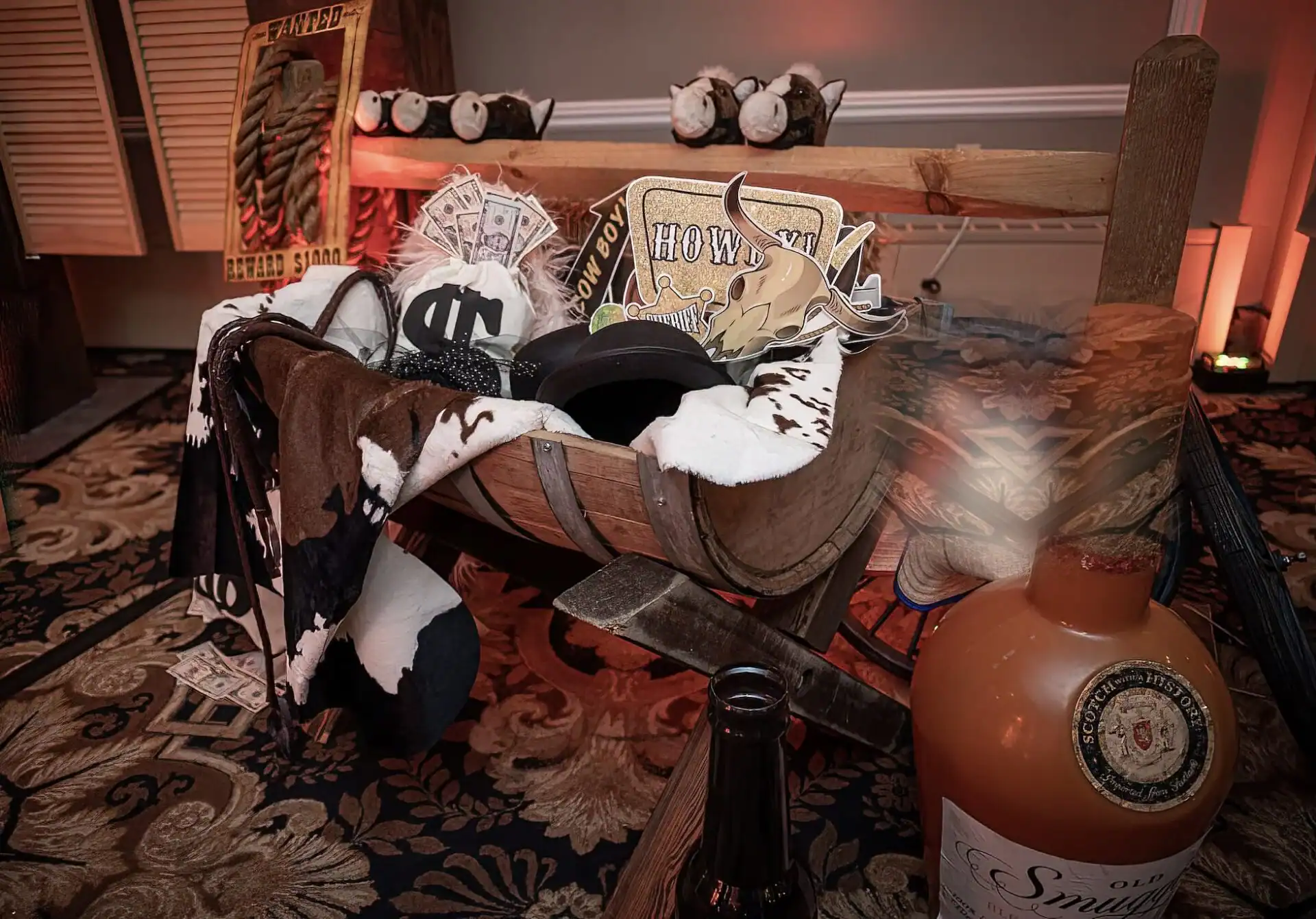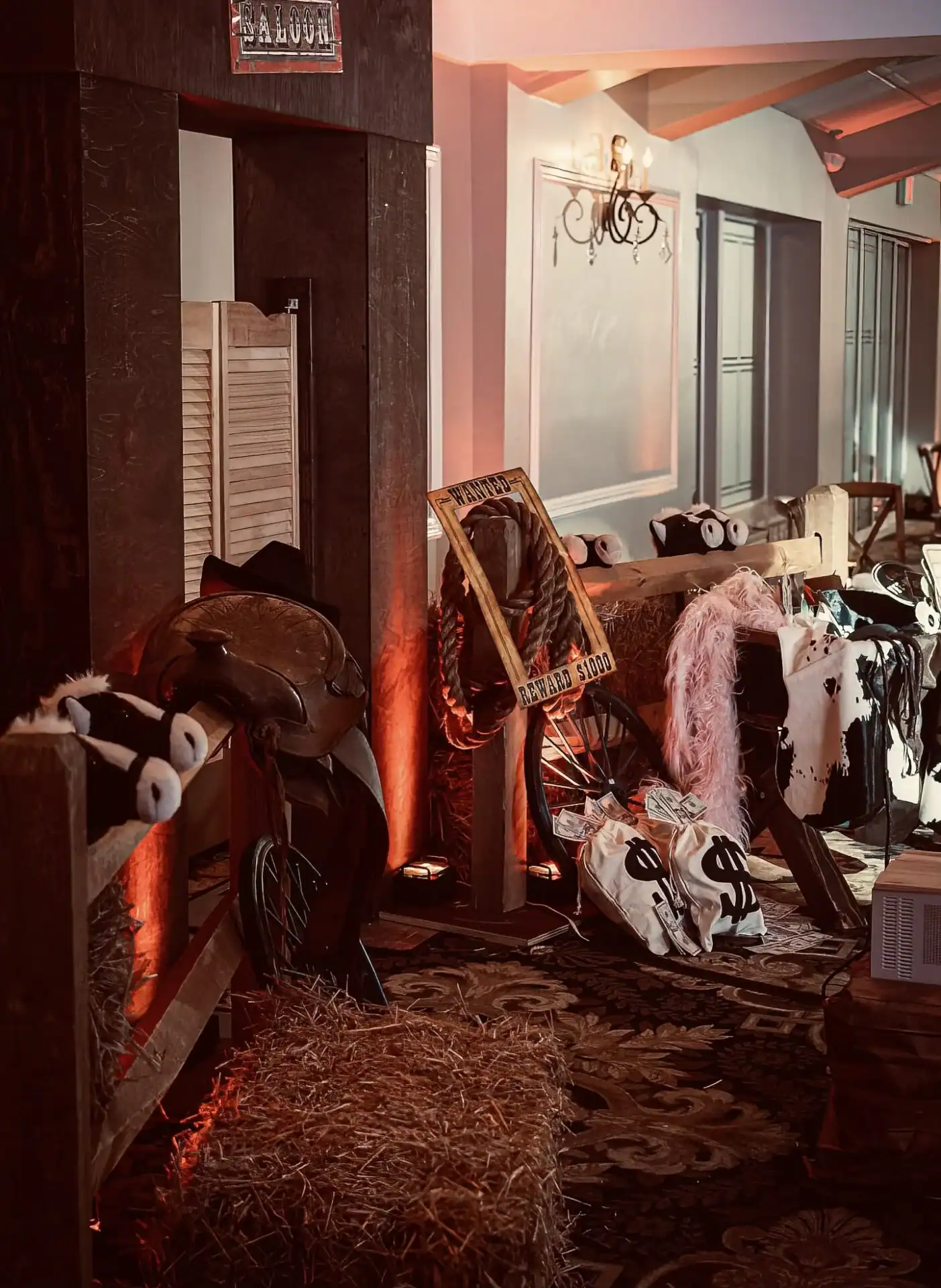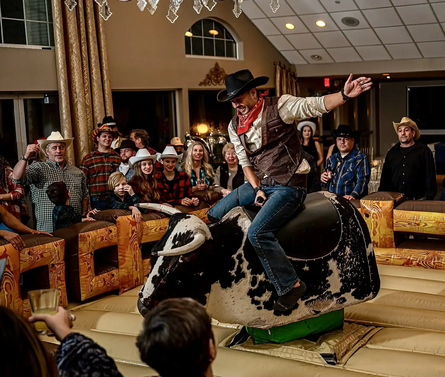 This Collaboration from Debbie Hart Celebrations and Richie Hart Events was a unique twist on a traditional costume party. As they wanted to make this New Year’s Day birthday party festive and fun; but still creating a feeling of “glam” for the end of the Holiday season. In creating this theme. Farm tables, barrels and stools we used, along with denim jute cloths and rhinestone napkin rings with red bandanas. Rustic Floral arrangements for the tables and the Bars were designed to add to the feeling that you were partying in a western saloon. Special Themed performers entertained the guests. As the highlight of the night was the Mechanical Bull.