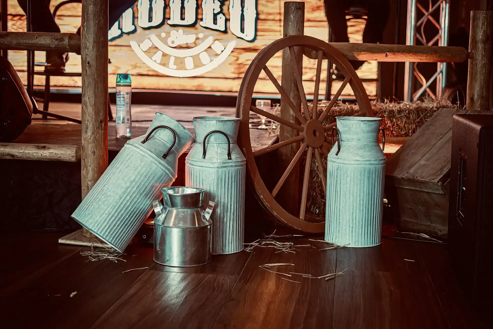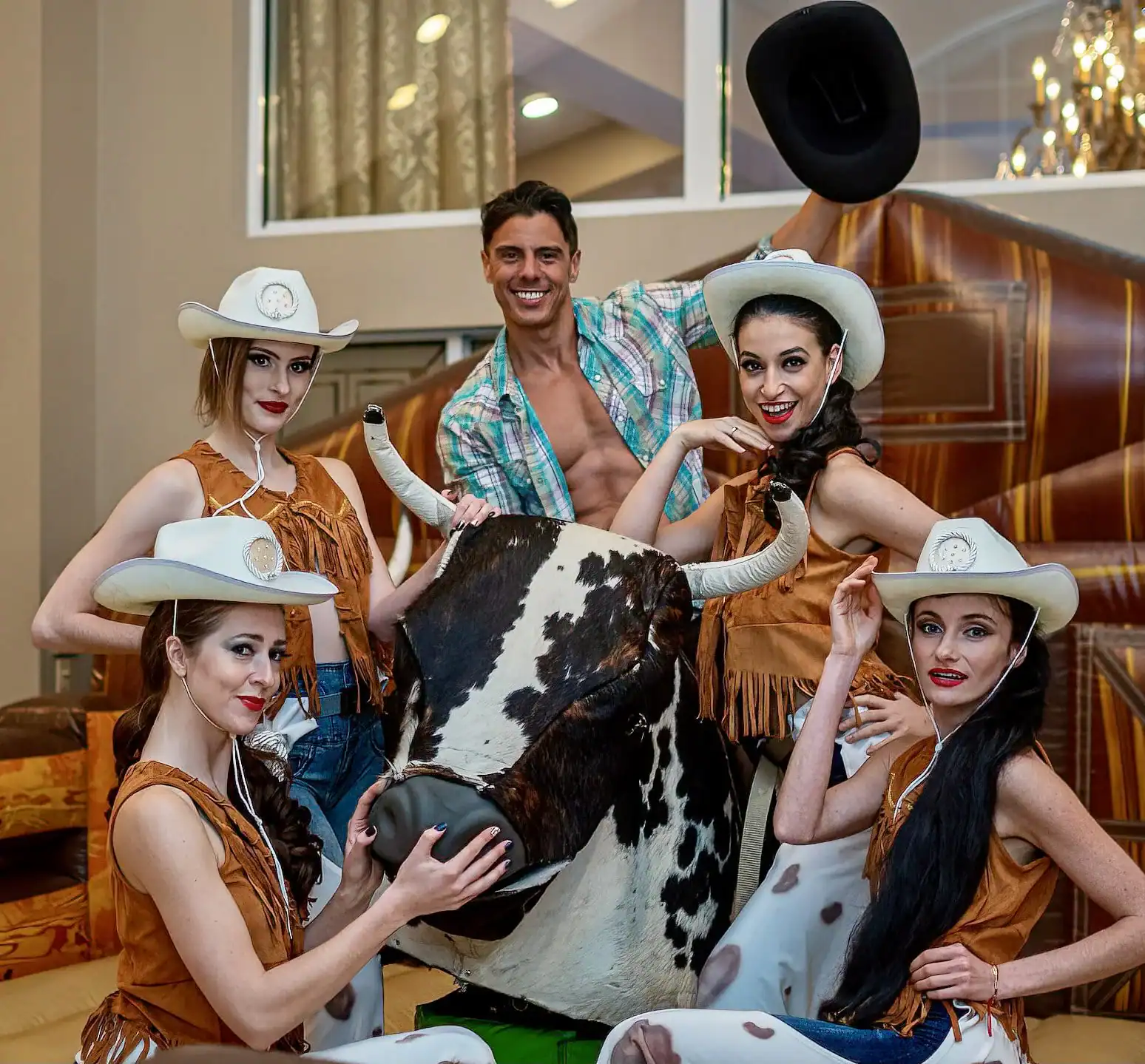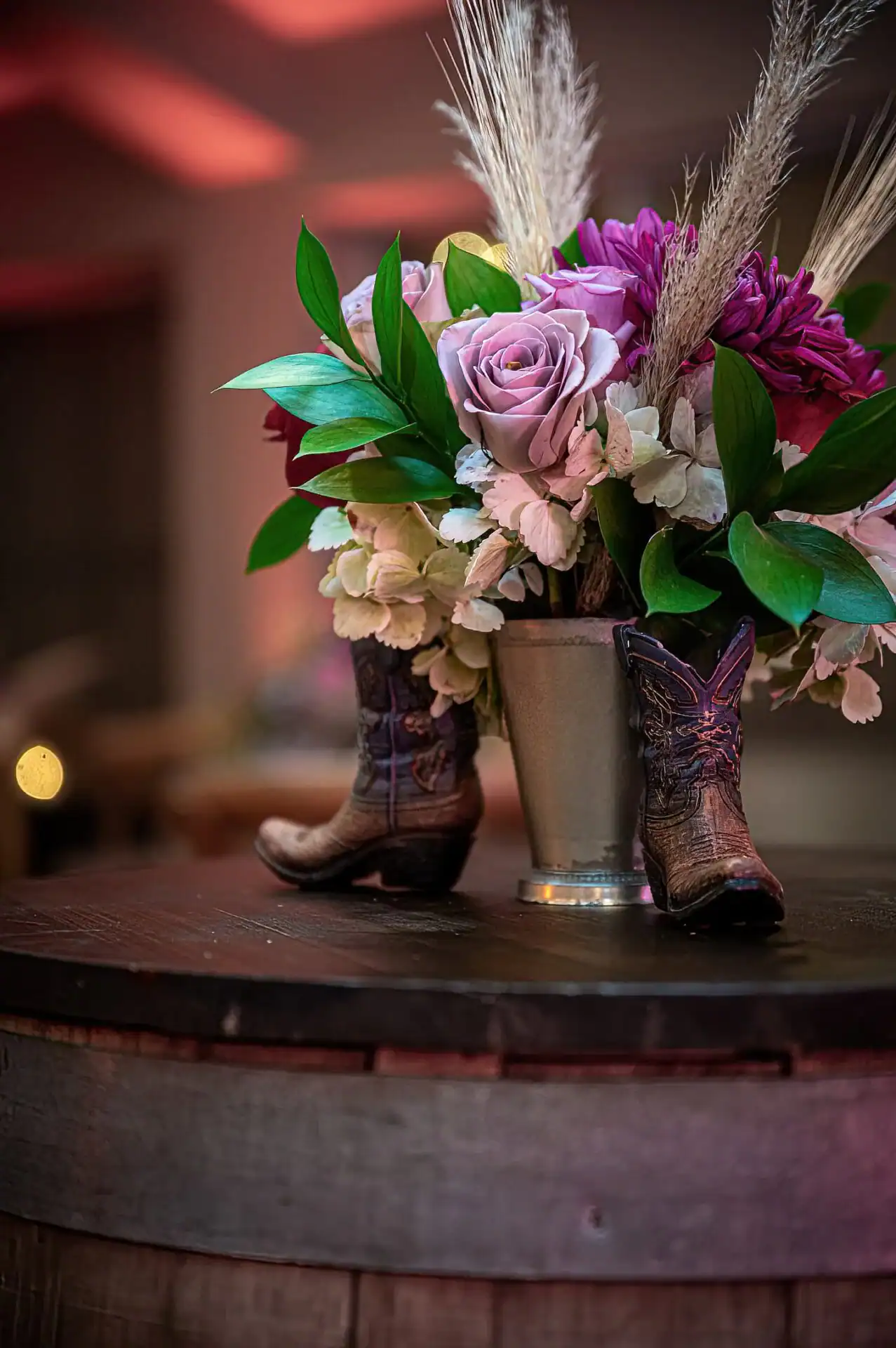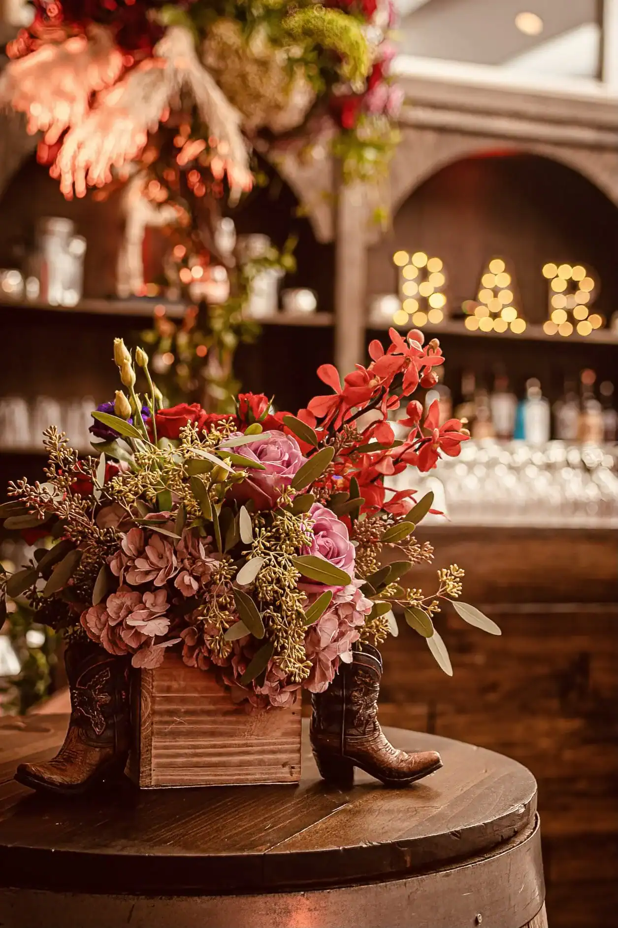 This Collaboration from Debbie Hart Celebrations and Richie Hart Events was a unique twist on a traditional costume party. As they wanted to make this New Year’s Day birthday party festive and fun; but still creating a feeling of “glam” for the end of the Holiday season. In creating this theme. Farm tables, barrels and stools we used, along with denim jute cloths and rhinestone napkin rings with red bandanas. Rustic Floral arrangements for the tables and the Bars were designed to add to the feeling that you were partying in a western saloon. Special Themed performers entertained the guests. As the highlight of the night was the Mechanical Bull.