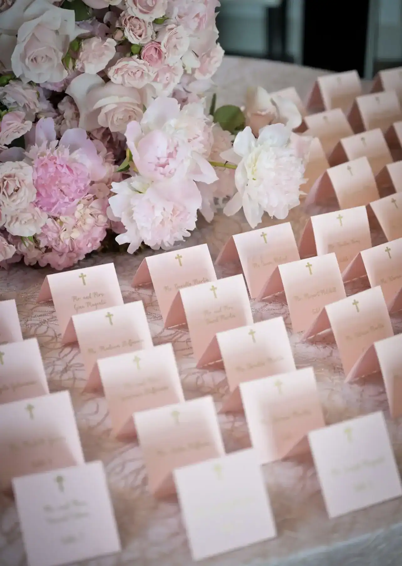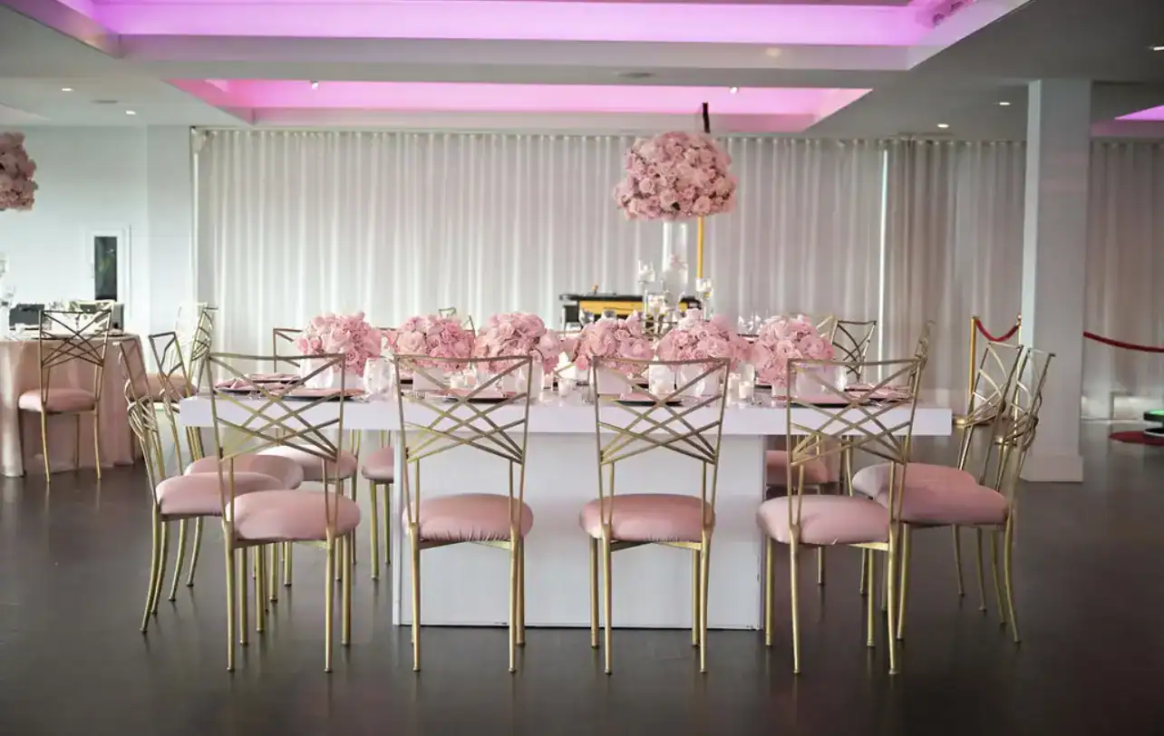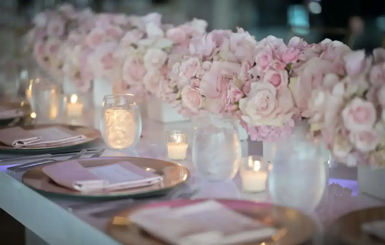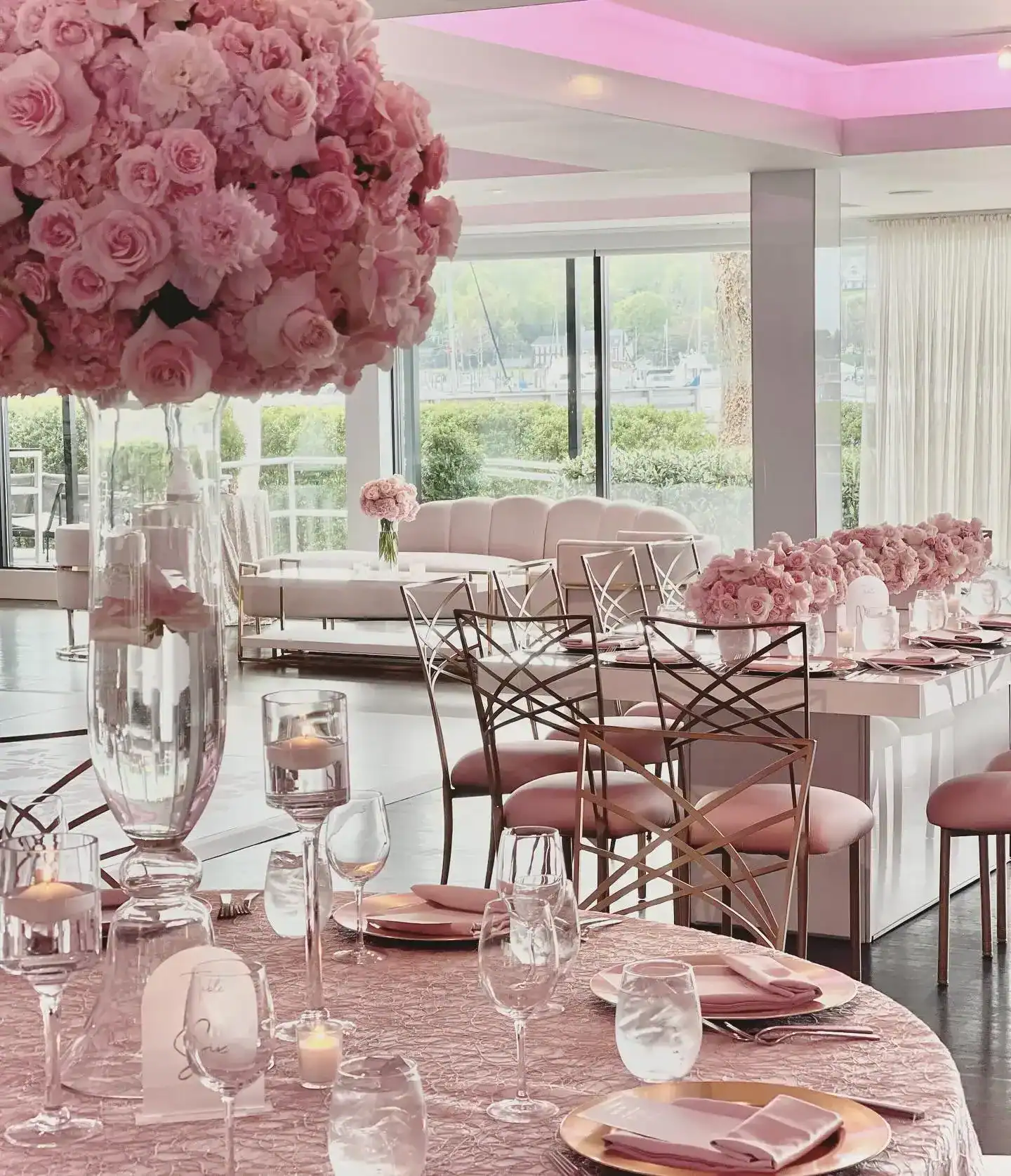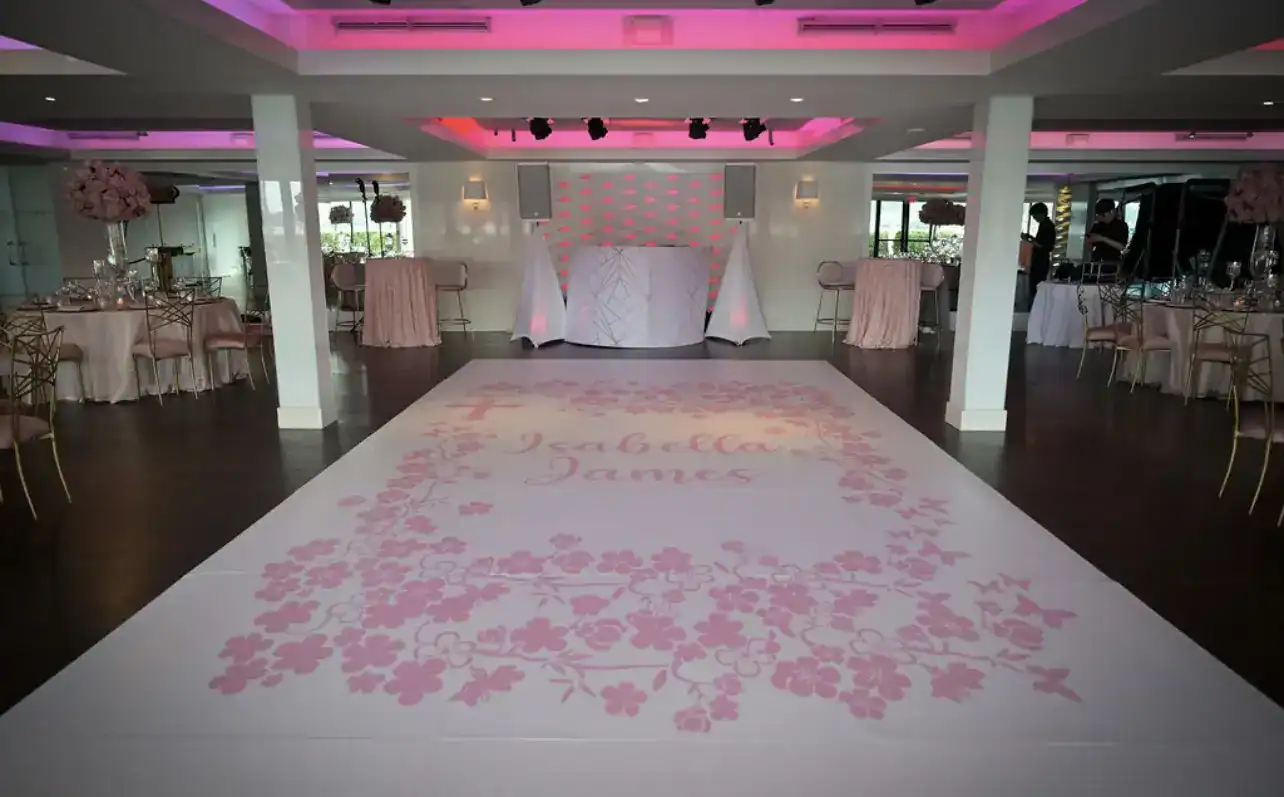 Debbie Hart knew her client loved flowers, especially pink ones. For this special occasion, she aimed to create an elegant and modern atmosphere, using gold and white as complementary colors to make the room shine. In the entry area, an enormous tree-like floral arrangement with hanging candle-lit globes was constructed as a stunning “wow” factor for guests as they arrived. For the cocktail hour, guests enjoyed both indoor and outdoor settings overlooking the water. Small pink bouquets in glass cases adorned each table. For the reception, Debbie designed a floor plan ensuring that every table was a great table. She brought in two rectangular white acrylic tables for the kids, seating 14 at each, with a runner of low pink garden roses and votives as the centerpiece. The remaining tables were round, seating between 8-12 guests at each, draped in pale pink and gold-embroidered linens. High centerpieces of pink garden roses, hydrangeas, and peonies added to the elegance. Debbie also designed the graphic for the white-wrapped dance floor, featuring a beautiful floral border and the guest of honor’s name in the center. Every detail was precise, and the entire event was executed to perfection.