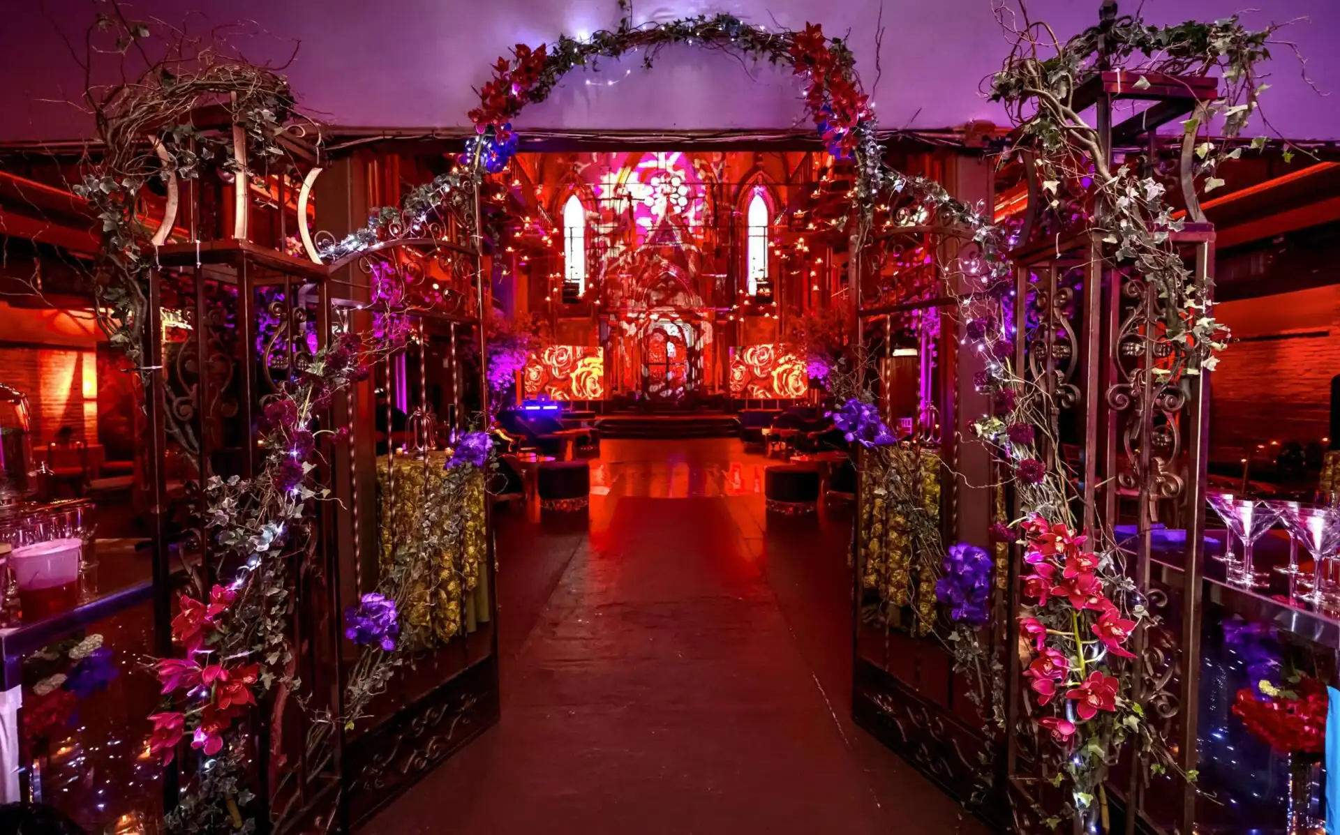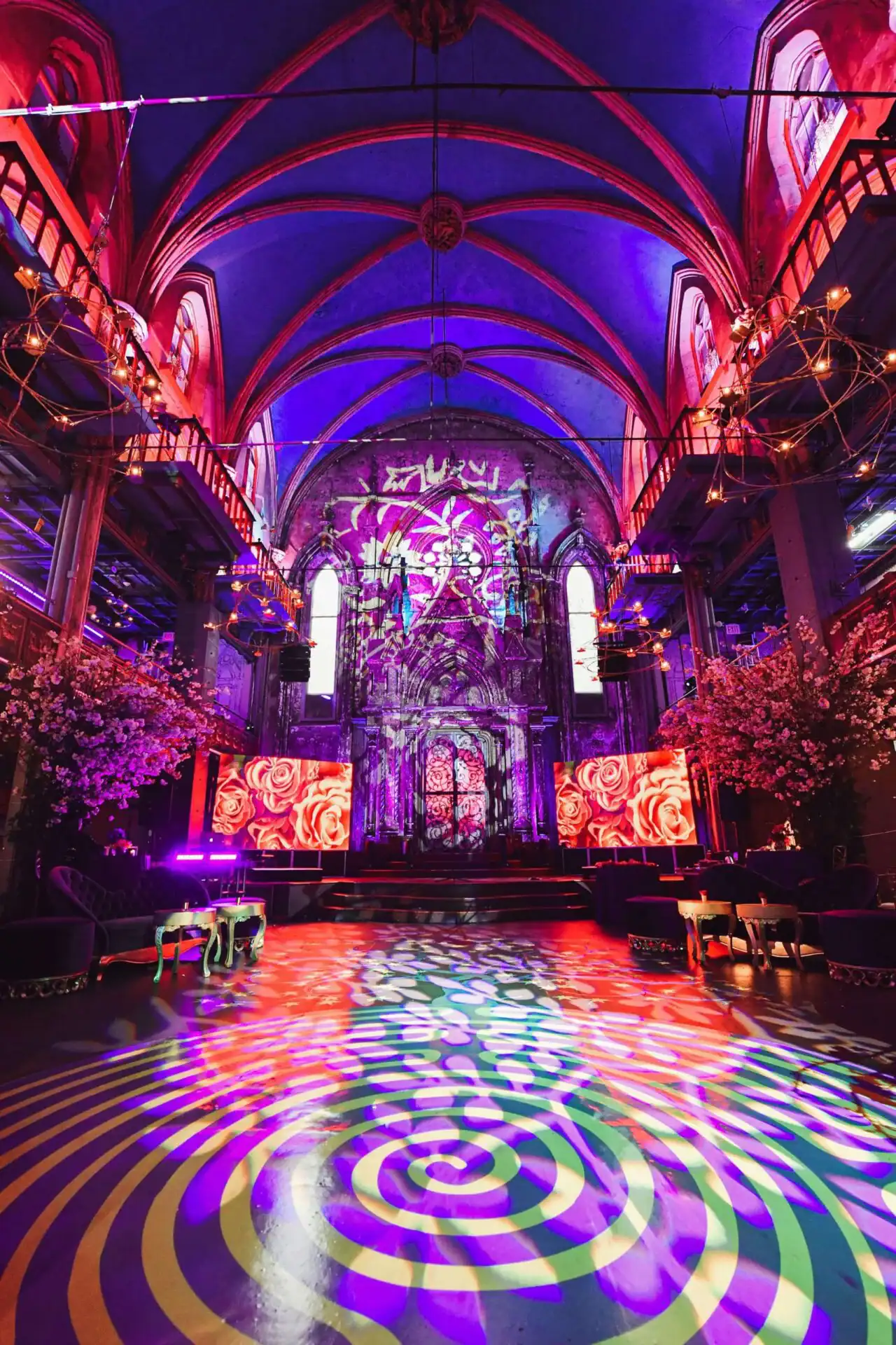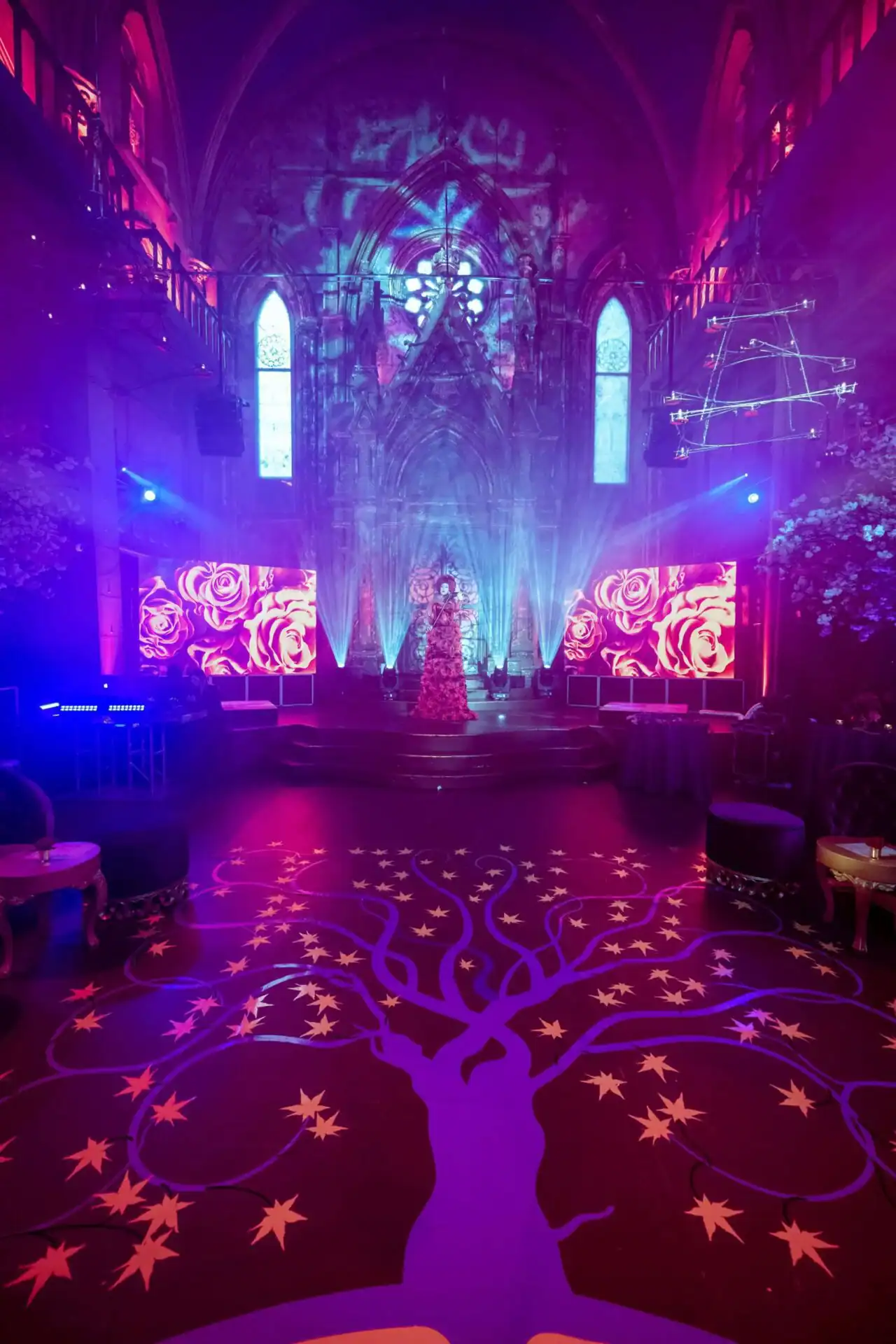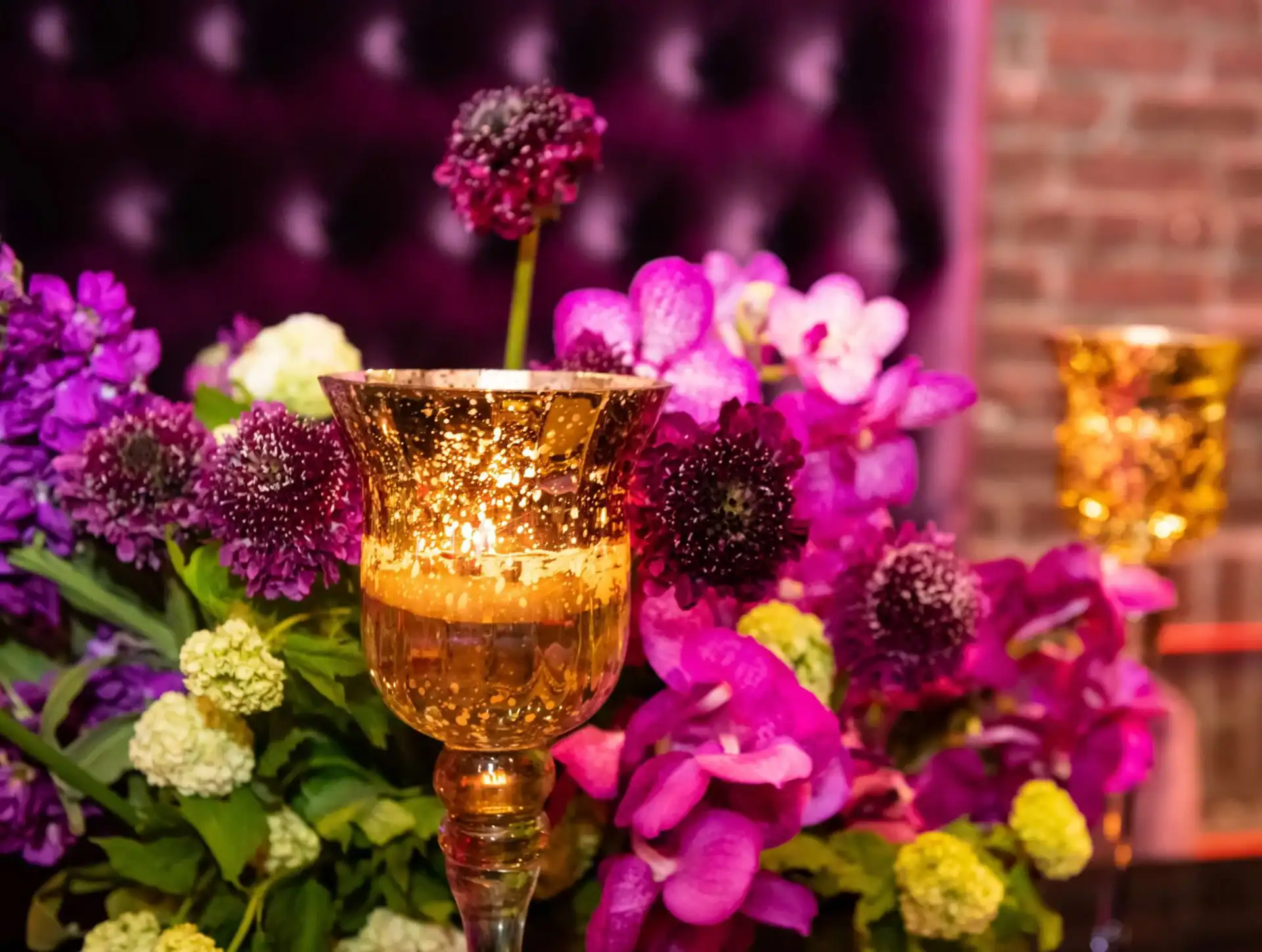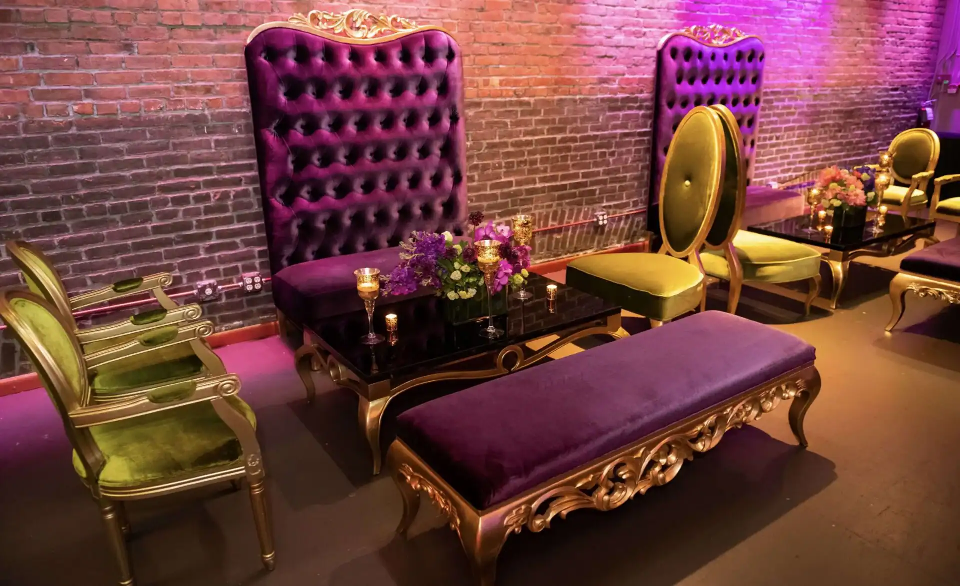 But the excitement didn’t stop there. Trumpeters heralded guests down the candlelit gates into a realm of wonder. Twelve-foot cherry trees adorned with twinkling lights and jewel-toned florals illuminated the space. Purple and olive green velvet furnishings with gold tables added luxurious touches while giant video screens brought the theme to life.