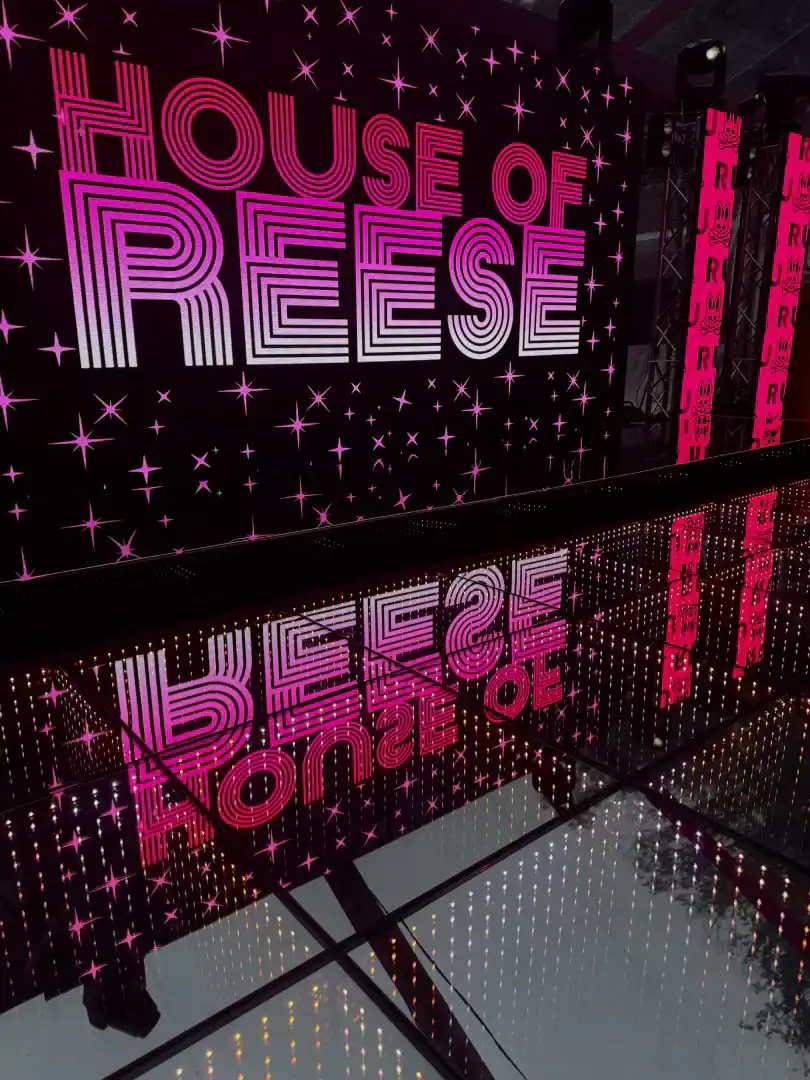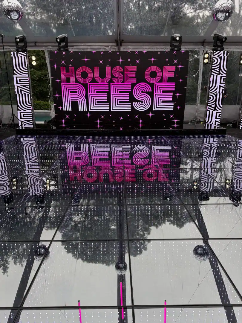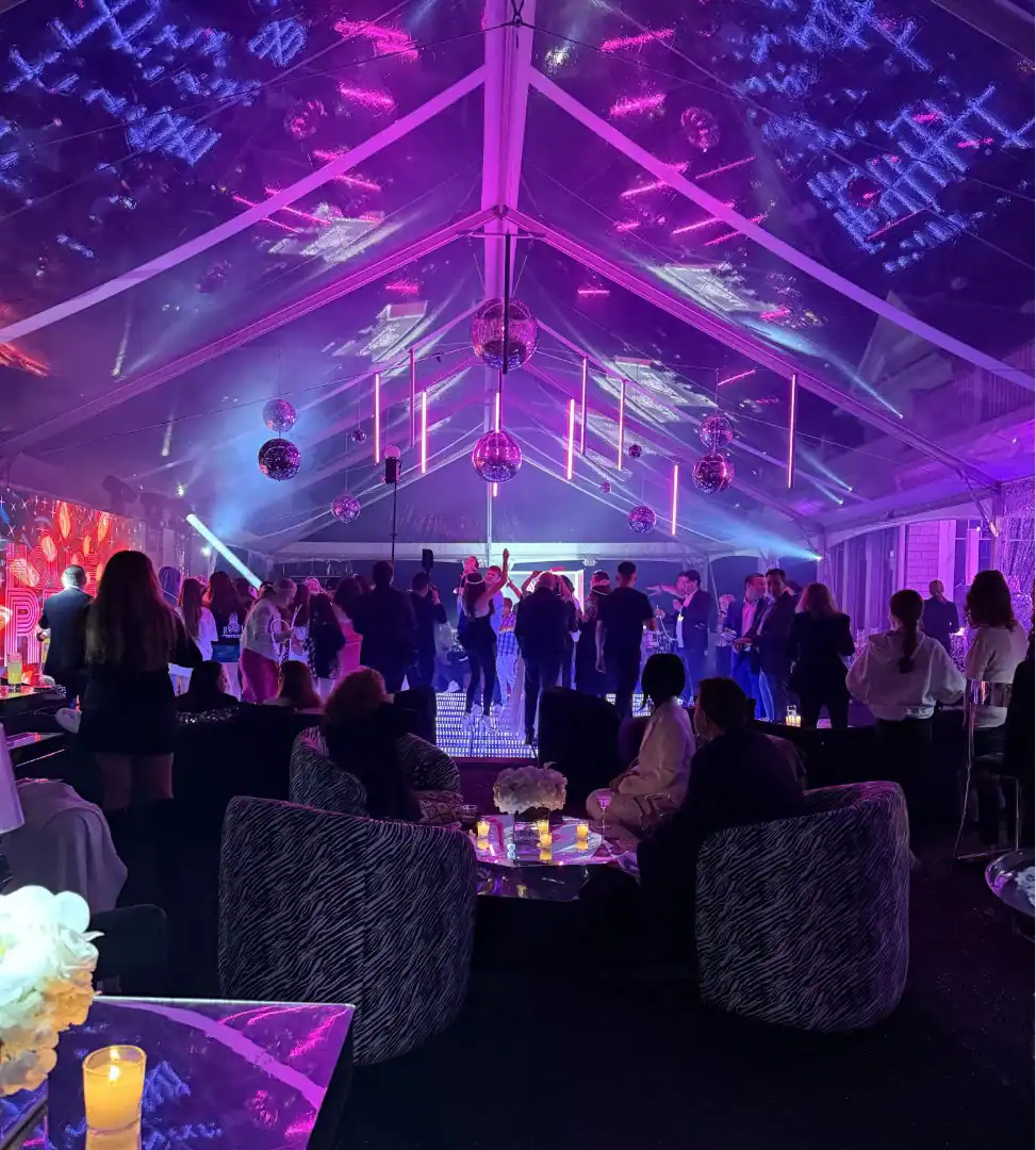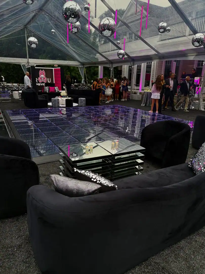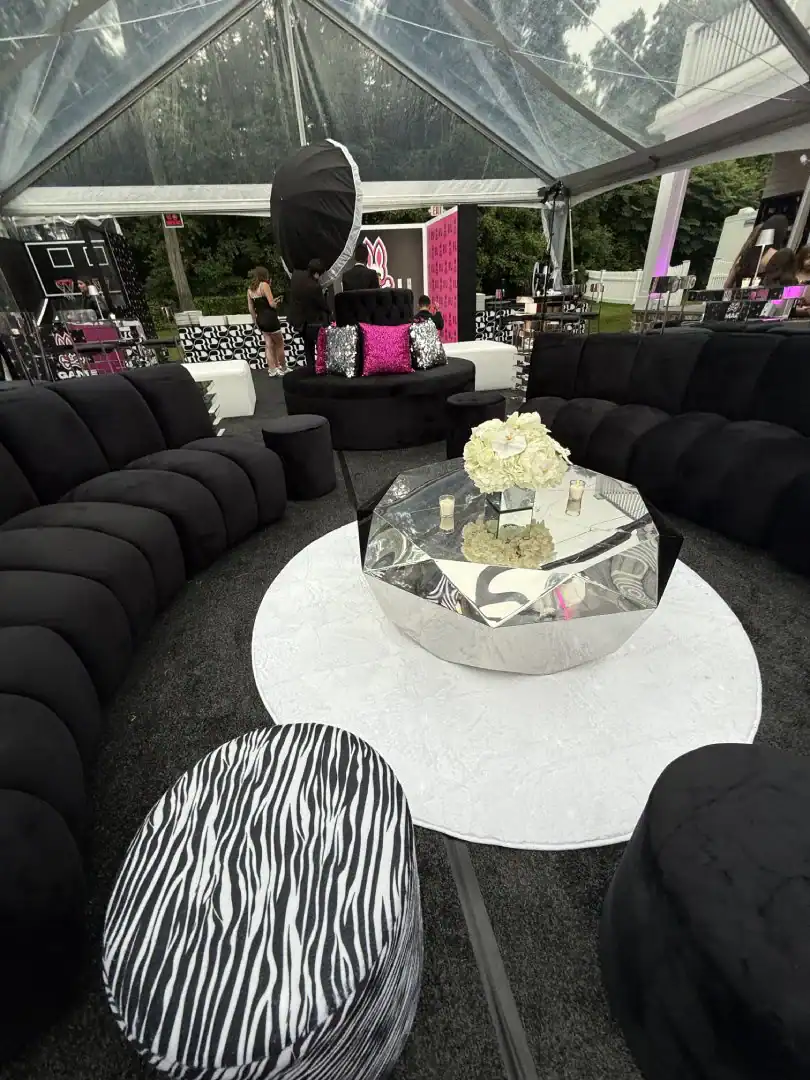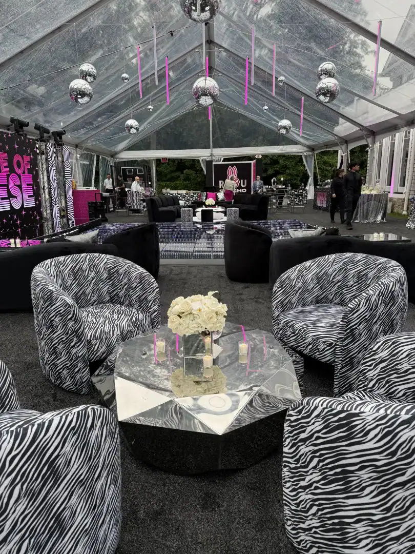 Creating a celebration in a tent can be glamorous—but pulling it all together, from catering to décor, is an art. For this event, Debbie’s client envisioned the feeling of stepping into an outdoor club, where guests could soak in the beauty of the grounds, watch the sunset, and dance under a sky full of stars. Debbie set the scene with a chic palette of black and white accented by a bold pop of hot pink—kid-friendly but with an adult sophistication. As guests arrived, valets welcomed them to “The House of Reese.” They entered through a sleek black-and-white hallway glowing with hot pink up-lights, and when the double French doors swung open, the transformation was complete: a nightclub under the tent, shimmering with disco balls overhead, dramatic lighting from every angle, and video walls with custom graphics that made the space extraordinary. In addition to the packed dance floor, a custom-designed pickle-ball court offered a playful twist for those ready to mix things up. From start to finish, it was a high-energy, over-the-top night where everyone just went Psycho!