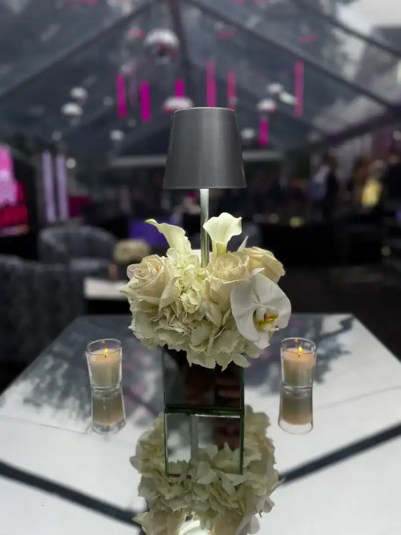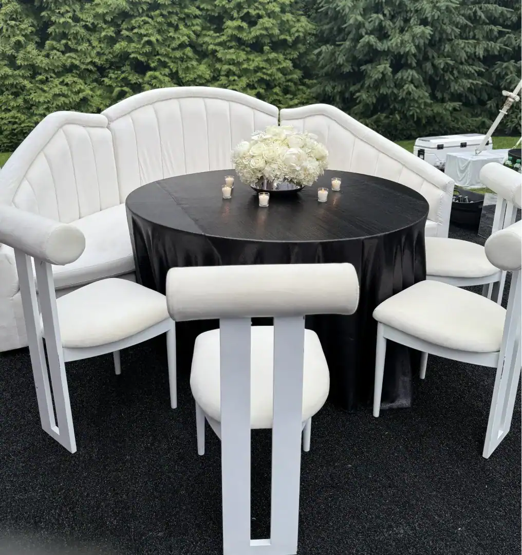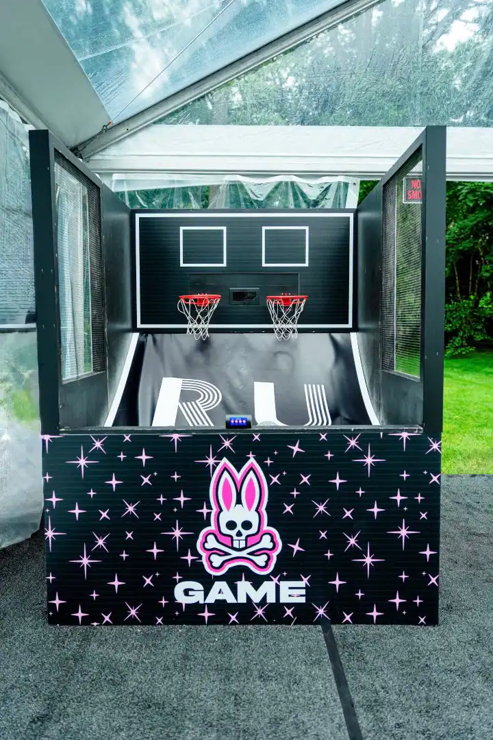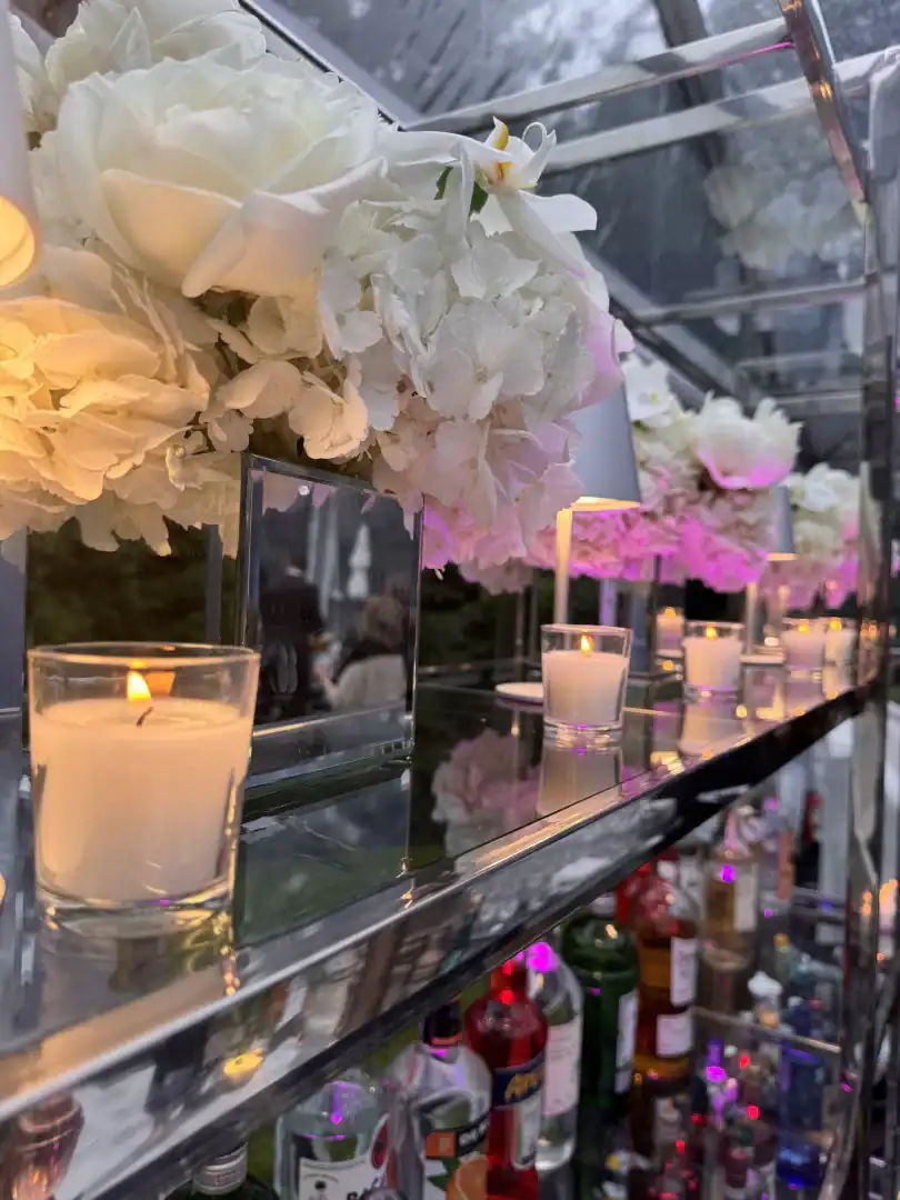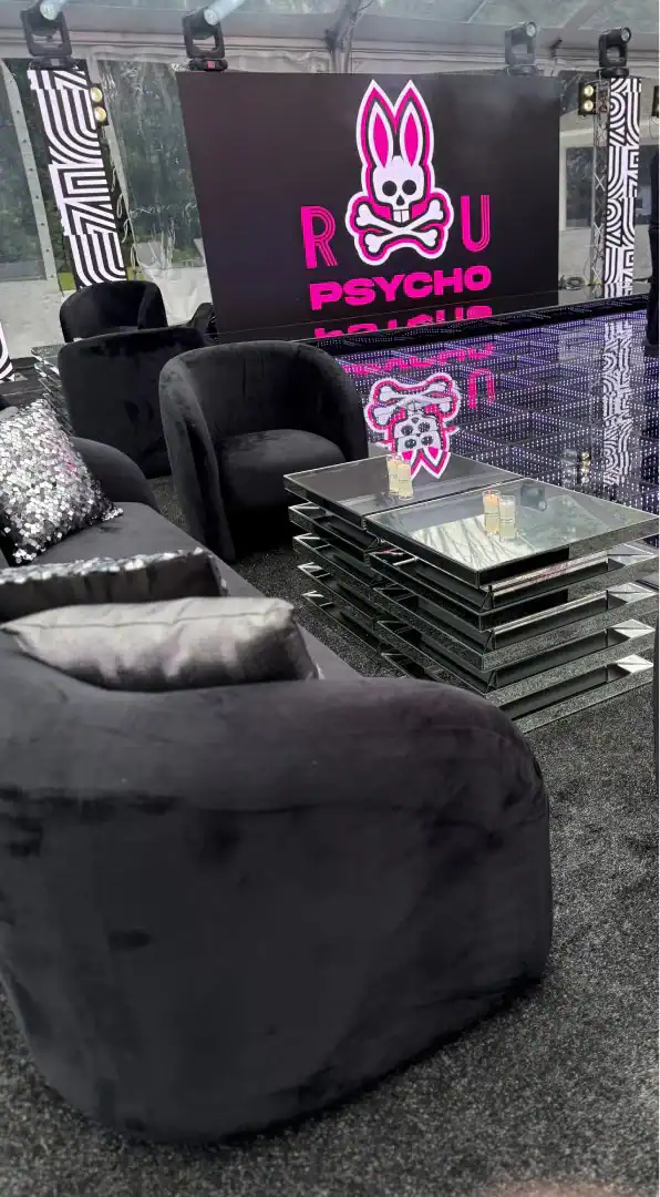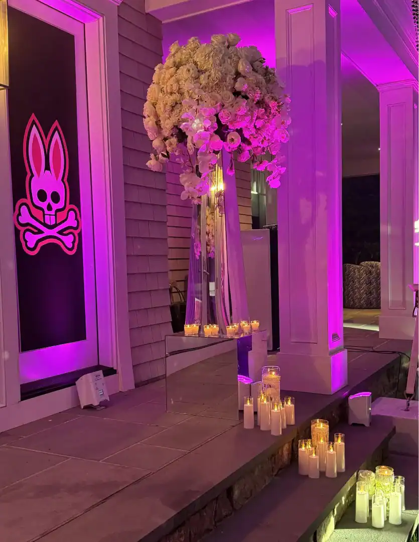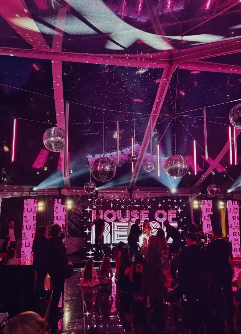 Creating a celebration in a tent can be glamorous—but pulling it all together, from catering to décor, is an art. For this event, Debbie’s client envisioned the feeling of stepping into an outdoor club, where guests could soak in the beauty of the grounds, watch the sunset, and dance under a sky full of stars. Debbie set the scene with a chic palette of black and white accented by a bold pop of hot pink—kid-friendly but with an adult sophistication. As guests arrived, valets welcomed them to “The House of Reese.” They entered through a sleek black-and-white hallway glowing with hot pink up-lights, and when the double French doors swung open, the transformation was complete: a nightclub under the tent, shimmering with disco balls overhead, dramatic lighting from every angle, and video walls with custom graphics that made the space extraordinary. In addition to the packed dance floor, a custom-designed pickle-ball court offered a playful twist for those ready to mix things up. From start to finish, it was a high-energy, over-the-top night where everyone just went Psycho!