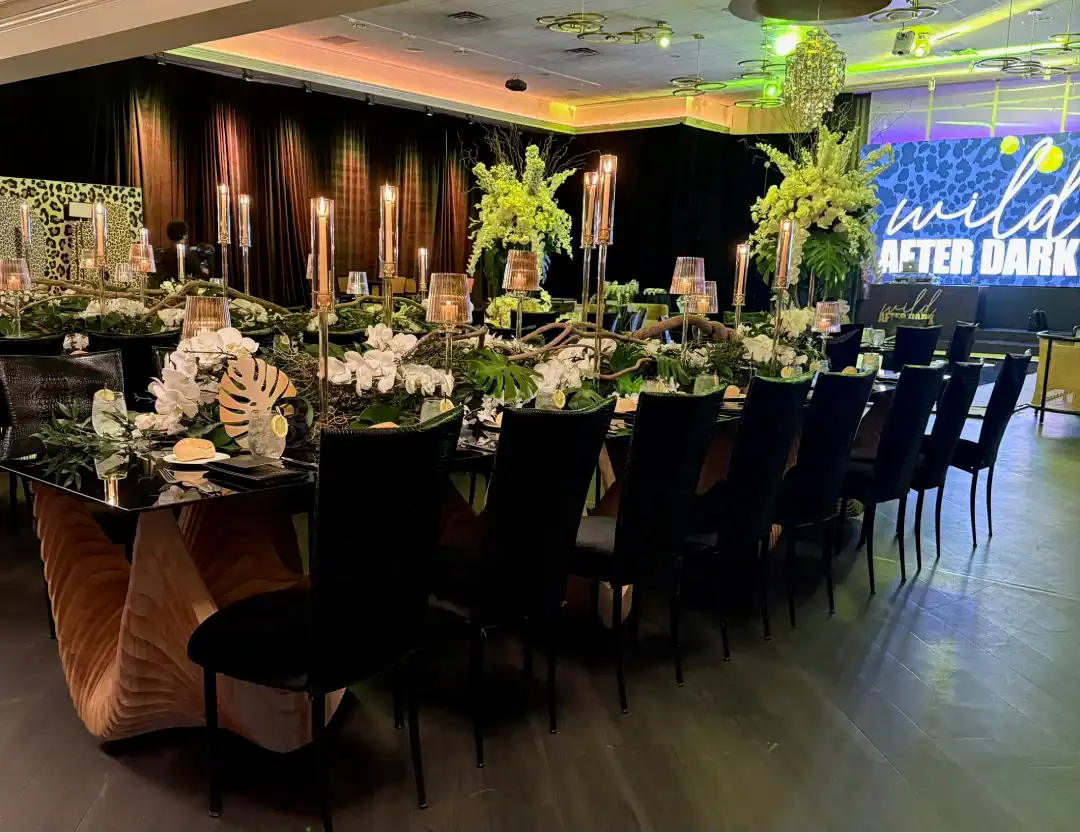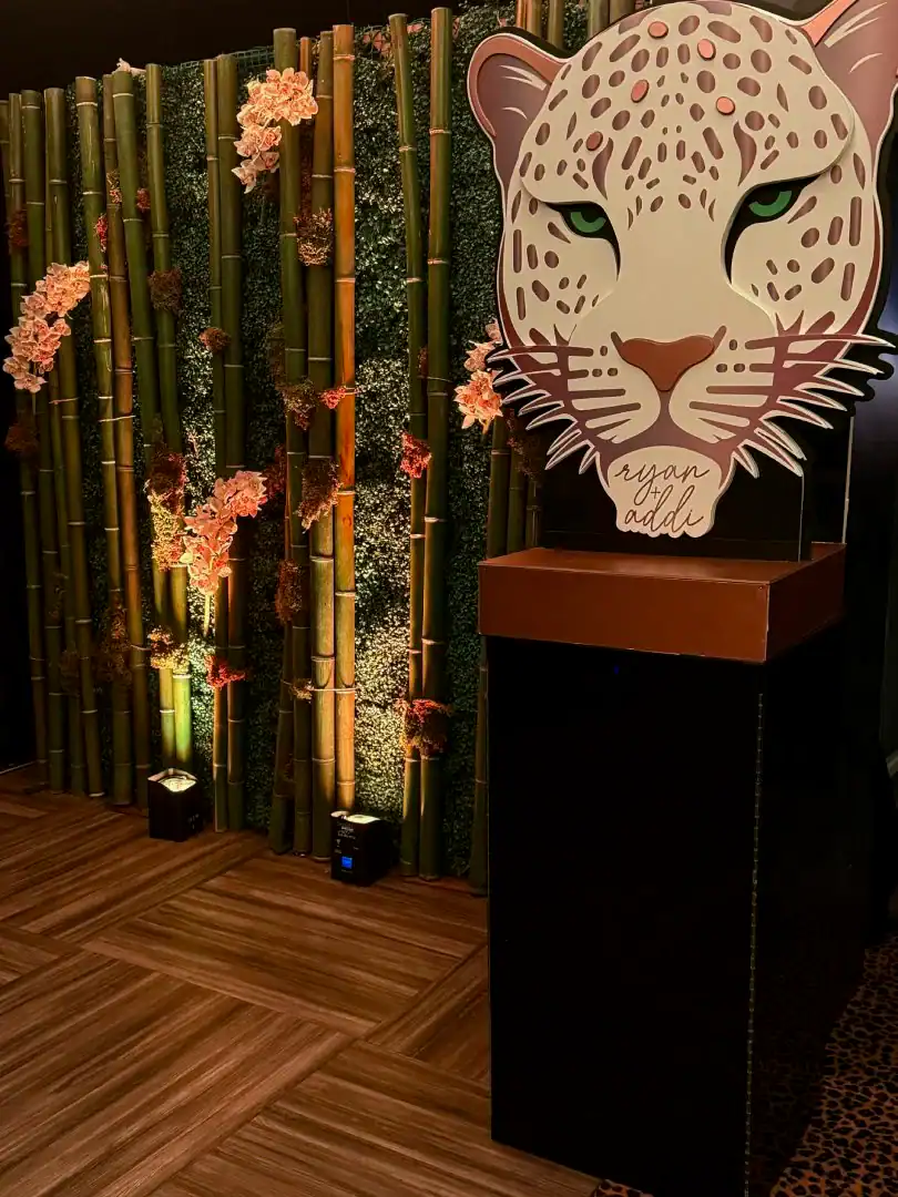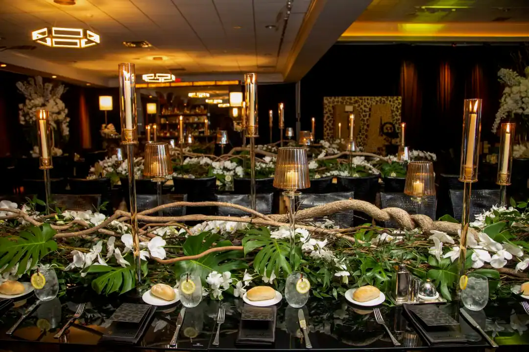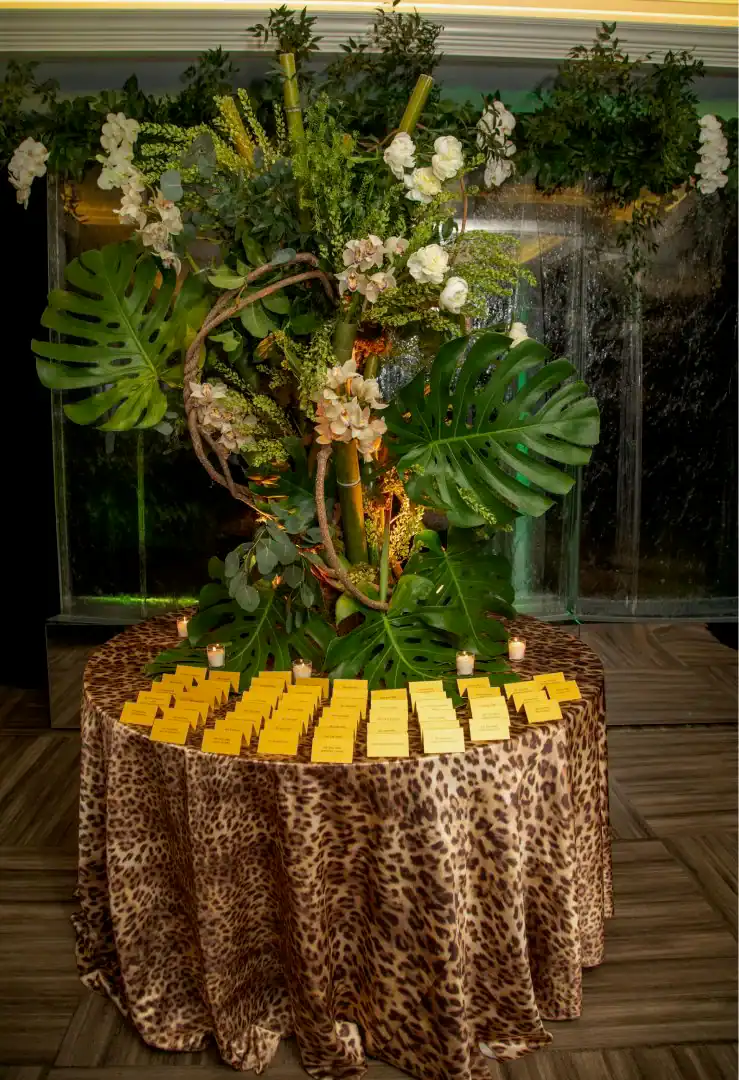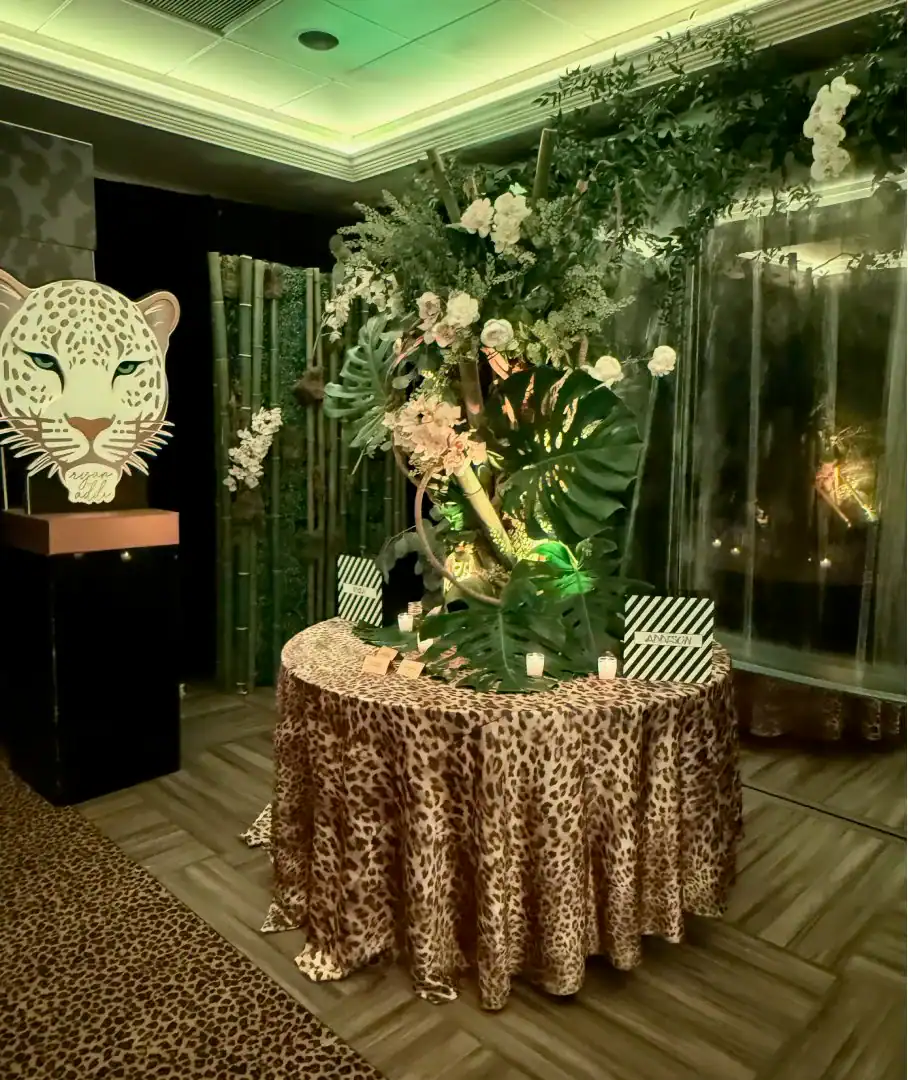 Everyone loves a jungle theme—but when Debbie Hart takes the reins, it’s not just a theme, it’s an experience. This jungle bash wasn’t just about decor—it was about immersion, mystery, and serious WOW factor. From the very first step inside, guests were transported into a lush, mystical world. They entered beneath a massive archway of vines, tropical florals, and cascading greenery, while the sounds of dimly lit waterfalls echoed in the background, setting an enchanted, otherworldly tone. A leopard-print carpet guided guests deeper into the jungle, where the adventure began. Kids were ushered into their own wild zone, packed with fun, food, and games tailored just for them. Adults, meanwhile, relaxed in an exotic cocktail space, sipping on signature drinks and enjoying delectable bites as they mingled and soaked in the atmosphere. When it was time to journey to the main event, the energy shifted. Guests entered a ballroom that had been completely transformed—piped and draped in black, with uplighting illuminating bold posters of branded leopards and glistening gold palm trees. The tables, made of carved wood with sleek black glass tops, were styled to perfection with custom menus, elegant napkins, candleholders, with striking white and green exotic floral arrangements. At the heart of it all was a black acrylic dance floor, featuring a mirrored, branded logo that caught the light as guests danced the night away. And for those who love to snap a memory or two, this event had not one, but two immersive photo ops. One featured towering 3D leopard-print initials with a matching backdrop and floor, while the other invited guests to climb aboard a safari truck, taking in the “wildlife” from afar—complete with playful jungle scenery. Costumed performers brought the jungle to life, making grand entrances, mingling with guests, dancing alongside the crowd, and even handing out late-night treats. Every detail was curated, every moment choreographed, and every guest left feeling like they had truly taken part in a one-of-a-kind, eventful adventure. This wasn’t just a party—it was a wild escape, all thanks to Debbie Hart’s unmatched creative vision.