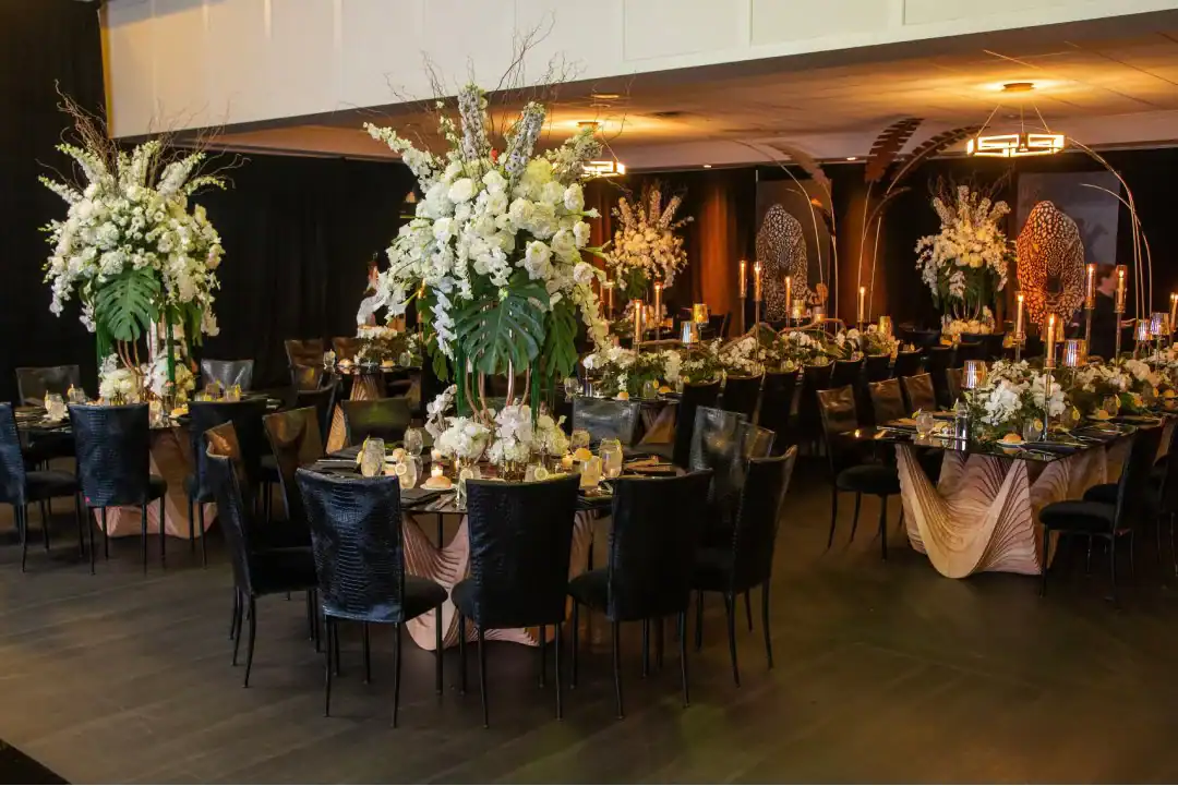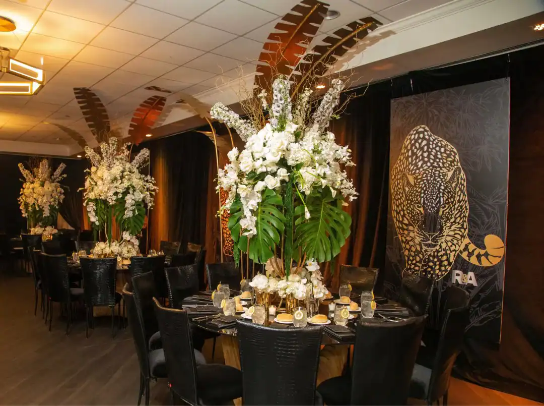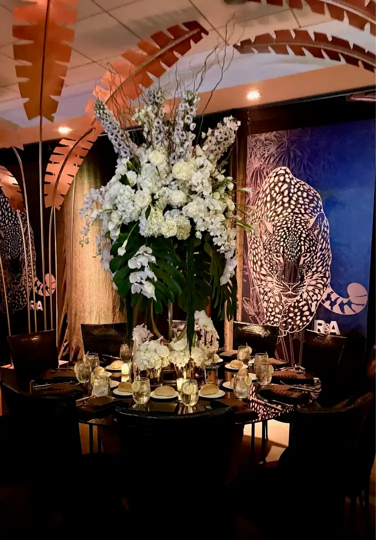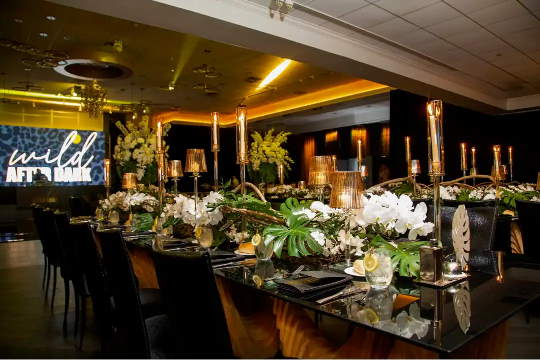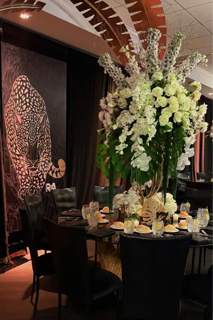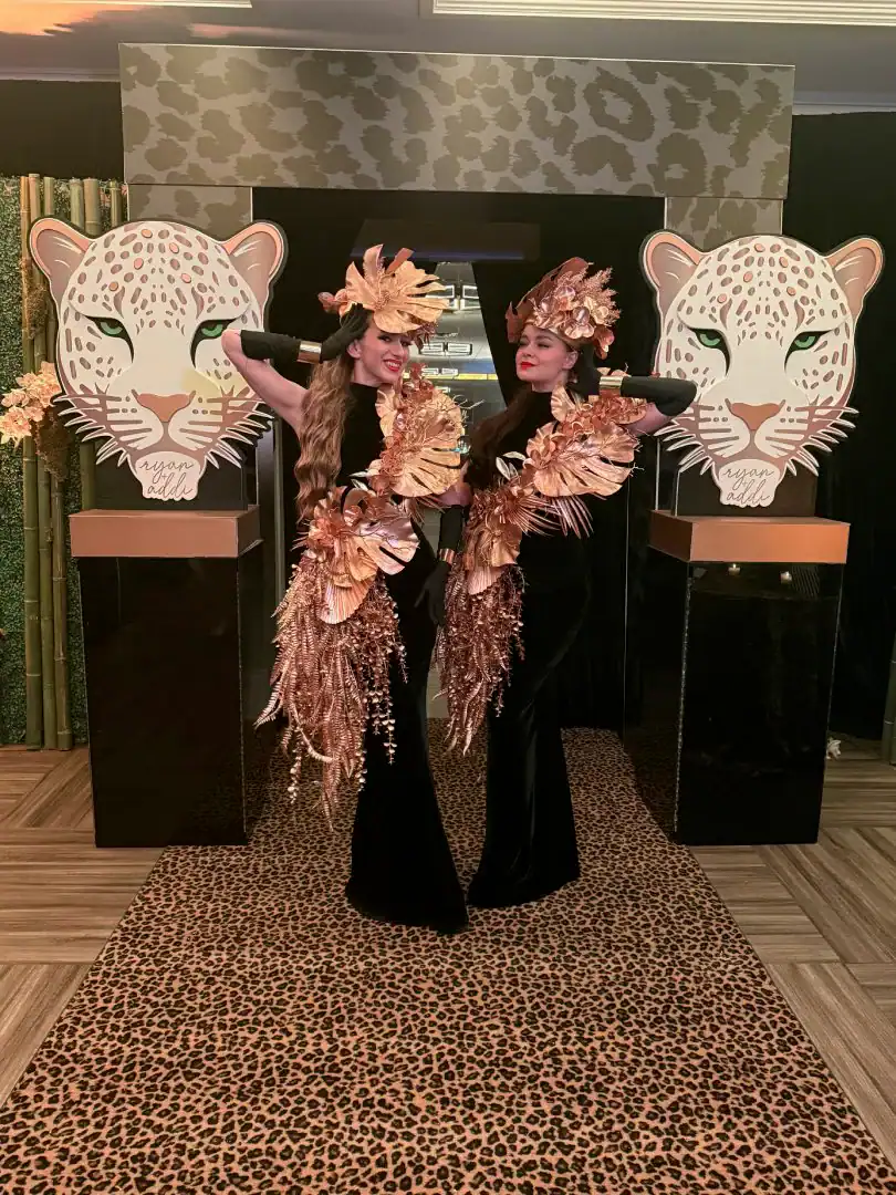Everyone loves a jungle theme—but when Debbie Hart takes the reins, it’s not just a theme, it’s an experience. This jungle bash wasn’t just about decor—it was about immersion, mystery, and serious WOW factor. From the very first step inside, guests were transported into a lush, mystical world. They entered beneath a massive archway of vines, tropical florals, and cascading greenery, while the sounds of dimly lit waterfalls echoed in the background, setting an enchanted, otherworldly tone. A leopard-print carpet guided guests deeper into the jungle, where the adventure began. Kids were ushered into their own wild zone, packed with fun, food, and games tailored just for them. Adults, meanwhile, relaxed in an exotic cocktail space, sipping on signature drinks and enjoying delectable bites as they mingled and soaked in the atmosphere. When it was time to journey to the main event, the energy shifted. Guests entered a ballroom that had been completely transformed—piped and draped in black, with uplighting illuminating bold posters of branded leopards and glistening gold palm trees. The tables, made of carved wood with sleek black glass tops, were styled to perfection with custom menus, elegant napkins, candleholders, with striking white and green exotic floral arrangements. At the heart of it all was a black acrylic dance floor, featuring a mirrored, branded logo that caught the light as guests danced the night away. And for those who love to snap a memory or two, this event had not one, but two immersive photo ops. One featured towering 3D leopard-print initials with a matching backdrop and floor, while the other invited guests to climb aboard a safari truck, taking in the “wildlife” from afar—complete with playful jungle scenery. Costumed performers brought the jungle to life, making grand entrances, mingling with guests, dancing alongside the crowd, and even handing out late-night treats. Every detail was curated, every moment choreographed, and every guest left feeling like they had truly taken part in a one-of-a-kind, eventful adventure. This wasn’t just a party—it was a wild escape, all thanks to Debbie Hart’s unmatched creative vision.