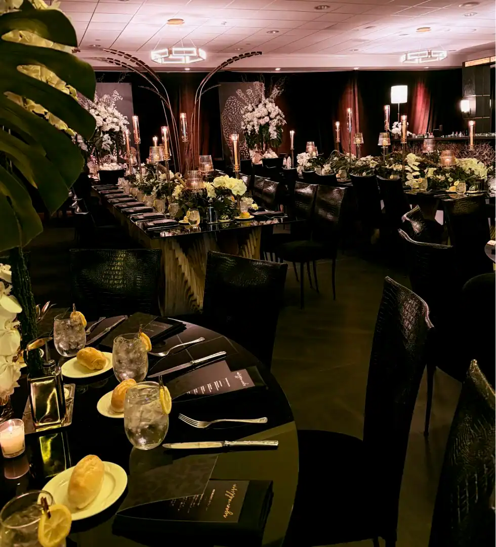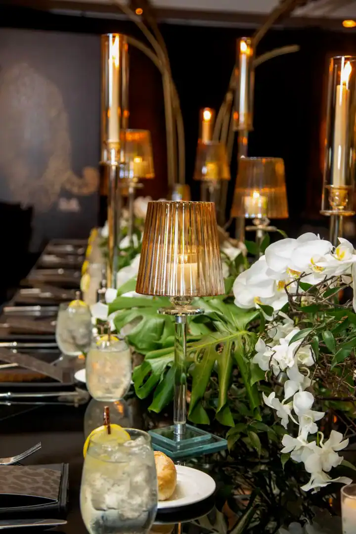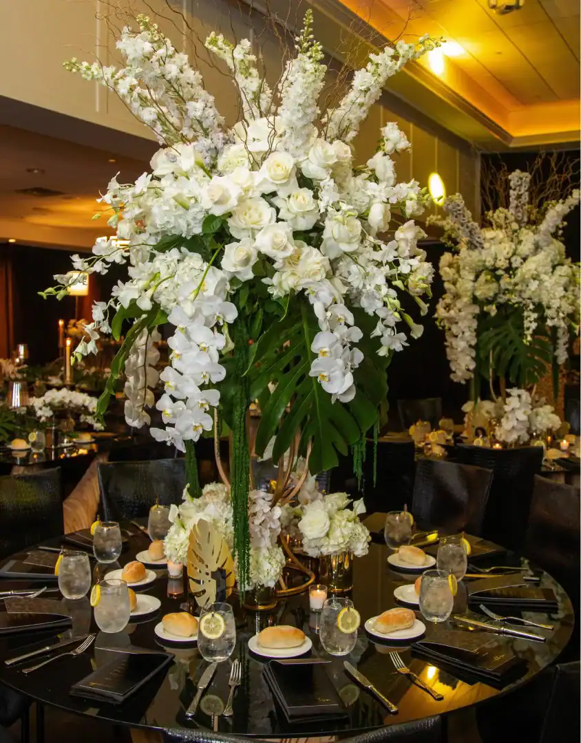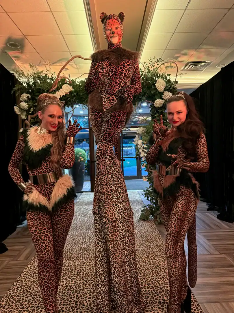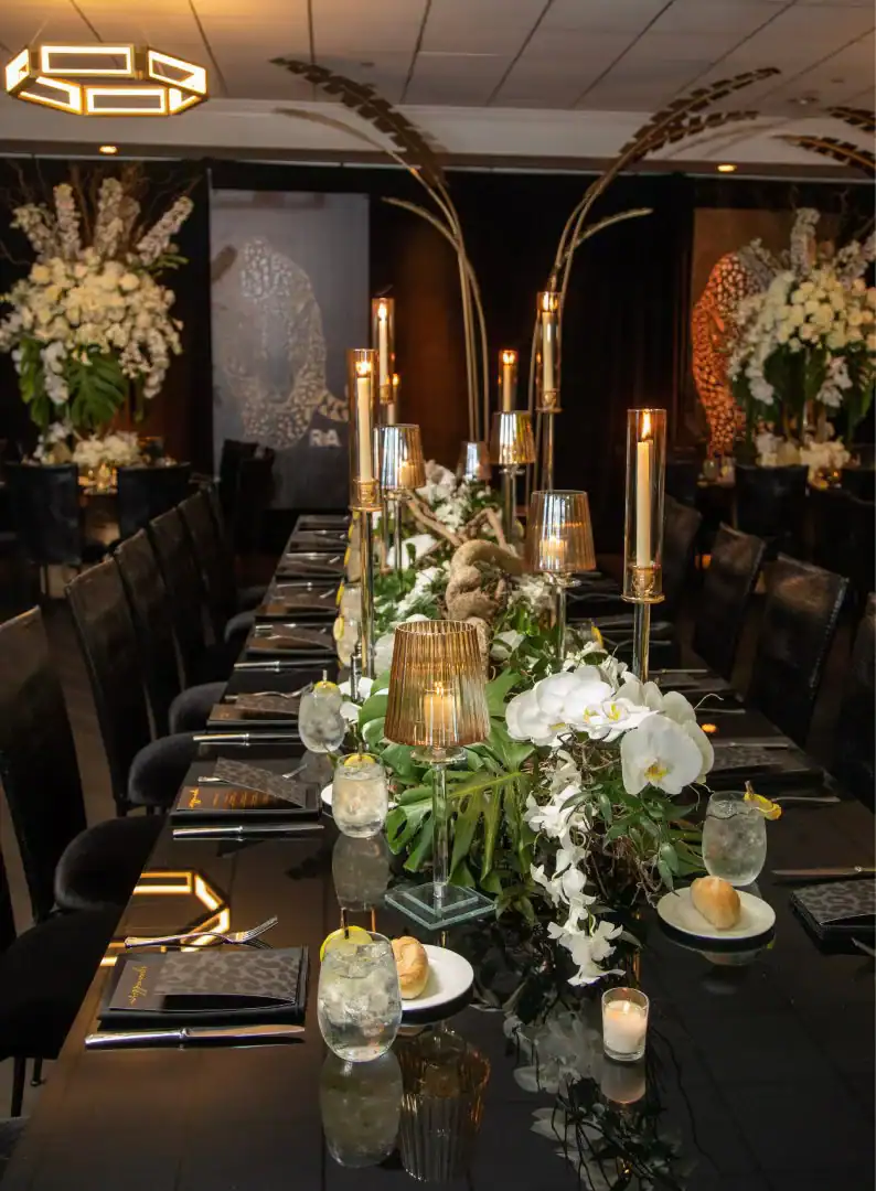 Everyone loves a jungle theme—but when Debbie Hart takes the reins, it’s not just a theme, it’s an experience. This jungle bash wasn’t just about decor—it was about immersion, mystery, and serious WOW factor. From the very first step inside, guests were transported into a lush, mystical world. They entered beneath a massive archway of vines, tropical florals, and cascading greenery, while the sounds of dimly lit waterfalls echoed in the background, setting an enchanted, otherworldly tone. A leopard-print carpet guided guests deeper into the jungle, where the adventure began. Kids were ushered into their own wild zone, packed with fun, food, and games tailored just for them. Adults, meanwhile, relaxed in an exotic cocktail space, sipping on signature drinks and enjoying delectable bites as they mingled and soaked in the atmosphere. When it was time to journey to the main event, the energy shifted. Guests entered a ballroom that had been completely transformed—piped and draped in black, with uplighting illuminating bold posters of branded leopards and glistening gold palm trees. The tables, made of carved wood with sleek black glass tops, were styled to perfection with custom menus, elegant napkins, candleholders, with striking white and green exotic floral arrangements. At the heart of it all was a black acrylic dance floor, featuring a mirrored, branded logo that caught the light as guests danced the night away. And for those who love to snap a memory or two, this event had not one, but two immersive photo ops. One featured towering 3D leopard-print initials with a matching backdrop and floor, while the other invited guests to climb aboard a safari truck, taking in the “wildlife” from afar—complete with playful jungle scenery. Costumed performers brought the jungle to life, making grand entrances, mingling with guests, dancing alongside the crowd, and even handing out late-night treats. Every detail was curated, every moment choreographed, and every guest left feeling like they had truly taken part in a one-of-a-kind, eventful adventure. This wasn’t just a party—it was a wild escape, all thanks to Debbie Hart’s unmatched creative vision.