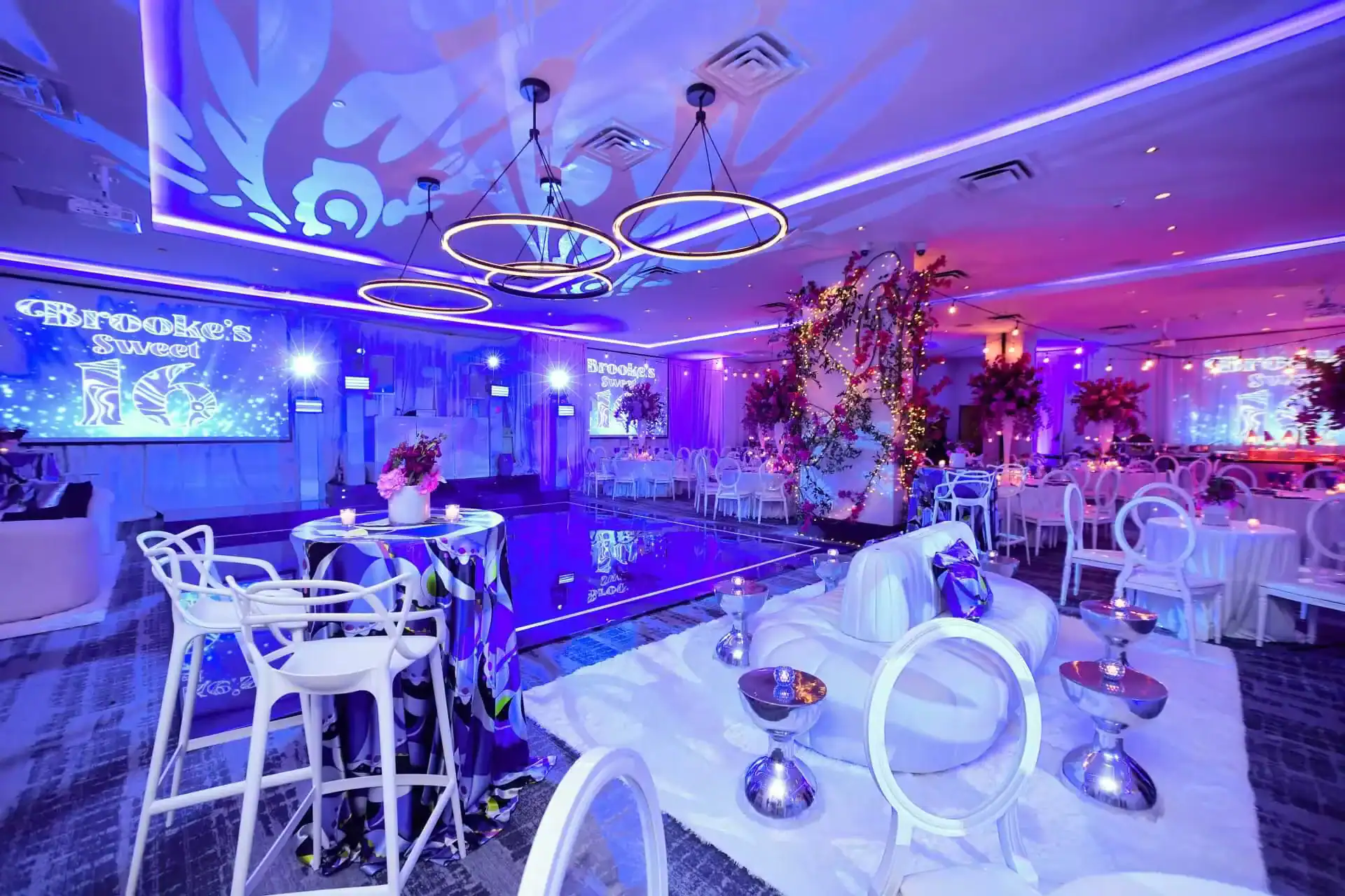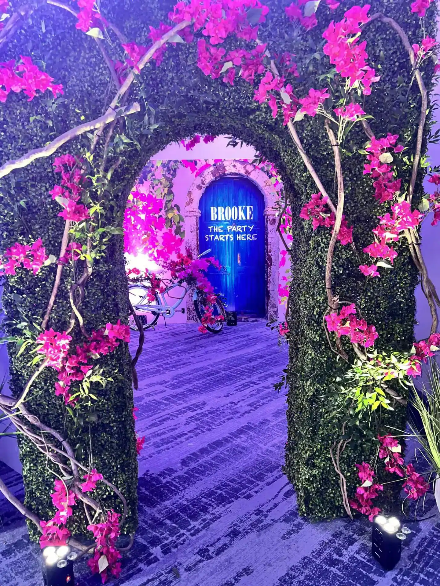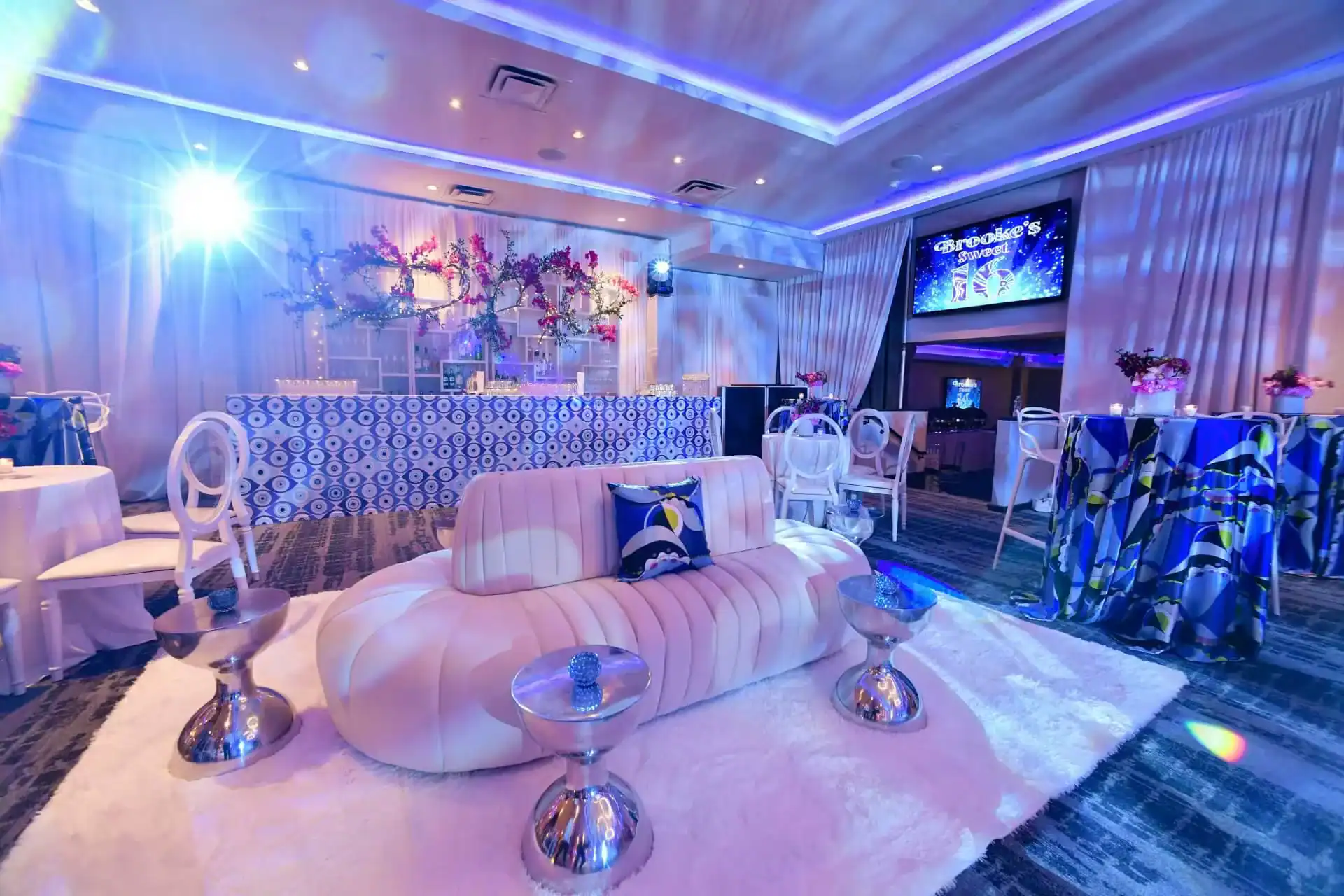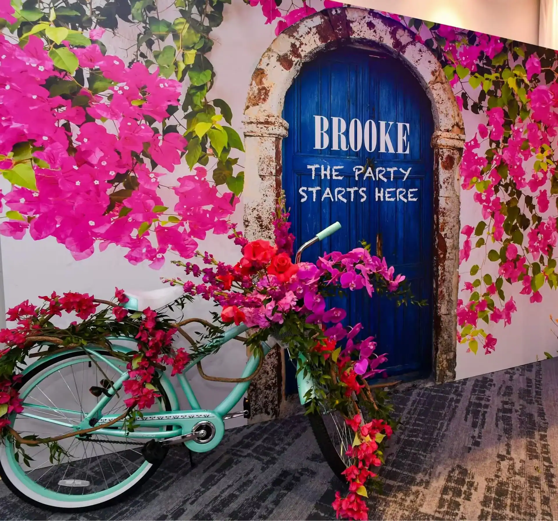 Debbie Hart and her team transported guests to a breathtaking Greek island with a “Mamma Mia” themed sweet 16 that was nothing short of magical. From the moment they arrived, guests felt whisked away to the “Hotel Bella Brook,” greeted by a lush boxwood archway adorned with vibrant pink bougainvillea florals and cascading vines along pristine white stucco walls. The iconic blue and white colors of Greece were showcased everywhere, creating a stunning and authentic atmosphere. Bistro lights twinkled over the adult seating area, while the teens enjoyed their exclusive VIP section, decked out with Pucci-inspired prints and luxurious white velvet couches. The blue mirrored dance floor sparkled under the twinkling lights, adding a mesmerizing glow to the room. But the real showstopper of the night was the immersive photobooth, where guests were captured taking tons of pictures in a beautifully crafted Greek setting, complete with a real swing. It was an unforgettable celebration for our “Dancing Queen”, filled with fun, laughter, and endless memories!