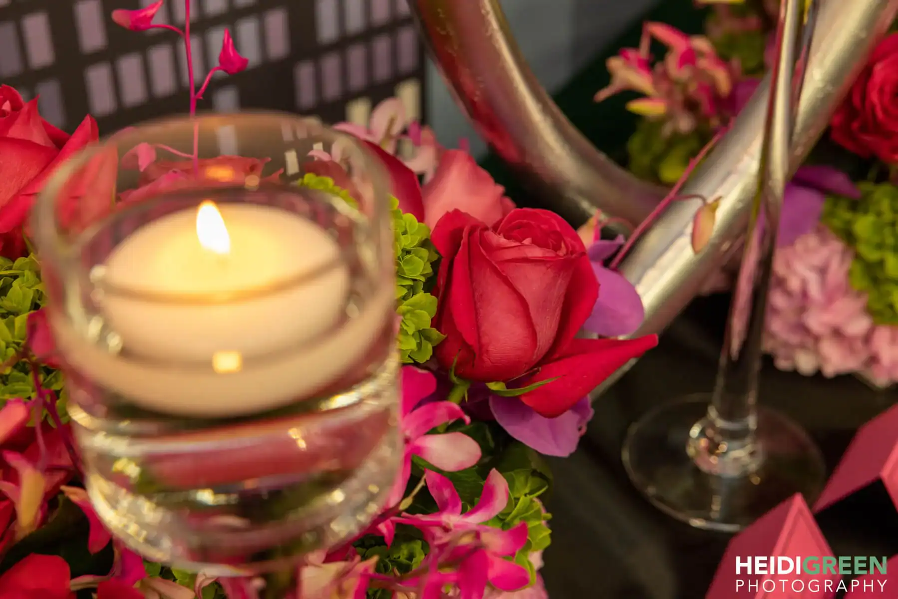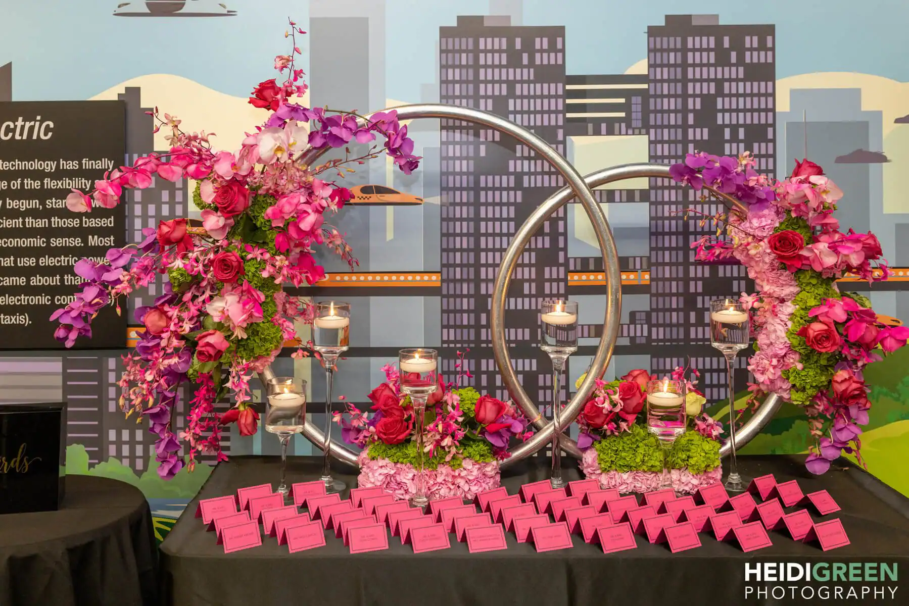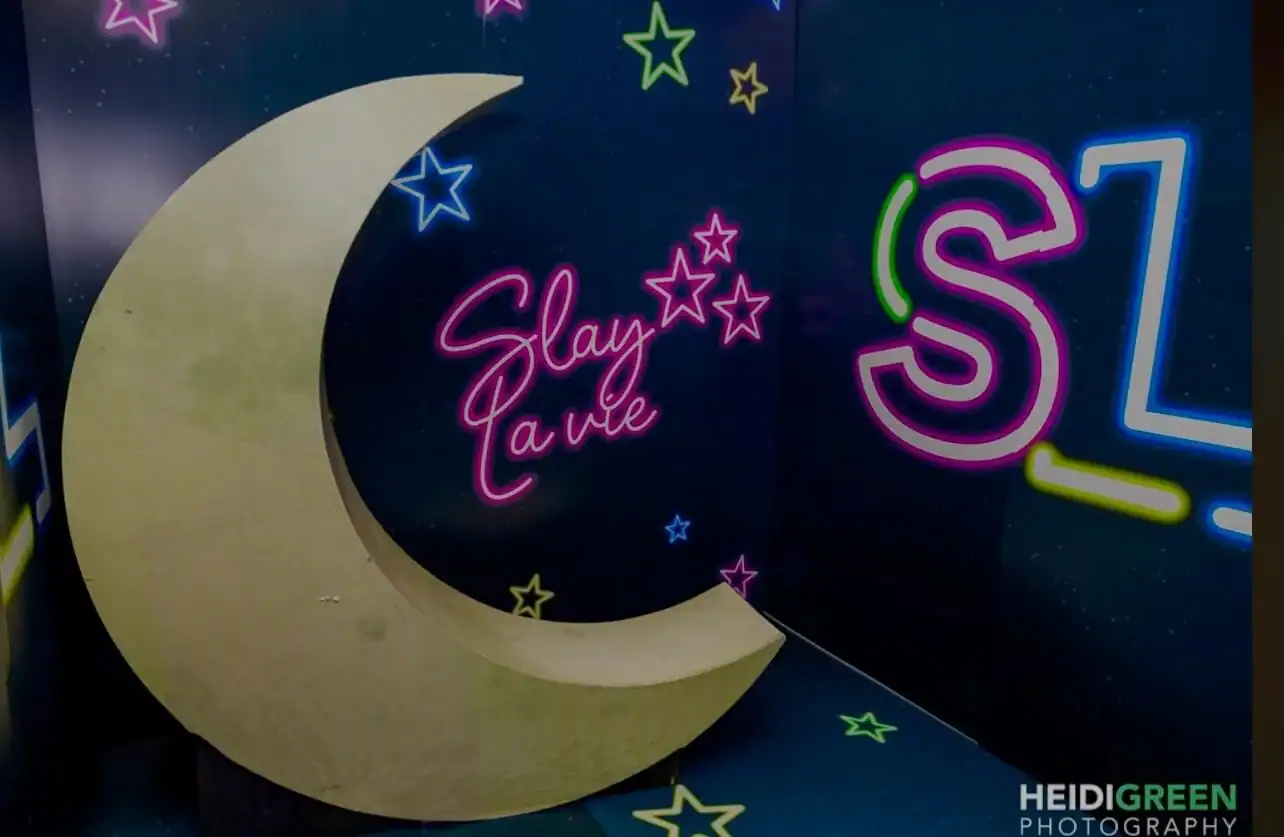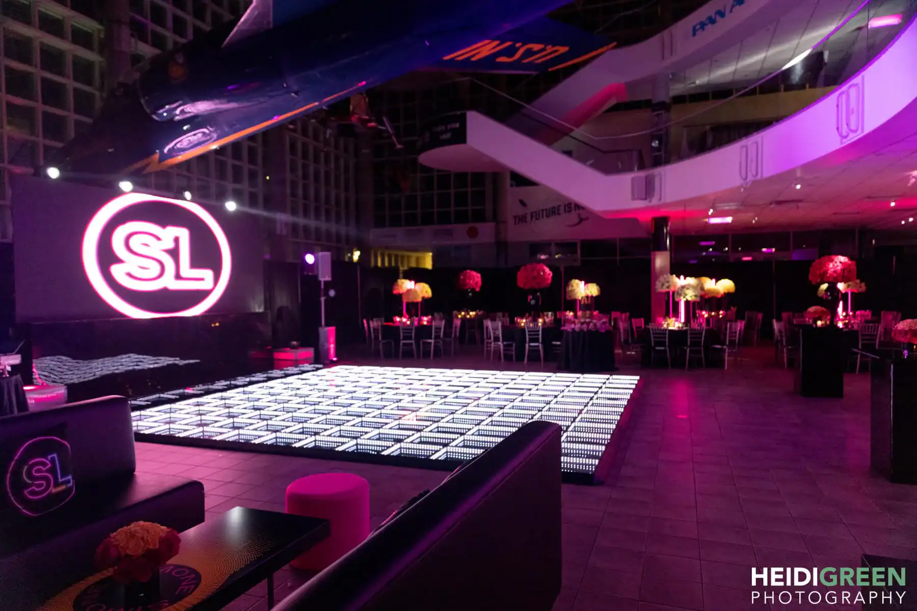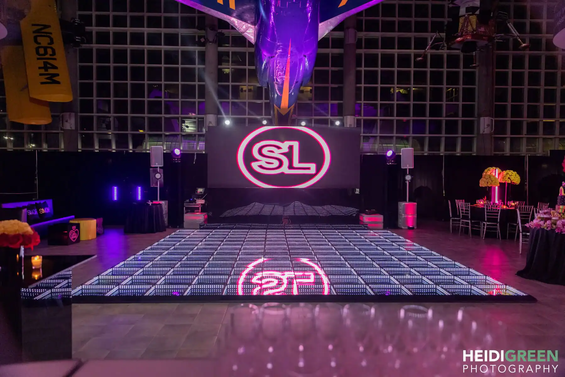 Debbie Hart transformed The Cradle of Aviation Museum into an otherworldly spectacle with the theme “glow.” Guests embarked on a journey through the museum’s unique spaces, weaving through exhibits and treasures. The main room pulsated with neon, intelligent club lighting, and black lights, casting a mesmerizing glow.