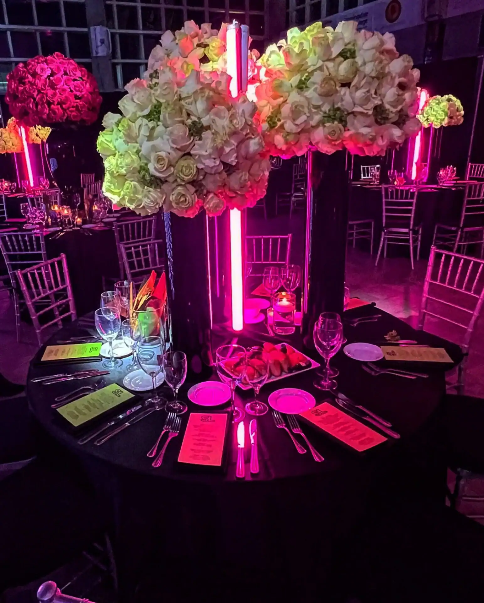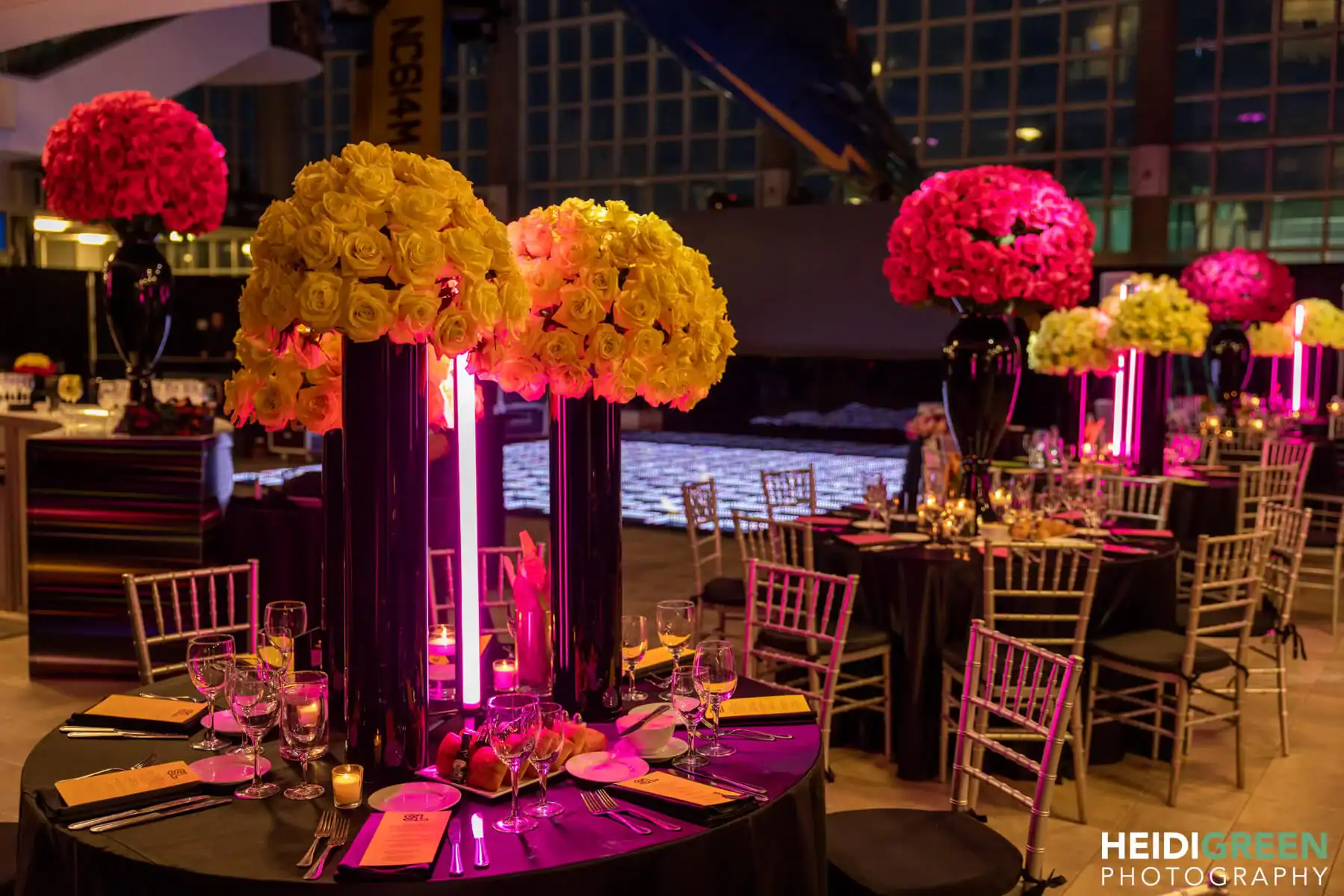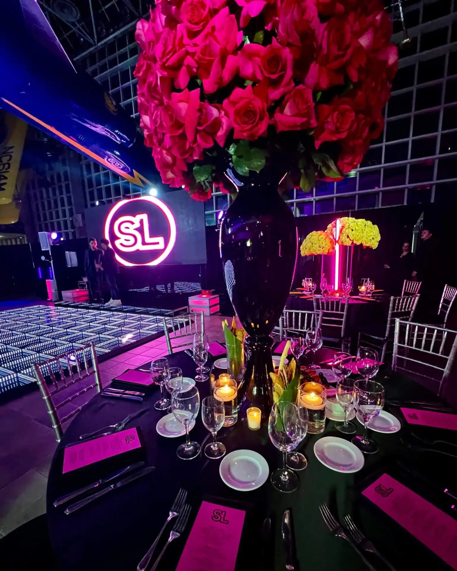 Table centerpieces, adorned with hot pink, bright yellow, and lime green roses, were illuminated by free-standing neon beams, creating this “out of this world” atmosphere. The video screen displayed vibrant neon graphics, glow pillows adorned the lounge, and the infinity dance floor changed colors in sync with the music.