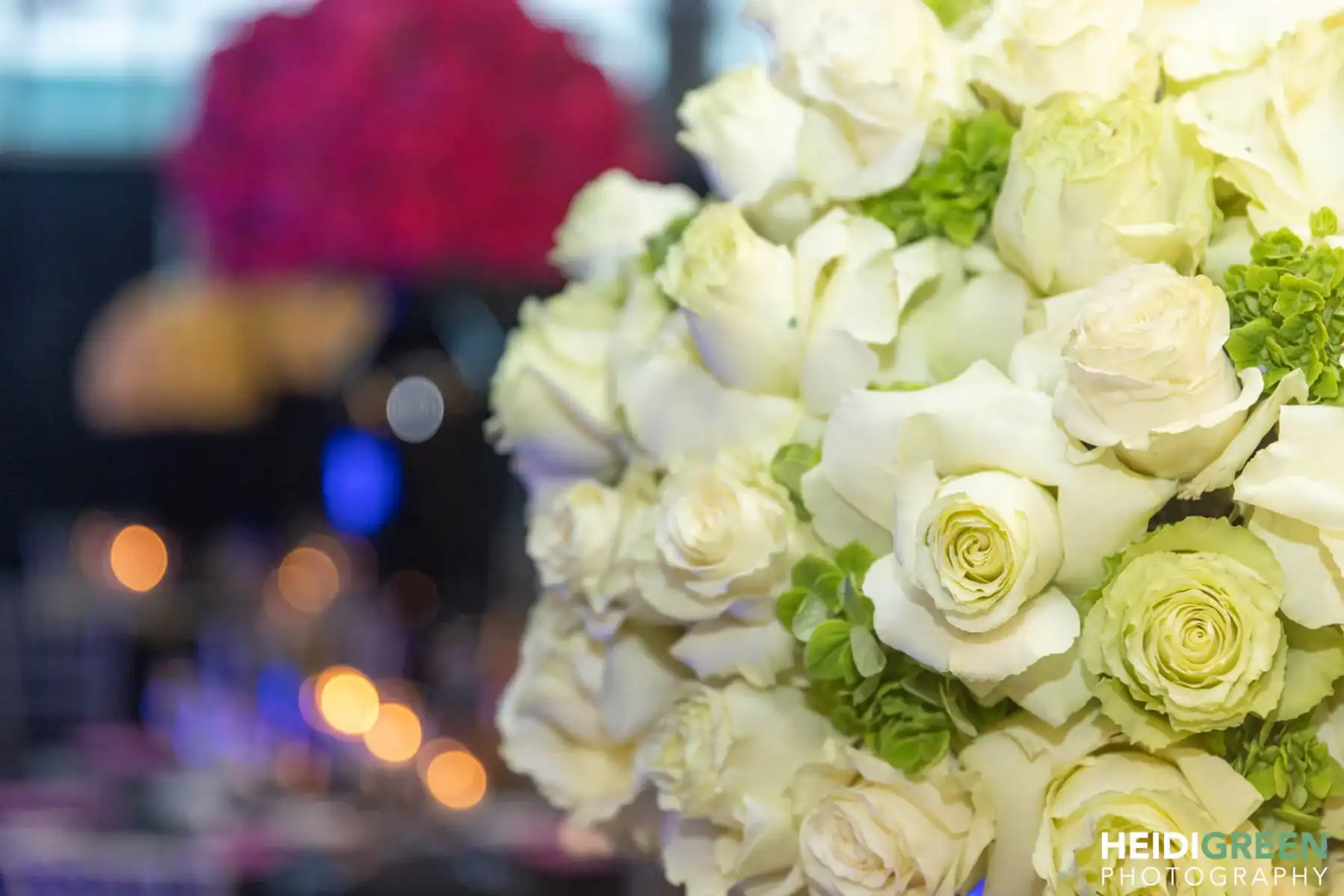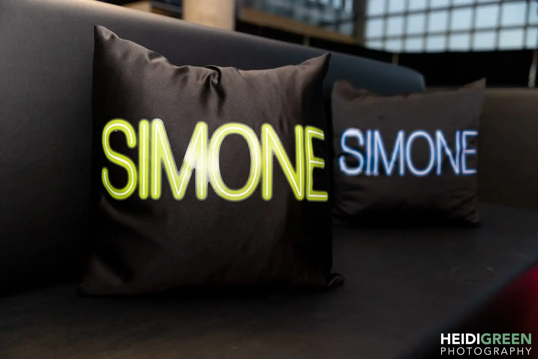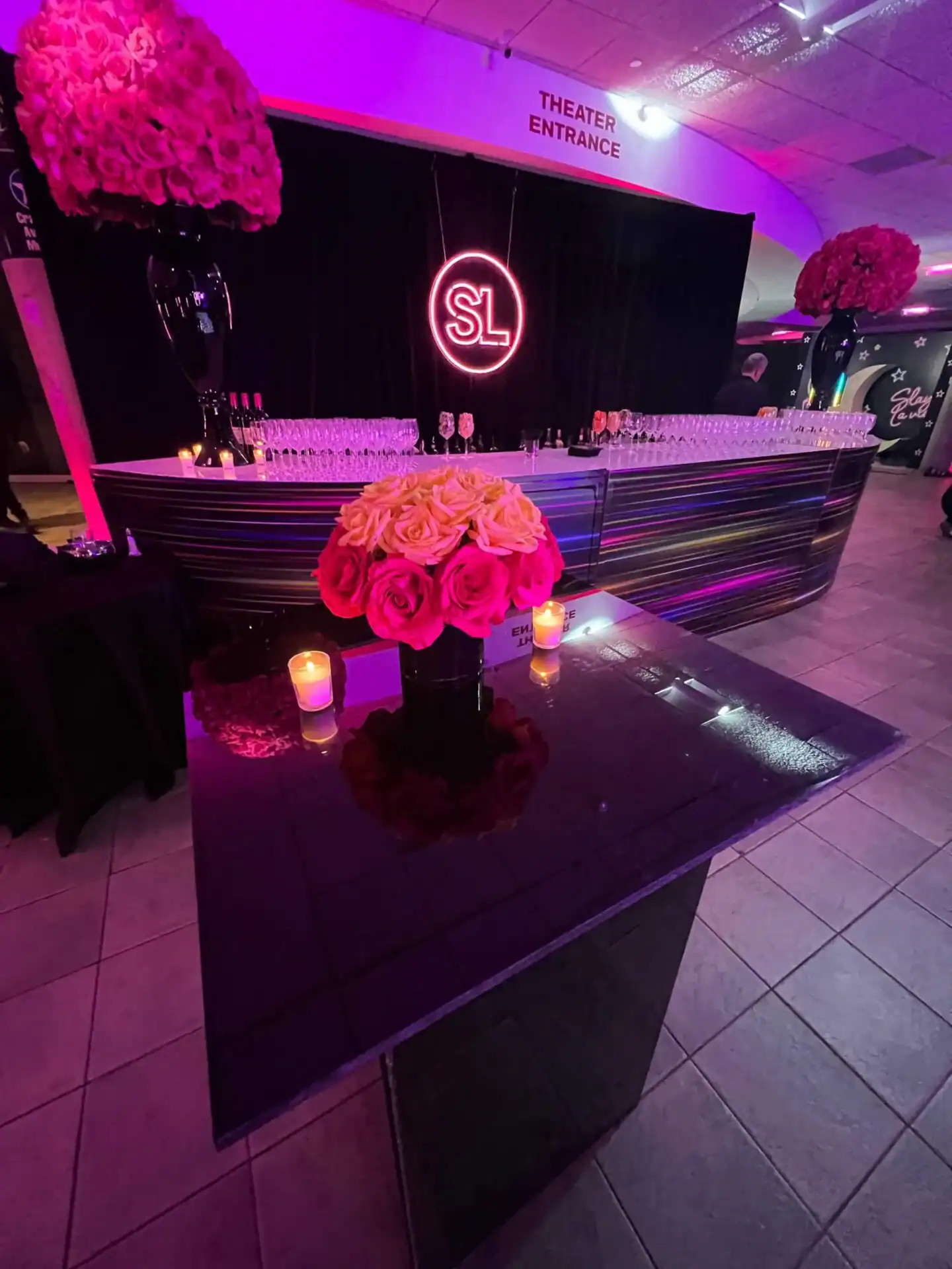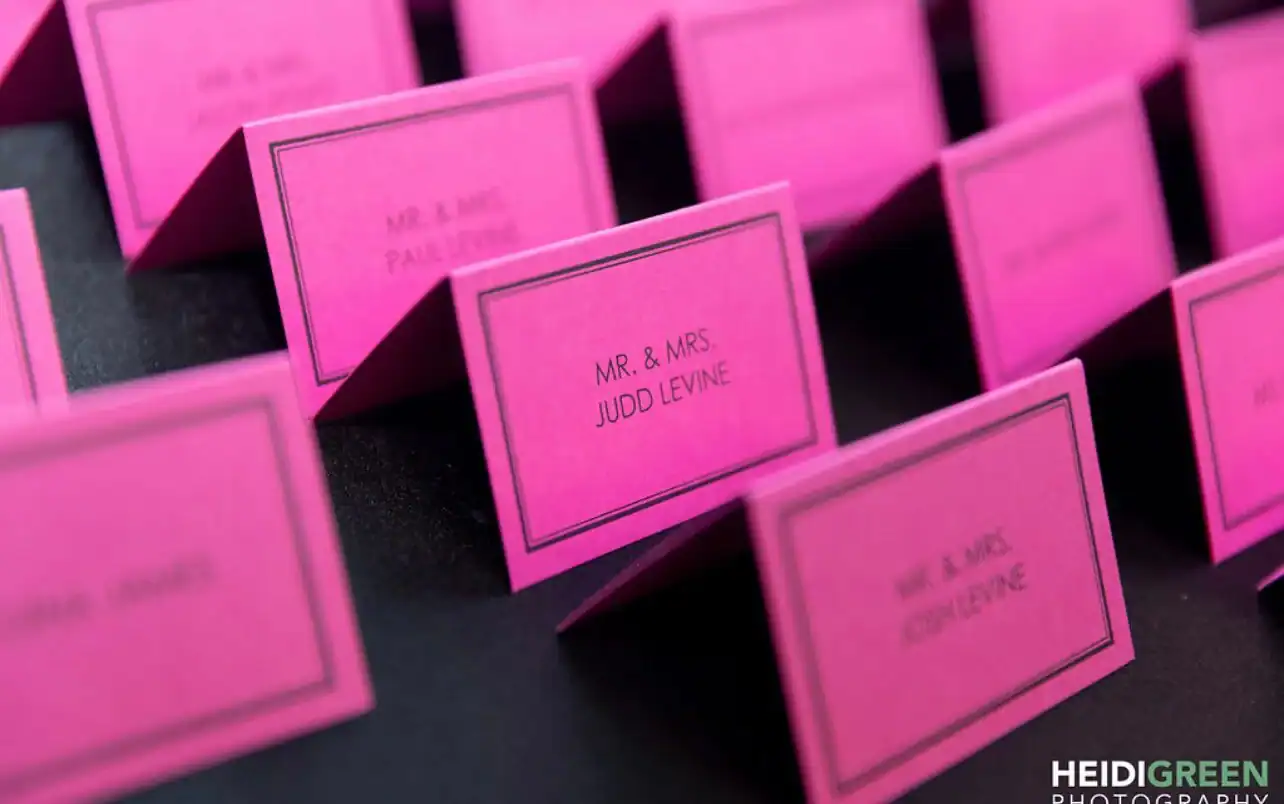 Table centerpieces, adorned with hot pink, bright yellow, and lime green roses, were illuminated by free-standing neon beams, creating this “out of this world” atmosphere. The video screen displayed vibrant neon graphics, glow pillows adorned the lounge, and the infinity dance floor changed colors in sync with the music.