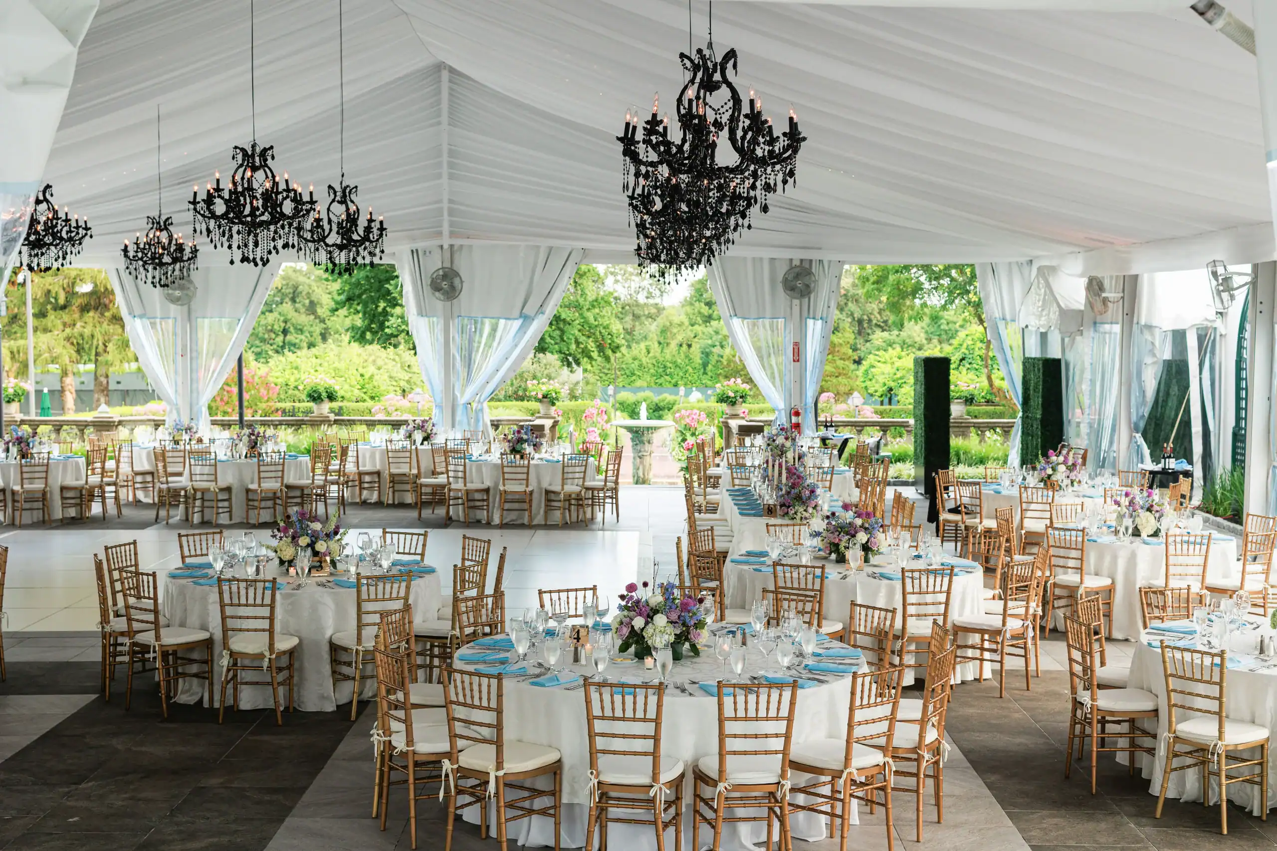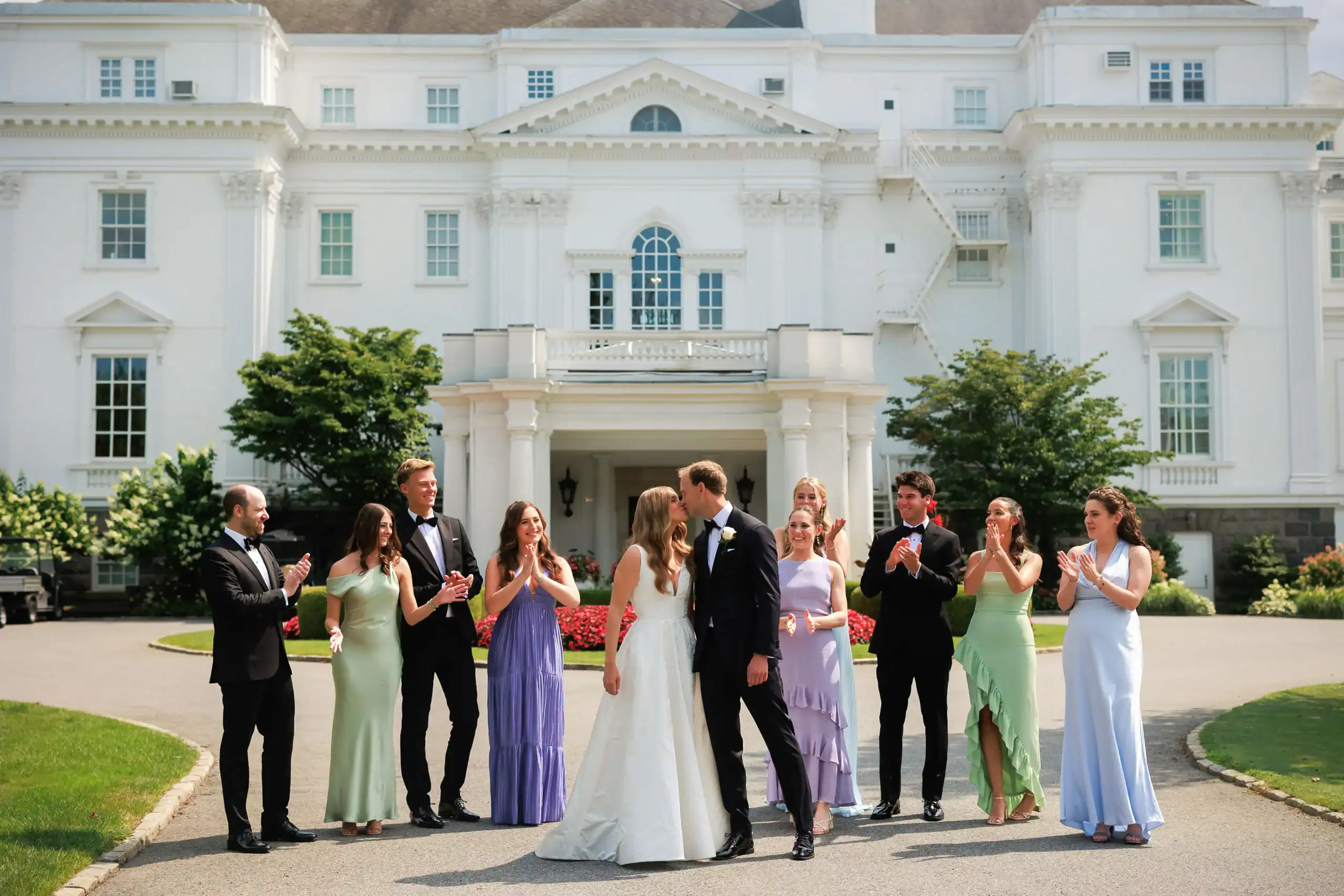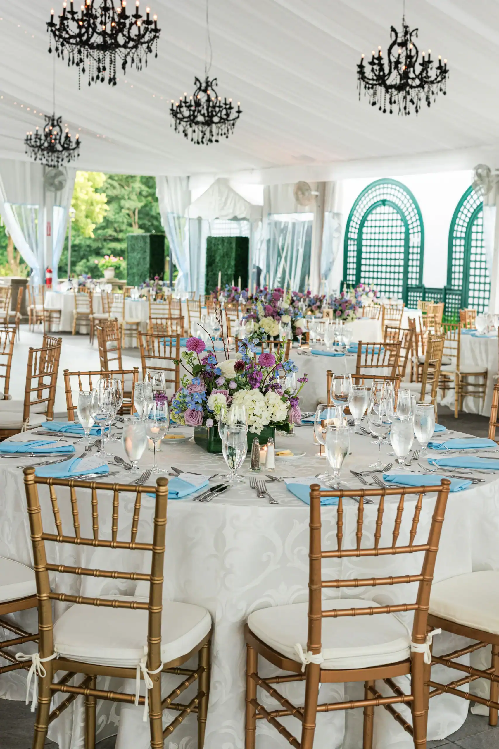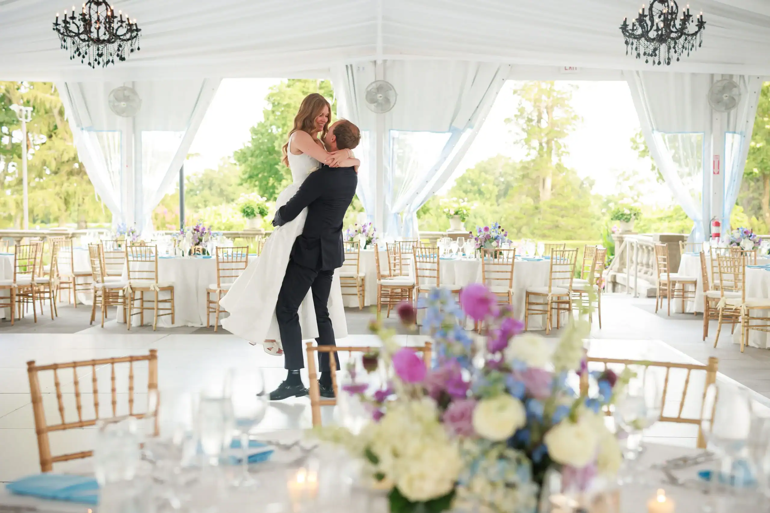 Summer weddings are the perfect time to experience the beauty of abundant florals, lush landscapes, manicured lawns, and unforgettable sunsets. Nothing fell short of that for this bride and groom, who envisioned an intimate celebration surrounded by natural elegance. They chose to have both their ceremony and reception at their country club, drawn to its stunning interior and exterior spaces, along with its first-class cuisine and impeccable service. As an added bonus, the club’s white tent—draped in flowing fabric, accented with iron chandeliers, and centered around a glossy white dance floor—allowed the celebration to seamlessly flow from indoors to outdoors. The design embraced soft pastels and organic elements, creating a serene, romantic atmosphere. As guests dined and danced, they watched the sun set into a warm summer night—an effortless ending to a perfectly elegant and memorable celebration.