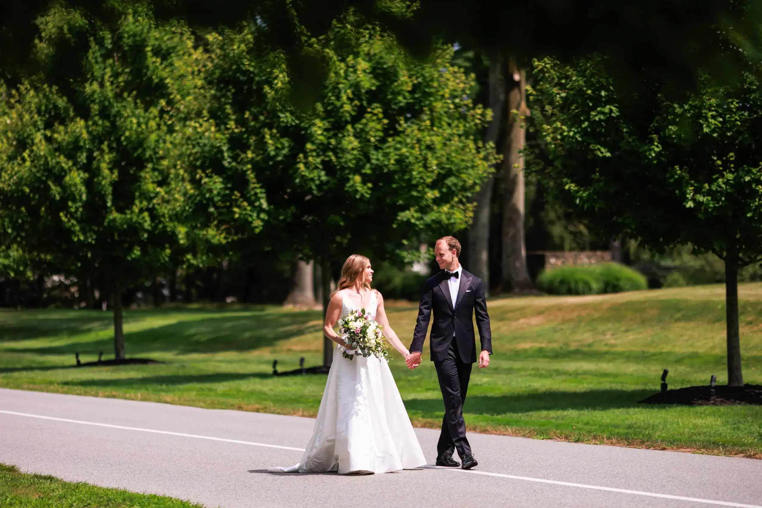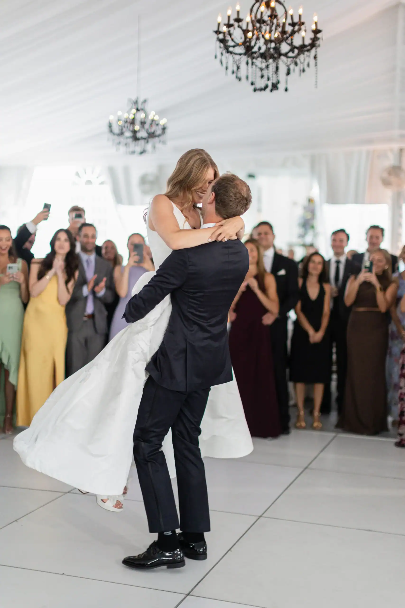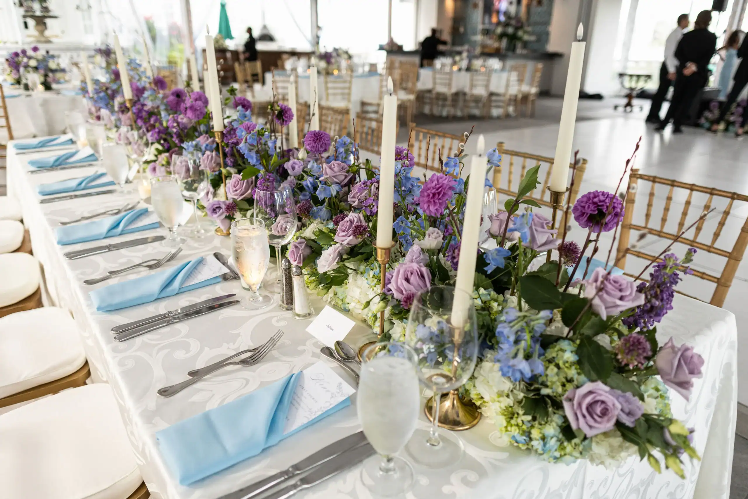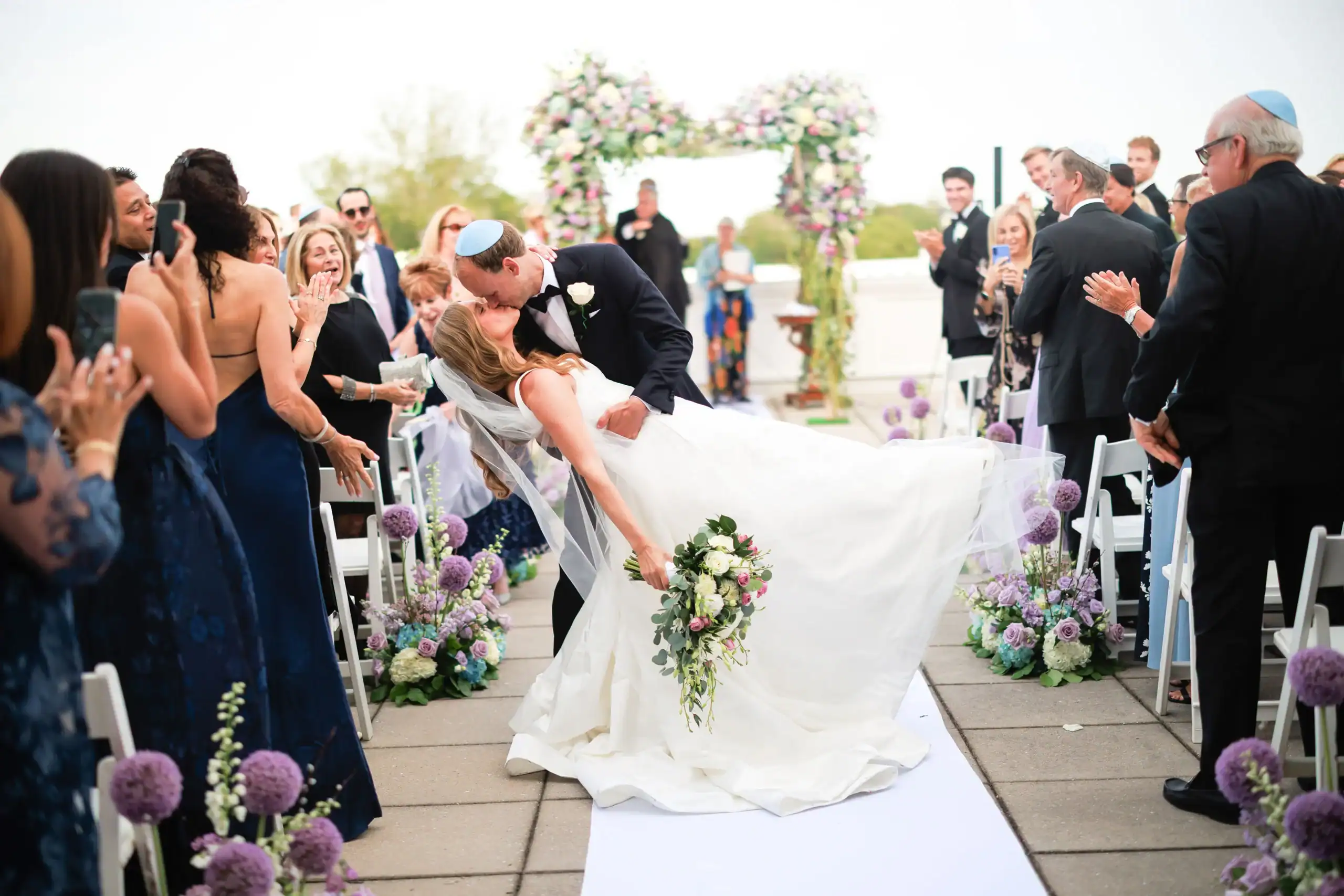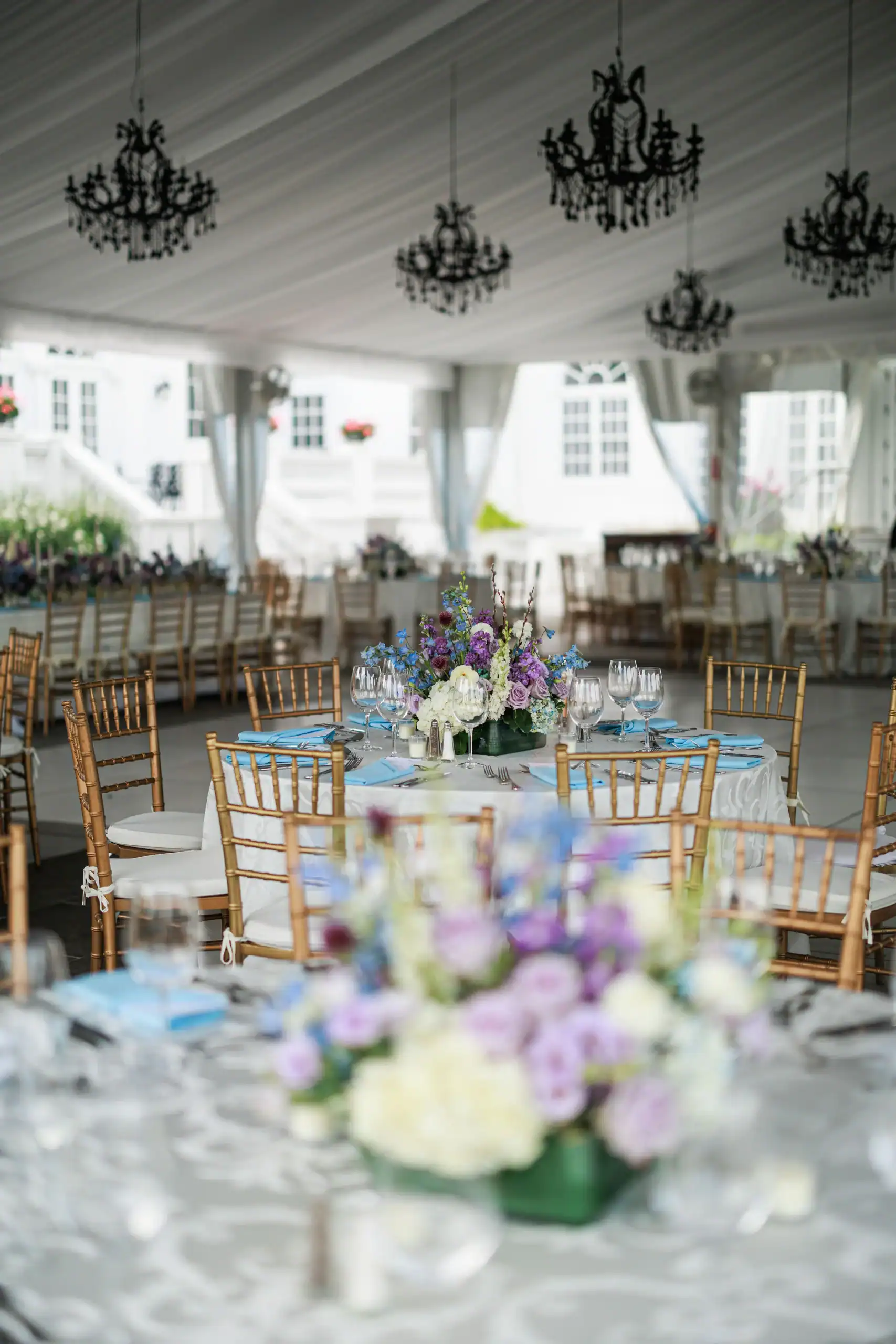 Summer weddings are the perfect time to experience the beauty of abundant florals, lush landscapes, manicured lawns, and unforgettable sunsets. Nothing fell short of that for this bride and groom, who envisioned an intimate celebration surrounded by natural elegance. They chose to have both their ceremony and reception at their country club, drawn to its stunning interior and exterior spaces, along with its first-class cuisine and impeccable service. As an added bonus, the club’s white tent—draped in flowing fabric, accented with iron chandeliers, and centered around a glossy white dance floor—allowed the celebration to seamlessly flow from indoors to outdoors. The design embraced soft pastels and organic elements, creating a serene, romantic atmosphere. As guests dined and danced, they watched the sun set into a warm summer night—an effortless ending to a perfectly elegant and memorable celebration.