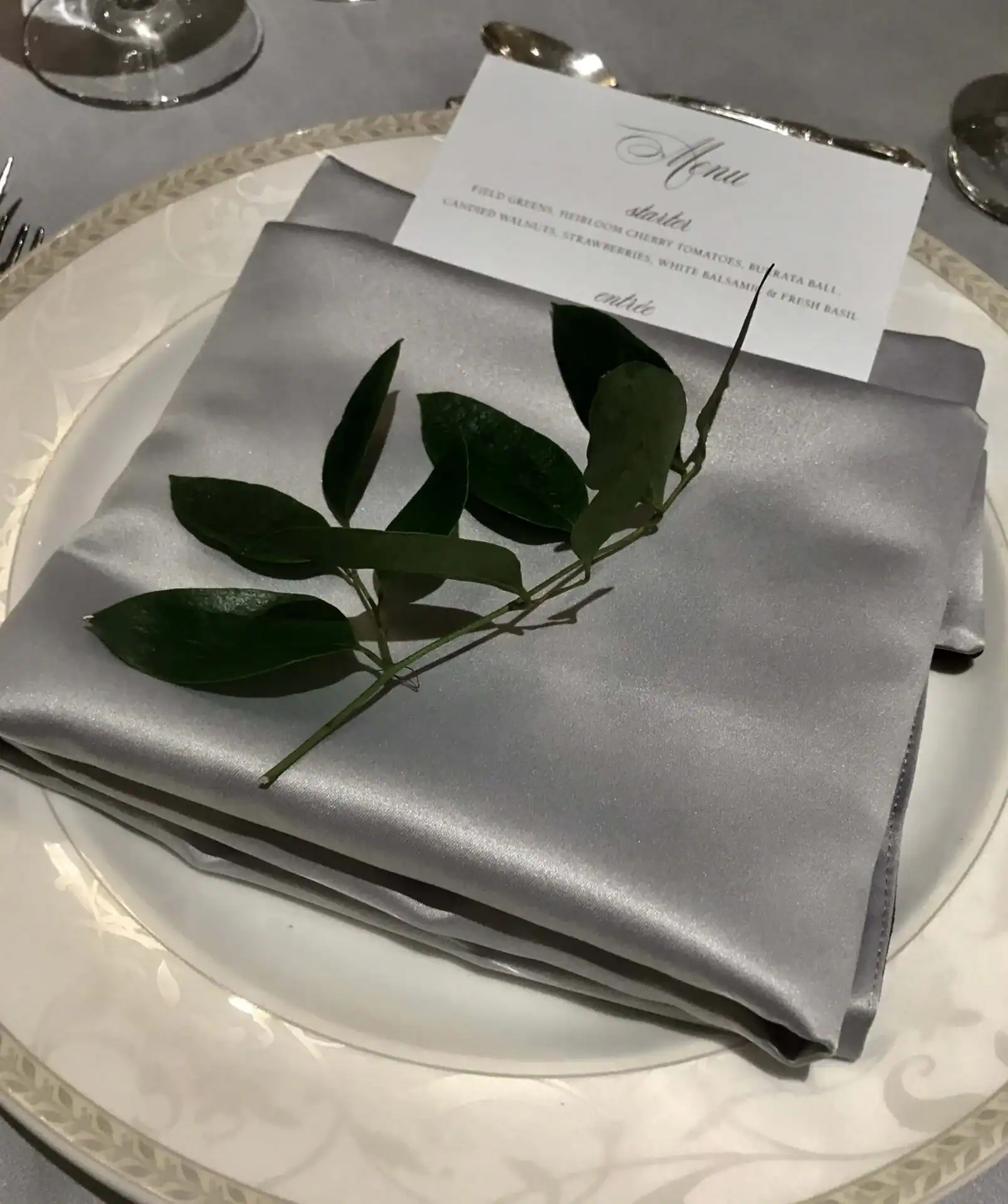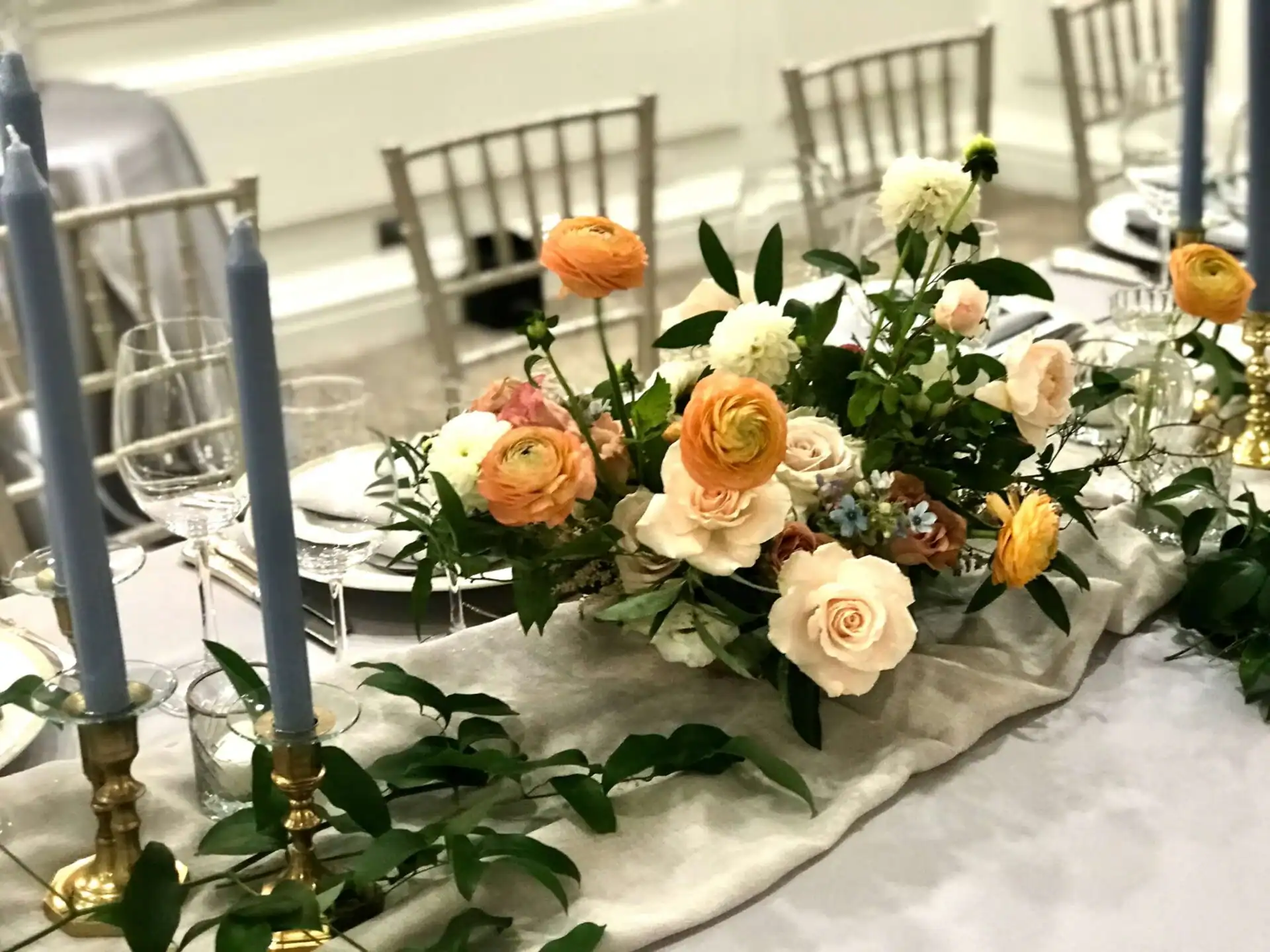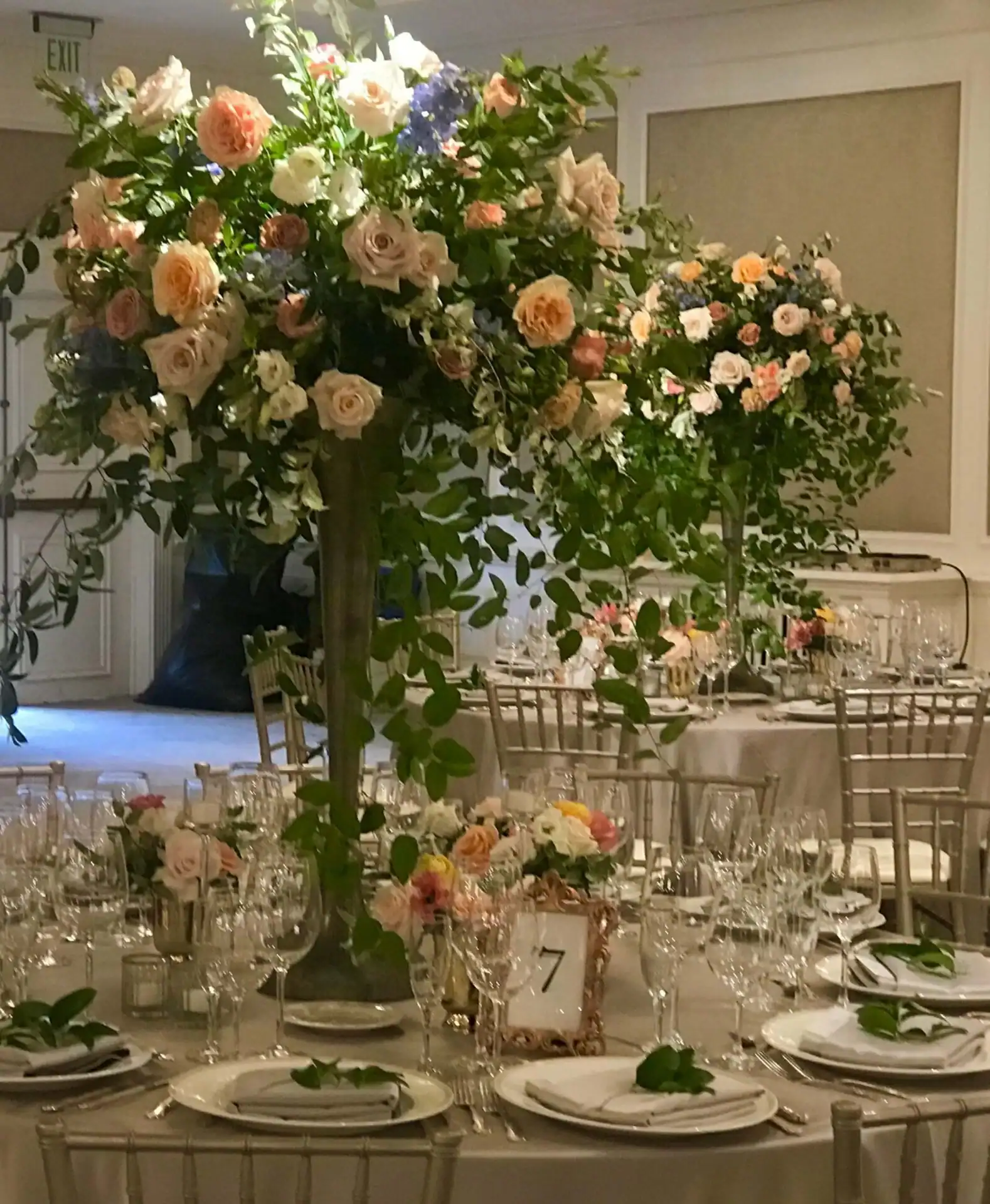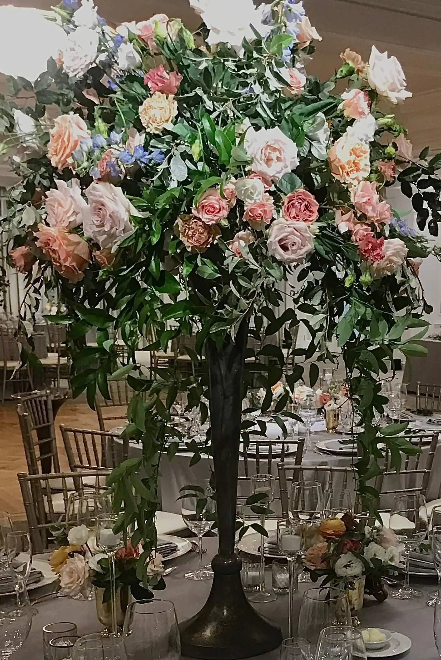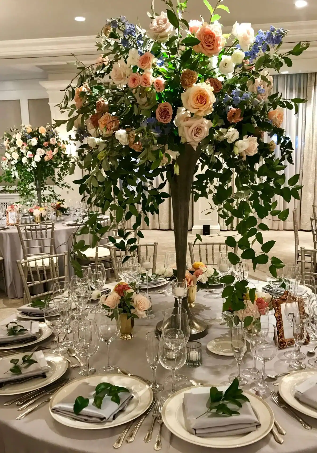 The reception warmly embraced a vintage aesthetic, where neutral linens and pewter floral vases created an inviting atmosphere. The delicate pastel florals gracefully complemented the ballroom’s elegance, ensuring a welcoming and charming celebration for all.