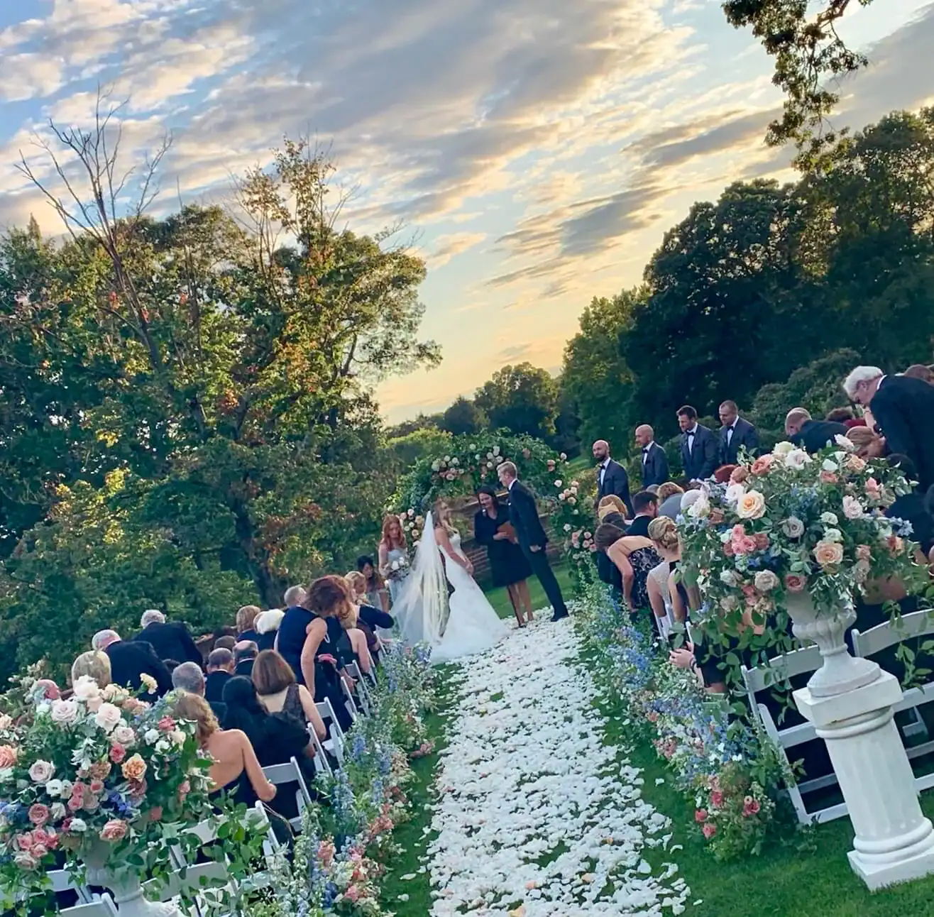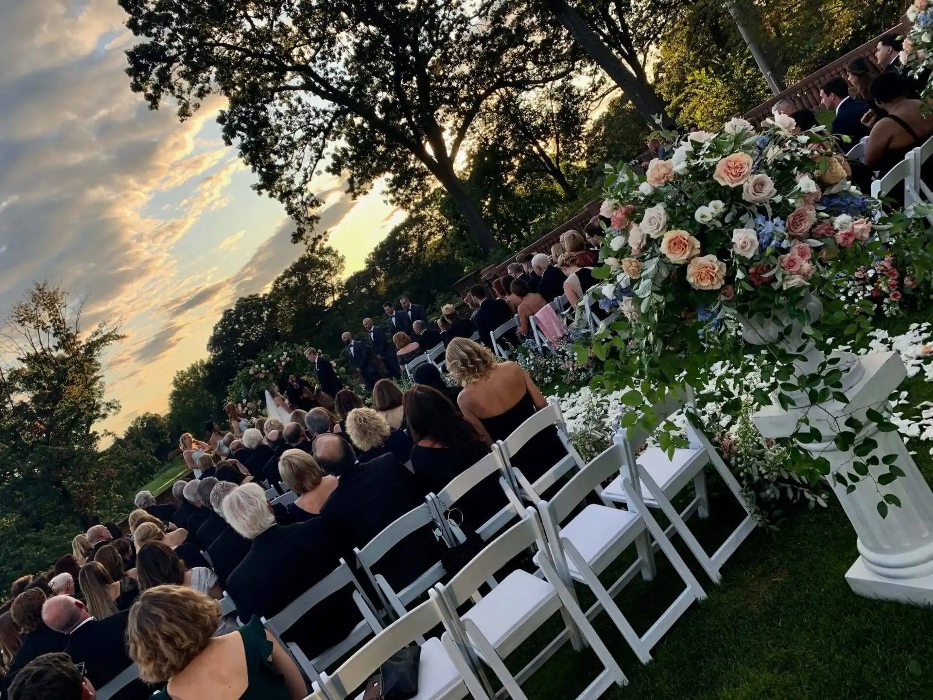 In the warmth of summer, it is always wonderful to find a venue that can offer not only a beautiful ballroom but an outside area that can be used for the ceremony. Debbie Hart and her team of coordinators knew that this country club could offer all the above for an enchanting setting. Well-tended lush gardens and expansive green lawns provide a genuine backdrop for a heartfelt celebration. As the sun set, the bride and groom exchange vows, surrounded by the authentic beauty of nature. The sky, in its honest transition, painted a realistic and breathtaking display of colors, adding a touch of genuine magic to their special moment.