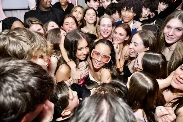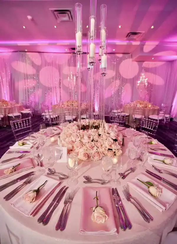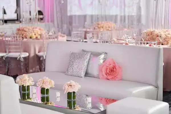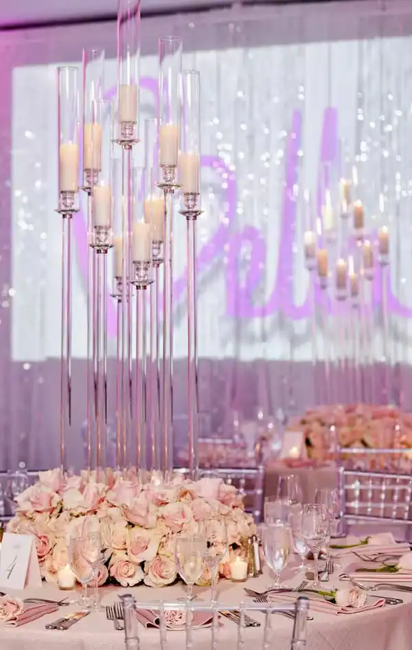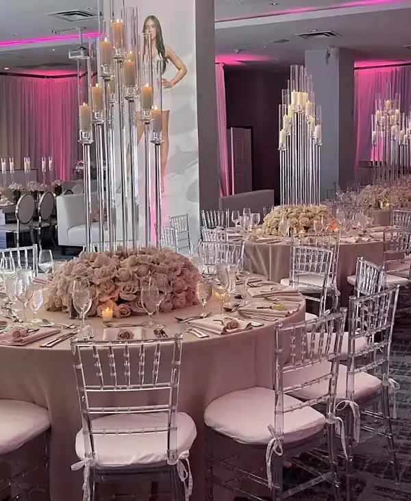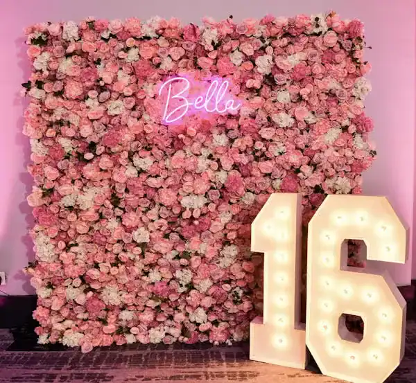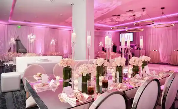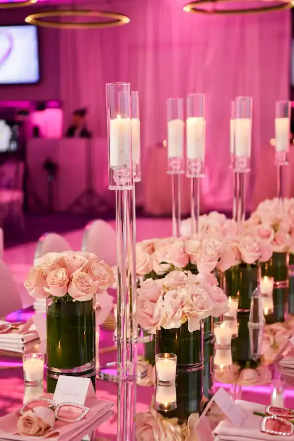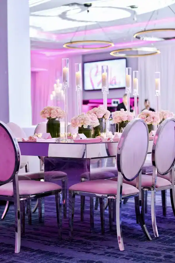 Debbie Hart Celebrations crafted a sophisticated yet youthful Sweet Sixteen, with pink as the primary color and roses adorning the venue. The entrance featured a captivating photo of the guest of honor: a silver sequin escort table with pink flowers, and a flower wall with a neon sign for selfies. The white-draped walls, crystal beading, and pink uplights created a club-like atmosphere while maintaining an elegant touch. Clear acrylic candelabras highlighted the beauty of pale pink roses on the tables. The night elevated with a surprise appearance of LED robots for dancing and photos, concluding with a Crumbl Cookies kiosk for delightful treats. It was a night of true delight.