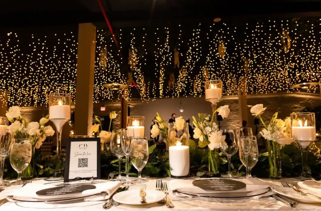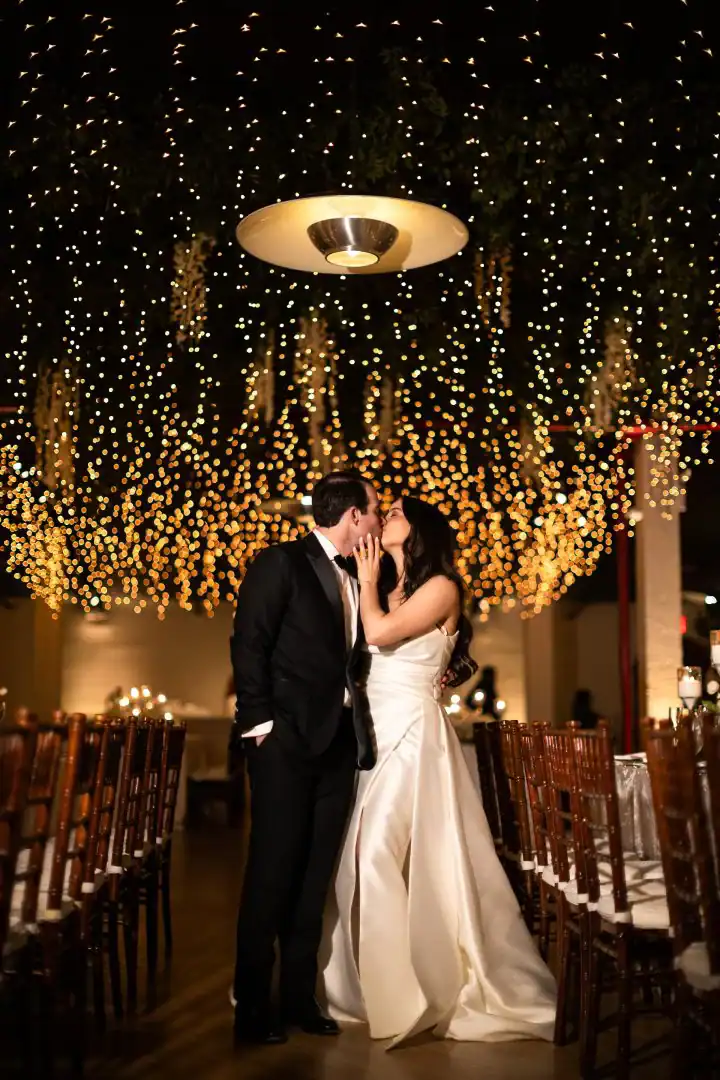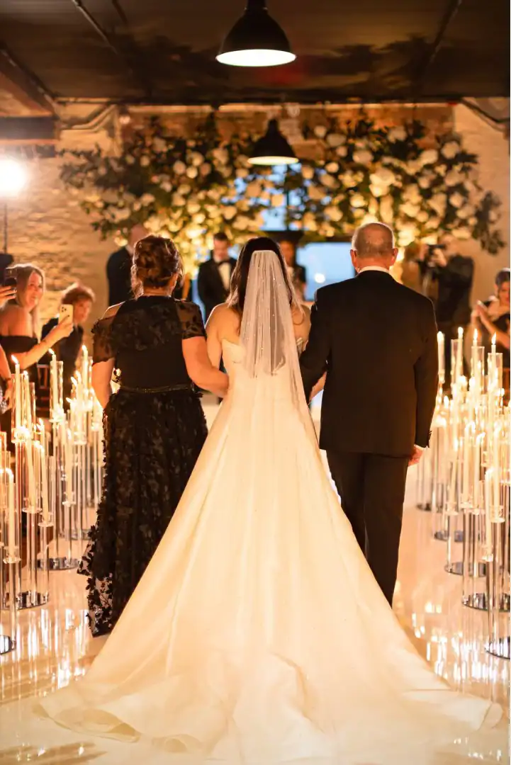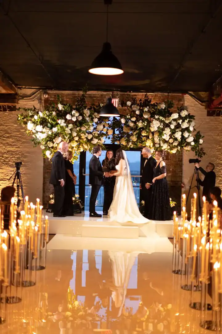 Creating this beautiful winter wedding brought together warmth, style, and romance. The bride and groom loved the industrial-chic feel of a warehouse, so Liberty Warehouse was the perfect venue. The exposed brick and wooden floors became key design elements, embraced to enhance the overall aesthetic. For the ceremony, honoring both of the couple’s cultural backgrounds, we reimagined the traditional chuppah. Two oversized floral trees were placed on either side, their branches gently intertwining at the top. A 50-foot white acrylic runway and stage reflected the glow of candles lining the aisle, creating a magical, luminous pathway. After the ceremony, guests enjoyed a variety of stations, passed hors d’oeuvres, and signature cocktail drinks at the bar. As cocktail hour ended, they were invited upstairs to admire breathtaking views of the harbor and the Statue of Liberty. Long king’s tables were adorned with lush floral vessels and flickering candles, while round tables featured tree-like structures draped in complementary linens, with tea lights hanging from the branches. Above the dance floor, hundreds of twinkle lights captured the essence of romance and beauty, completing the magical atmosphere.