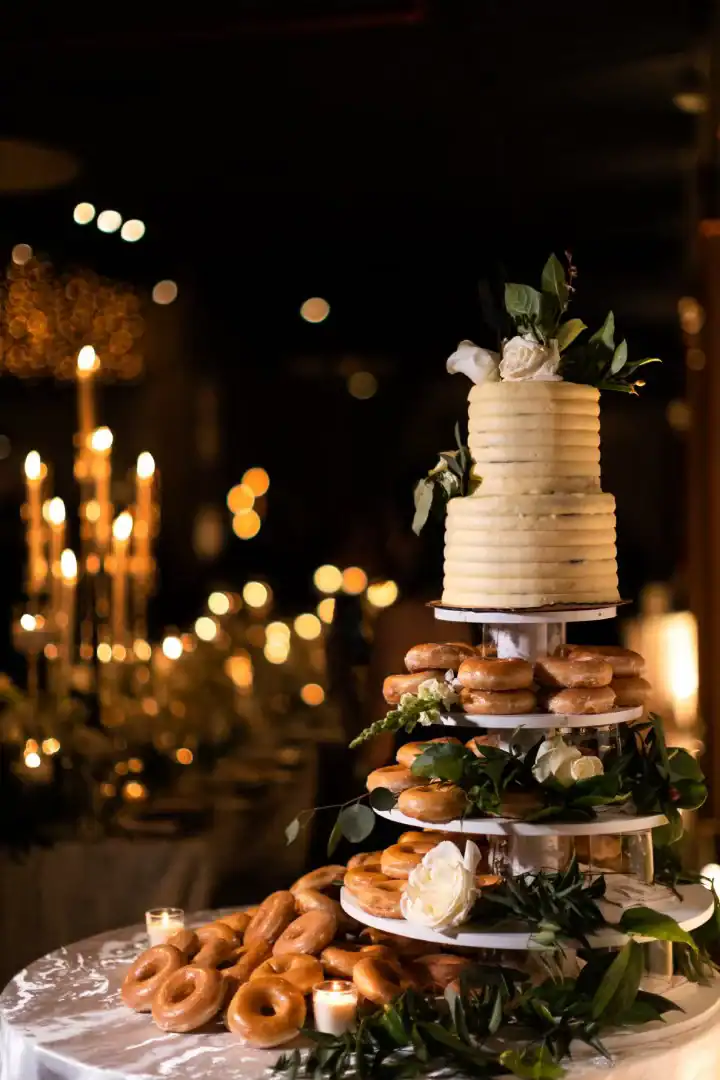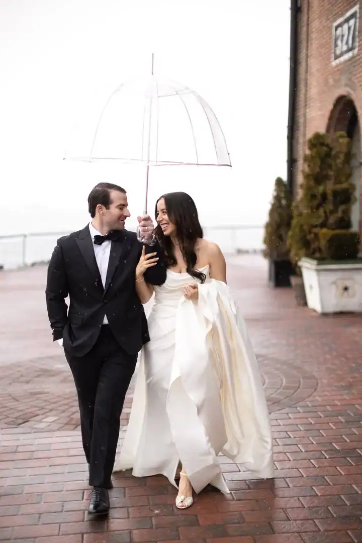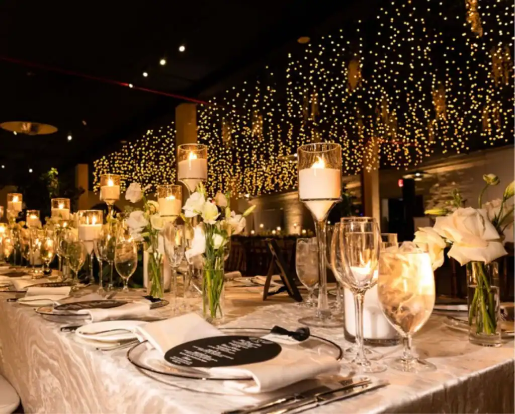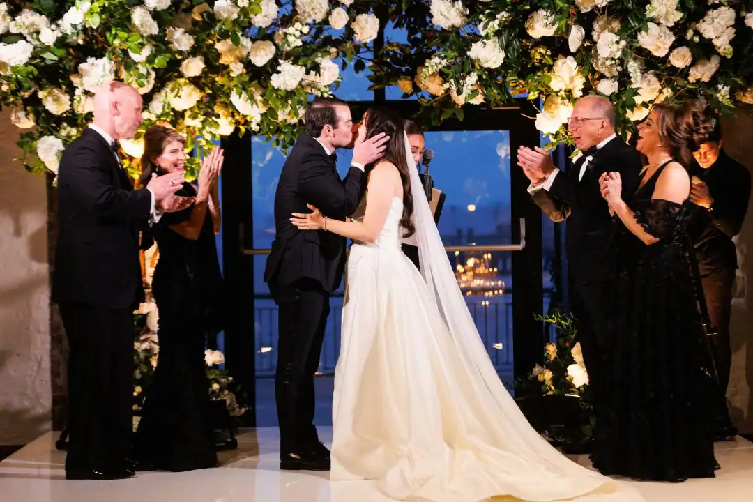 Creating this beautiful winter wedding brought together warmth, style, and romance. The bride and groom loved the industrial-chic feel of a warehouse, so Liberty Warehouse was the perfect venue. The exposed brick and wooden floors became key design elements, embraced to enhance the overall aesthetic. For the ceremony, honoring both of the couple’s cultural backgrounds, we reimagined the traditional chuppah. Two oversized floral trees were placed on either side, their branches gently intertwining at the top. A 50-foot white acrylic runway and stage reflected the glow of candles lining the aisle, creating a magical, luminous pathway. After the ceremony, guests enjoyed a variety of stations, passed hors d’oeuvres, and signature cocktail drinks at the bar. As cocktail hour ended, they were invited upstairs to admire breathtaking views of the harbor and the Statue of Liberty. Long king’s tables were adorned with lush floral vessels and flickering candles, while round tables featured tree-like structures draped in complementary linens, with tea lights hanging from the branches. Above the dance floor, hundreds of twinkle lights captured the essence of romance and beauty, completing the magical atmosphere.
