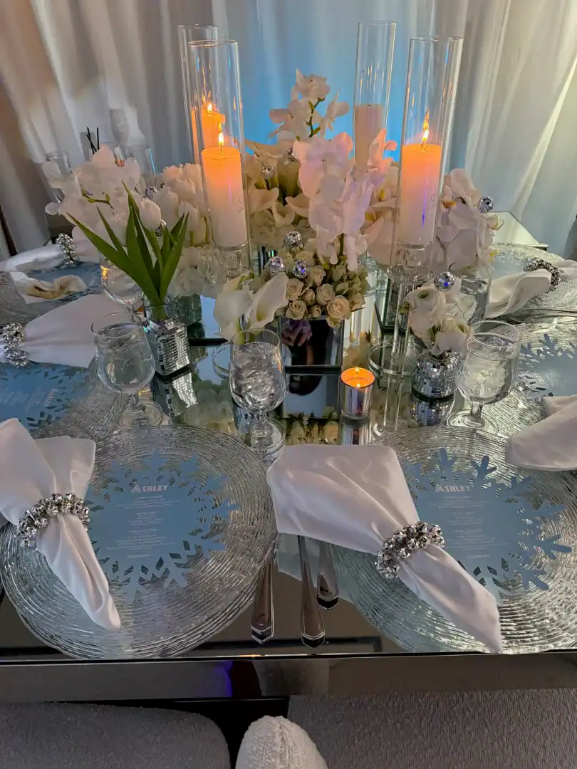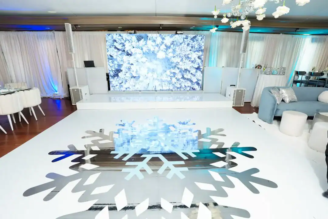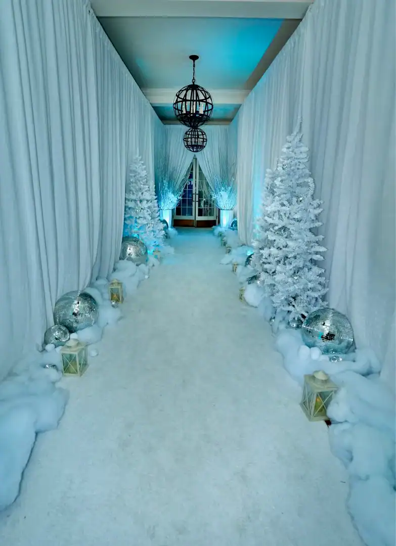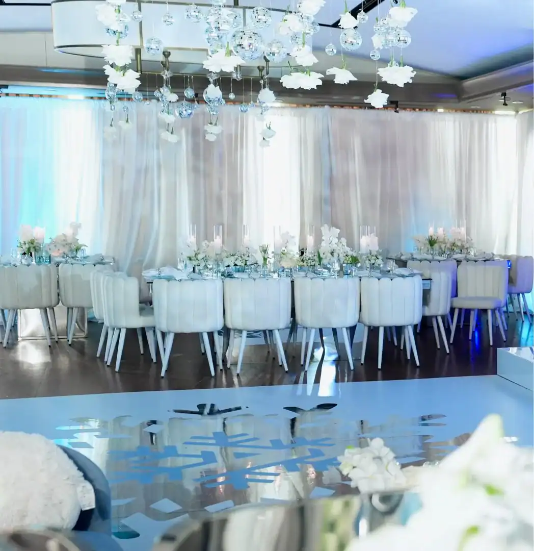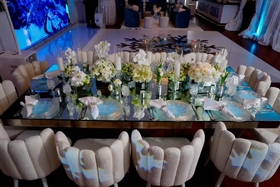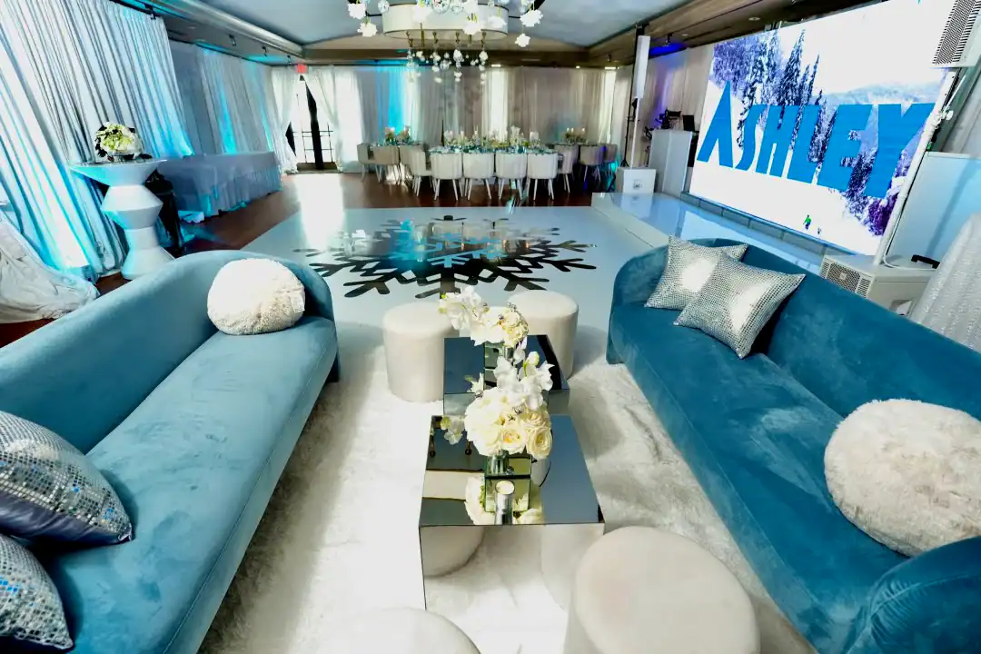 Even though winter events often lean into the traditional snowy vibe, this mitzvah girl who loved skiing and winter adventures wanted her celebration to be EXTRA glamorous. In a smaller, intimate venue, Debbie & Richie Hart, along with their team; transformed the space into a sleek, luxurious winter wonderland. Right from the start, guests were enveloped in the theme. In the hallway, 50 feet of sumptuous white velvet drape set a sophisticated tone, while a pristine white carpet walkway accentuated with white trees, glimmering disco balls, snow branches, and carefully placed lighting guided the way. A strategically positioned snow machine added a playful touch, giving everyone a sprinkle of winter magic as they arrived. As guests strolled along the path, costumed models in furry white outfits greeted them with signature cocktails. Upon opening the French doors, the ballroom revealed its dramatic transformation; walls draped in white velvet, bathed in a palette of crisp whites, soft light “icey”blues, and mirrored accents. Disco balls hung from the chandeliers, casting just the right amount of twinkle to elevate the space. For the adult tables, Debbie envisioned a comfortable yet elegant setup. White buclay chairs and mirror tables allowed each centerpiece to reflect the intricate details, creating a warm and inviting atmosphere. The dance floor was a showstopper. A three-layered design featuring a white background, a mirrored snowflake pattern, and, atop it all, the guest of honor’s initial from her name illuminated in bright blue. In every detail, the celebration achieved the perfect balance of cozy intimacy and glamorous sophistication. A truly unforgettable celebration blending elegant designs with playful touches for the winter season.