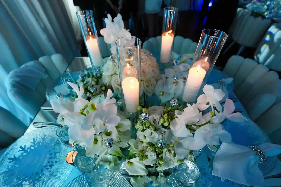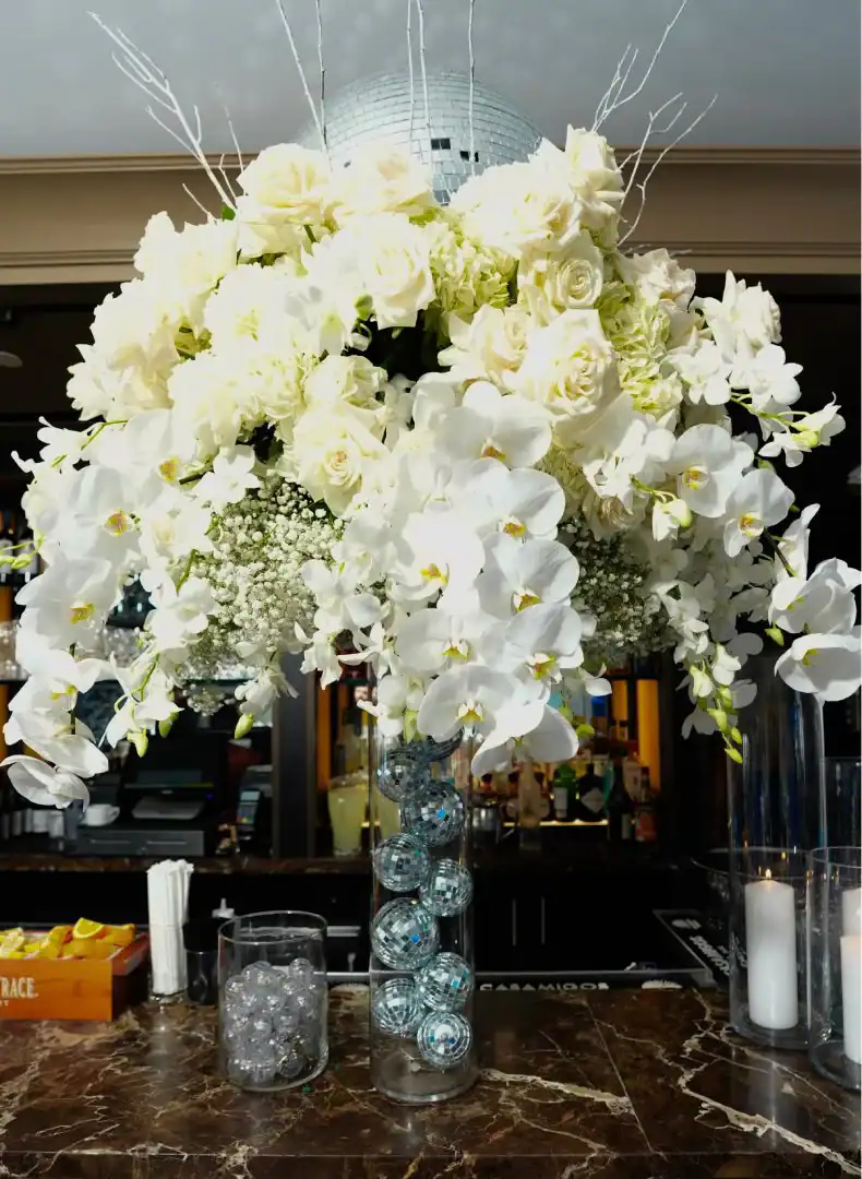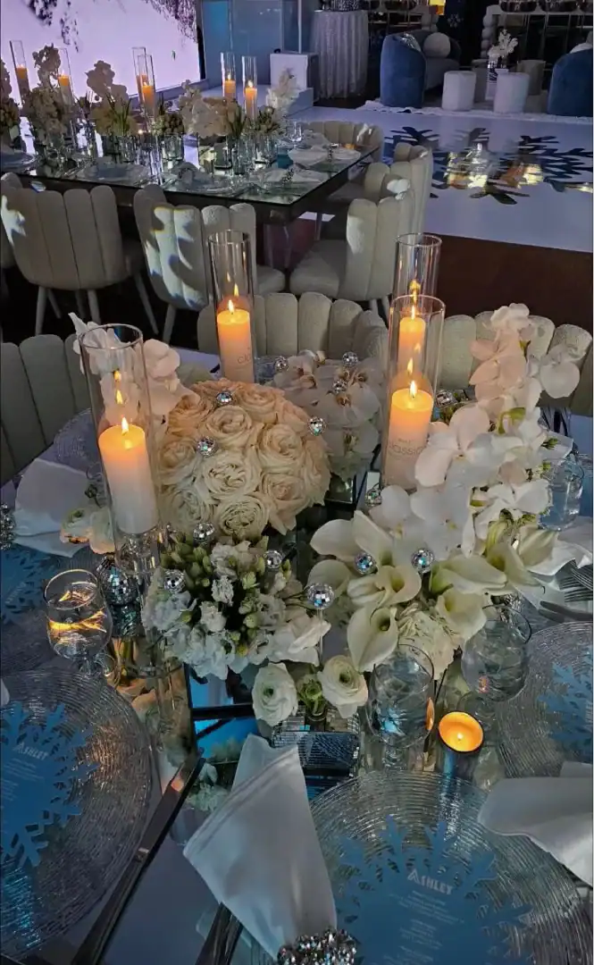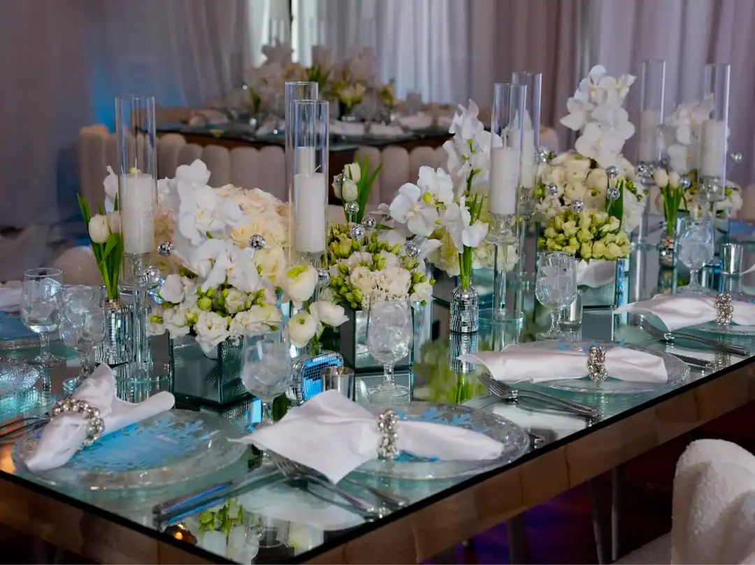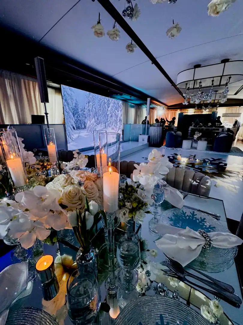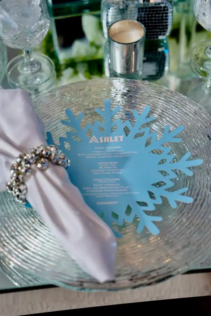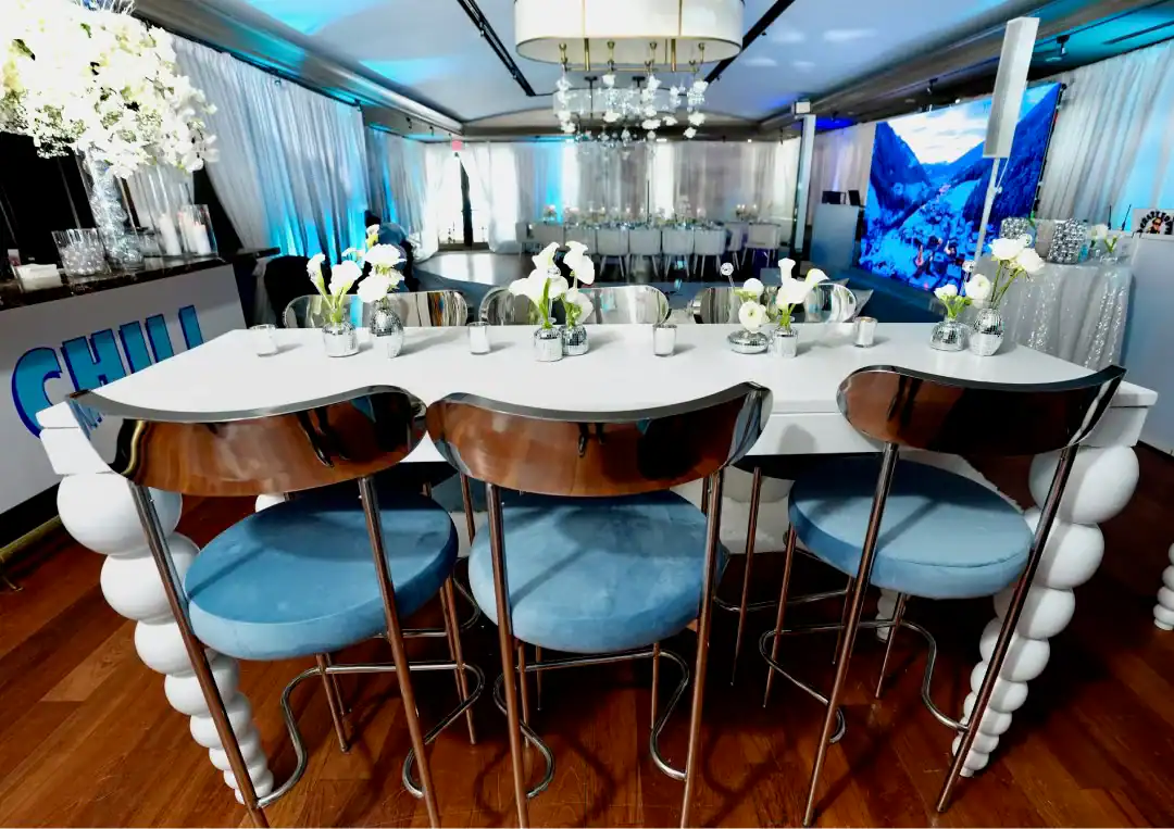Even though winter events often lean into the traditional snowy vibe, this mitzvah girl who loved skiing and winter adventures wanted her celebration to be EXTRA glamorous. In a smaller, intimate venue, Debbie & Richie Hart, along with their team; transformed the space into a sleek, luxurious winter wonderland. Right from the start, guests were enveloped in the theme. In the hallway, 50 feet of sumptuous white velvet drape set a sophisticated tone, while a pristine white carpet walkway accentuated with white trees, glimmering disco balls, snow branches, and carefully placed lighting guided the way. A strategically positioned snow machine added a playful touch, giving everyone a sprinkle of winter magic as they arrived. As guests strolled along the path, costumed models in furry white outfits greeted them with signature cocktails. Upon opening the French doors, the ballroom revealed its dramatic transformation; walls draped in white velvet, bathed in a palette of crisp whites, soft light “icey”blues, and mirrored accents. Disco balls hung from the chandeliers, casting just the right amount of twinkle to elevate the space. For the adult tables, Debbie envisioned a comfortable yet elegant setup. White buclay chairs and mirror tables allowed each centerpiece to reflect the intricate details, creating a warm and inviting atmosphere. The dance floor was a showstopper. A three-layered design featuring a white background, a mirrored snowflake pattern, and, atop it all, the guest of honor’s initial from her name illuminated in bright blue. In every detail, the celebration achieved the perfect balance of cozy intimacy and glamorous sophistication. A truly unforgettable celebration blending elegant designs with playful touches for the winter season.