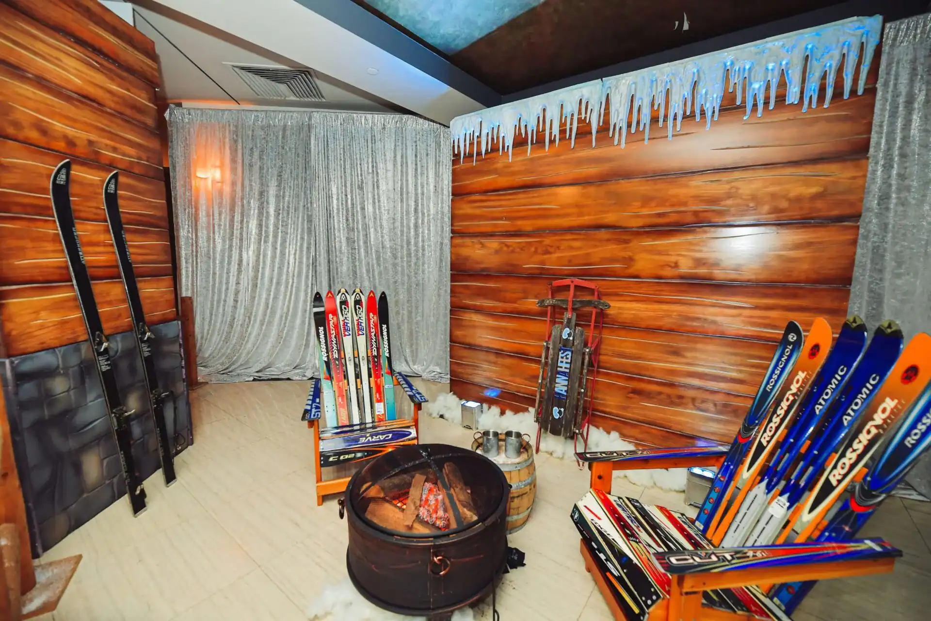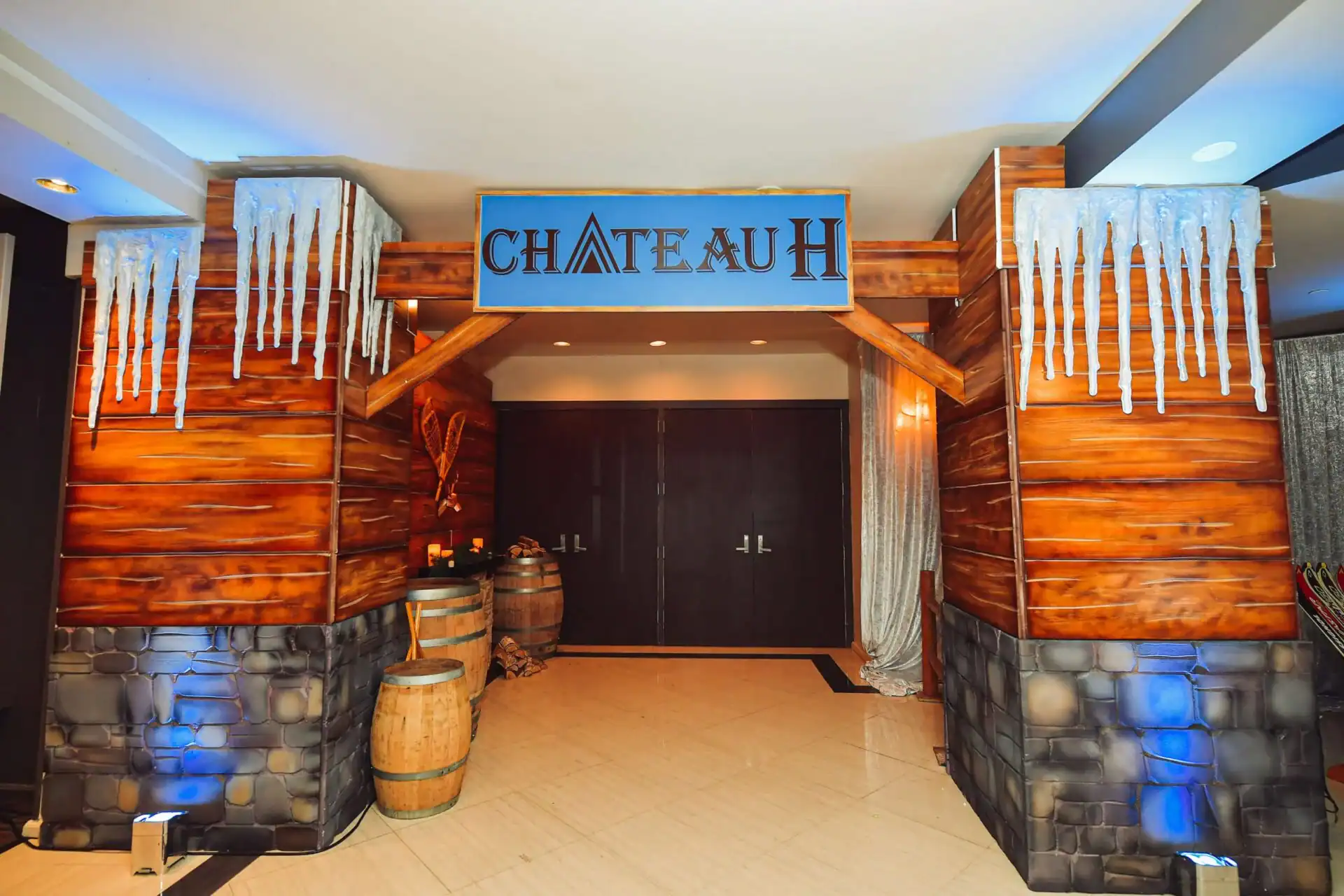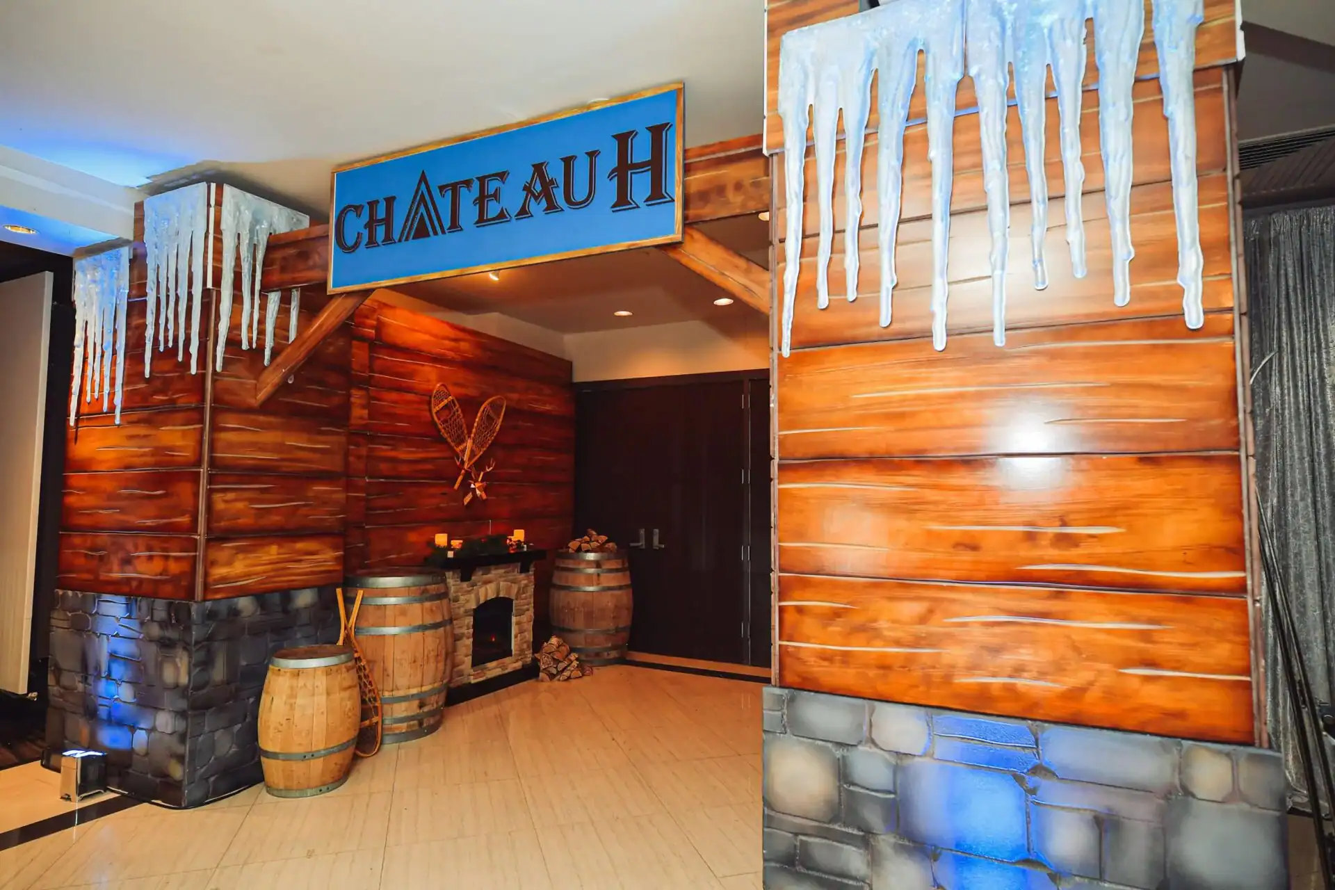 Embark on a winter wonderland journey with Debbie Hart’s team at this exquisite Ski Themed Bat Mitzvah hosted at the chateau. Imagine entering the venue and being transported from the slopes to the warm embrace of your own chateau. The entryway comes alive with carefully placed props, a cozy fireplace, and wood cabin buildouts, setting the stage for an elegant alpine experience.